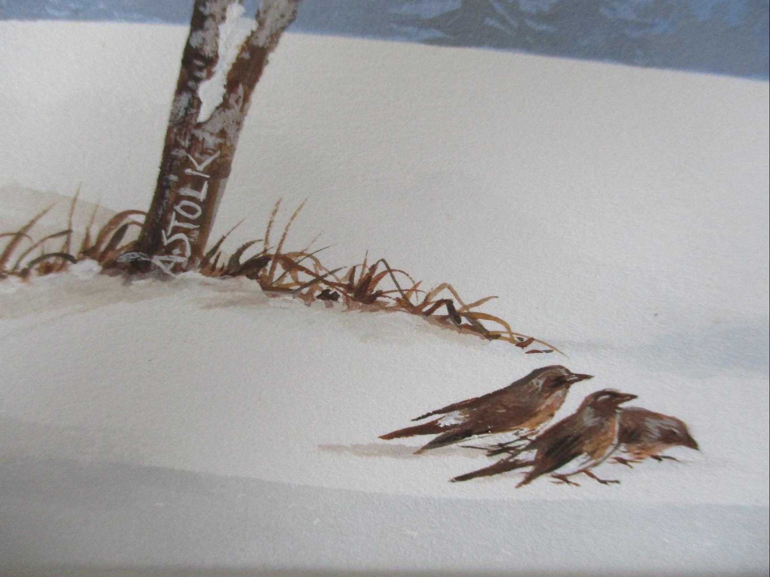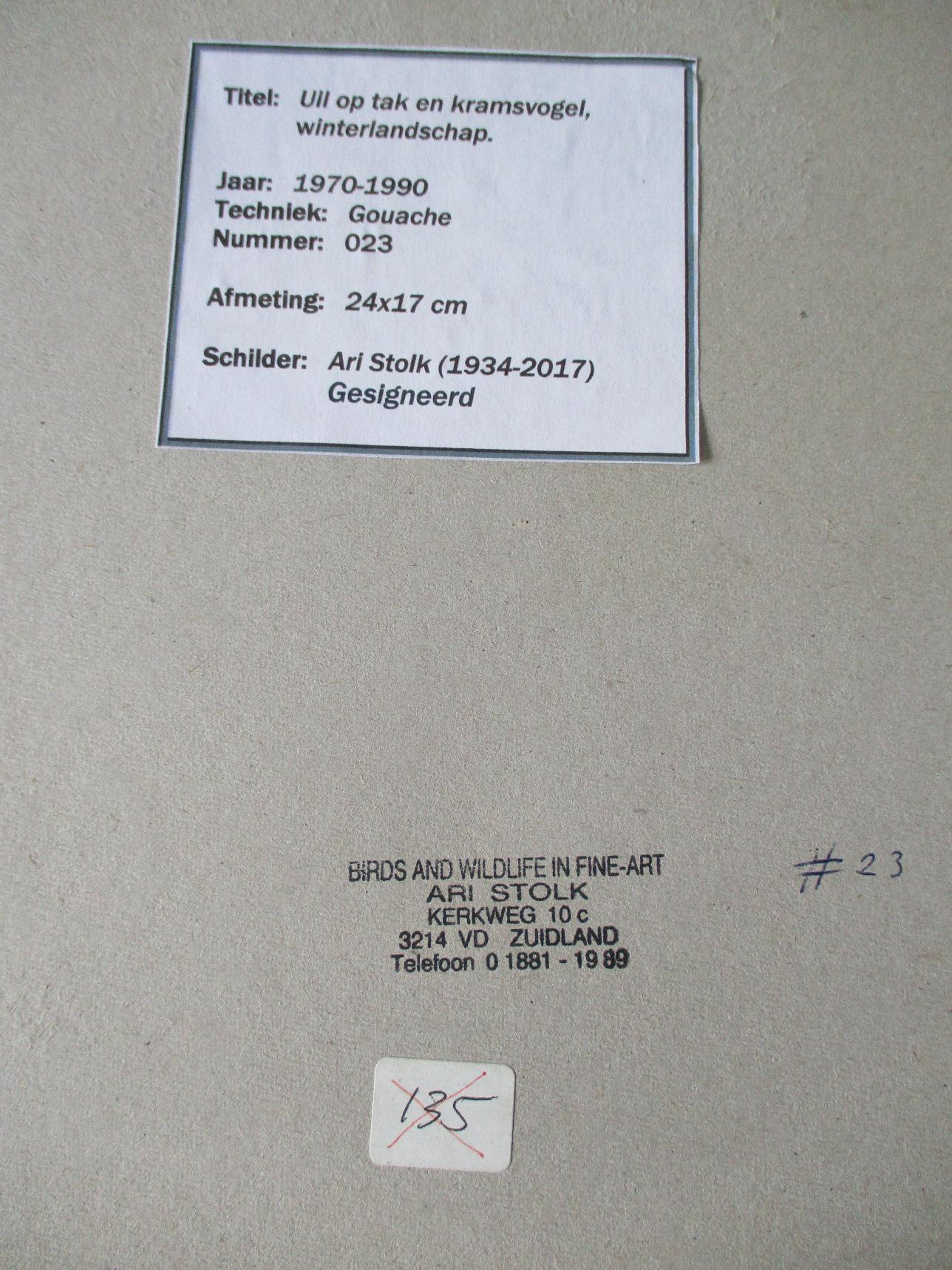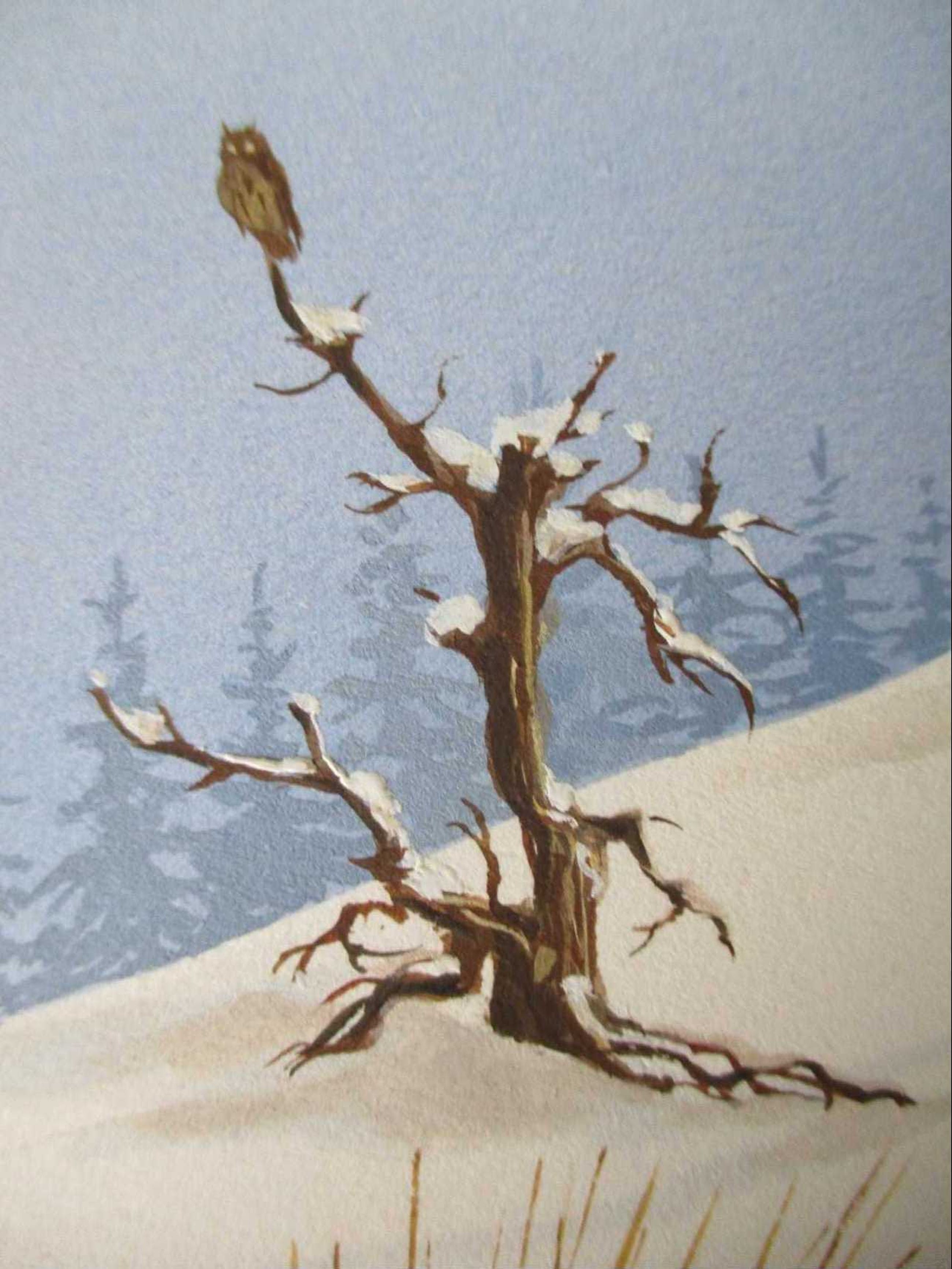 Uil op tak en kramsvogels in winterlandschap (1970-1990)