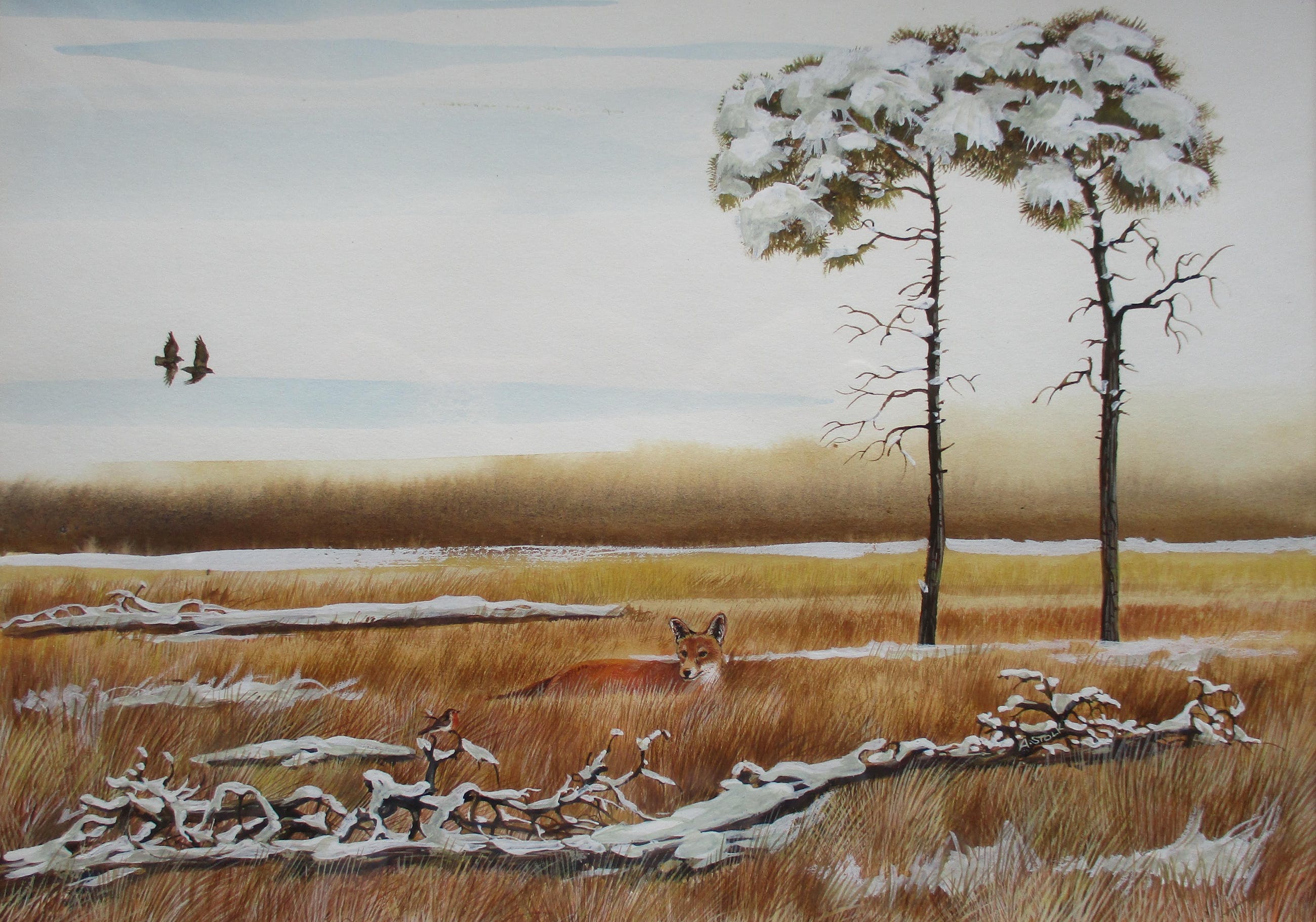 Vos en 2 vliegende fazanten in winterheide (1970-1990)