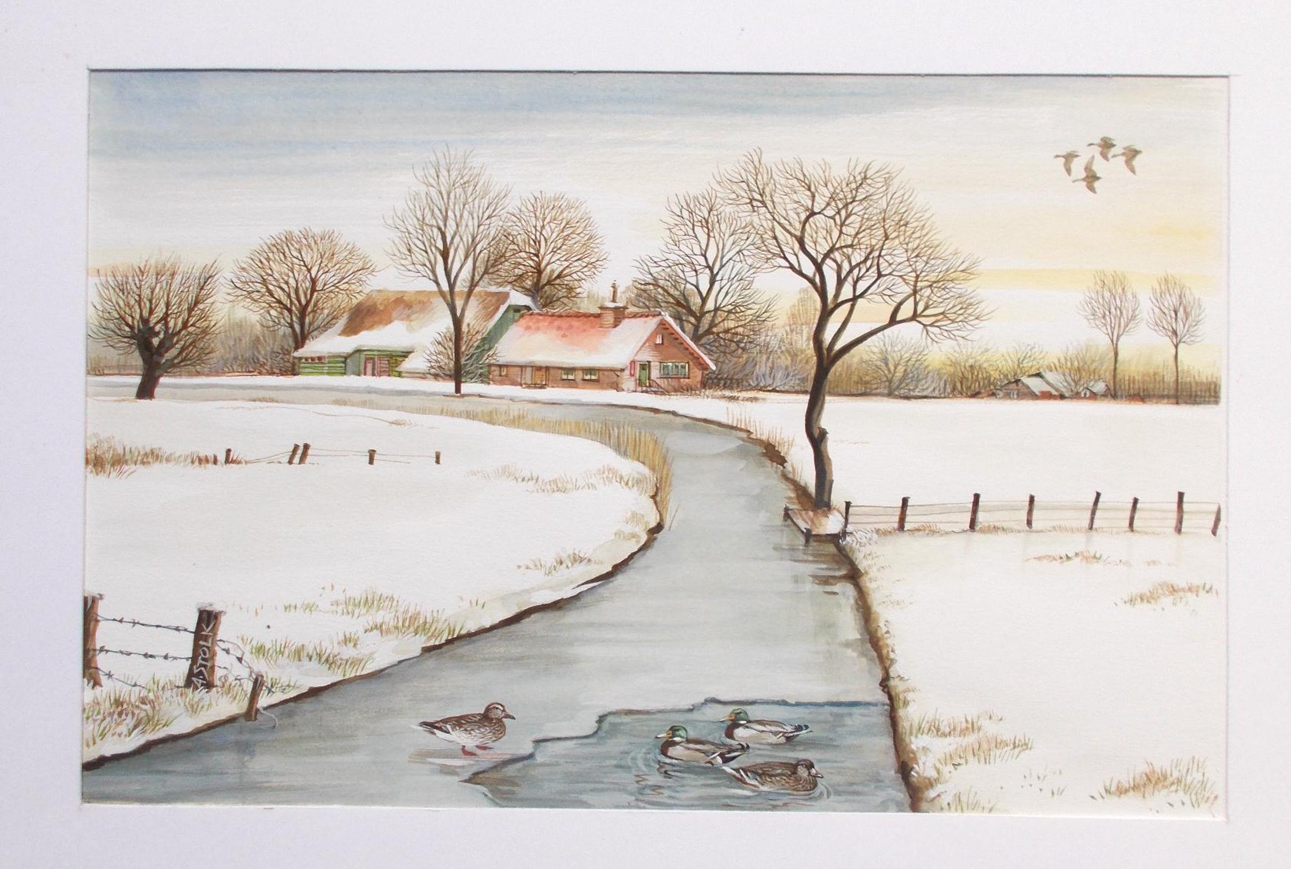 Winterlandschap boerderij, bevroren sloot en eenden - winterlandschap (1970-1990)