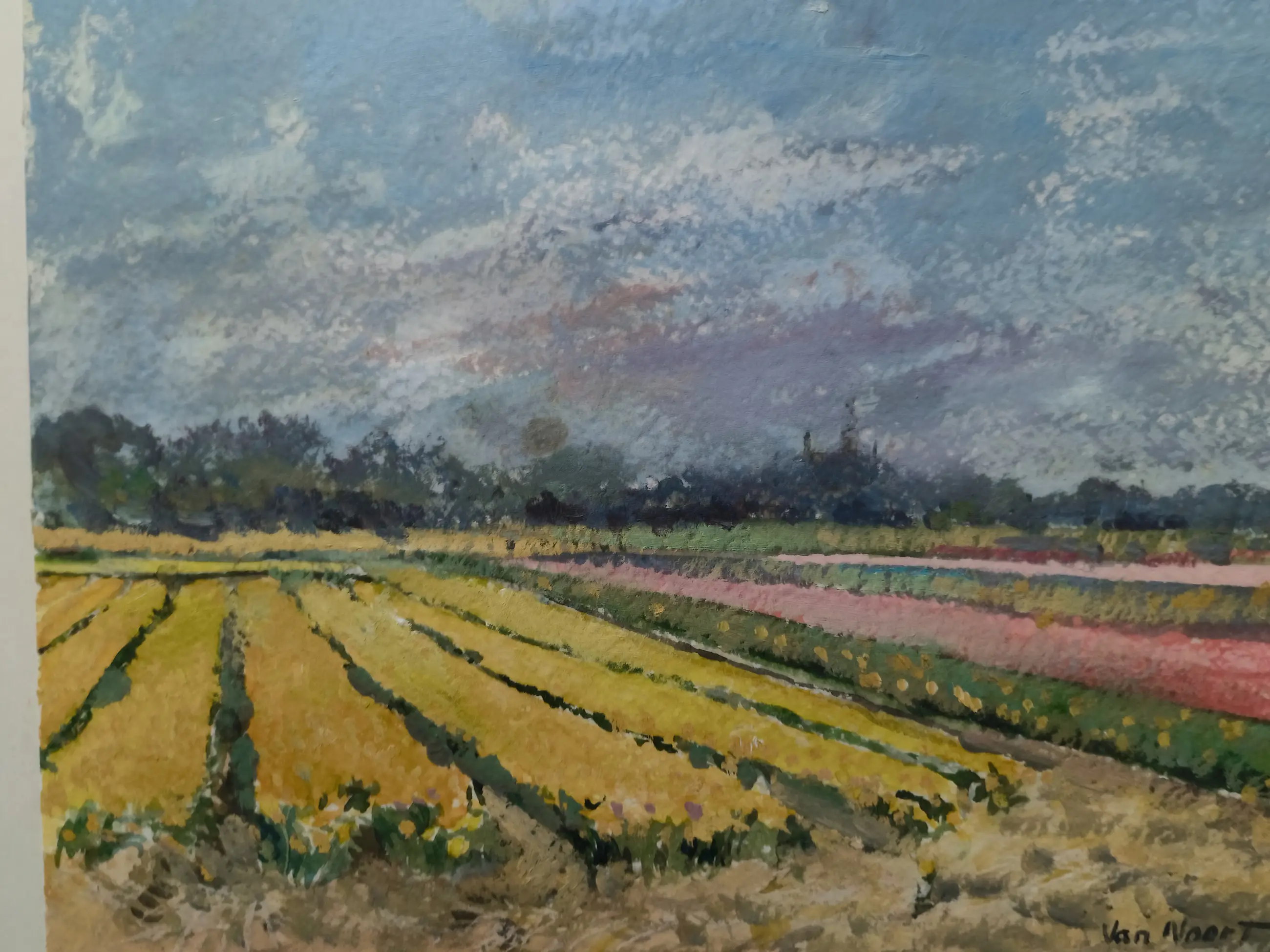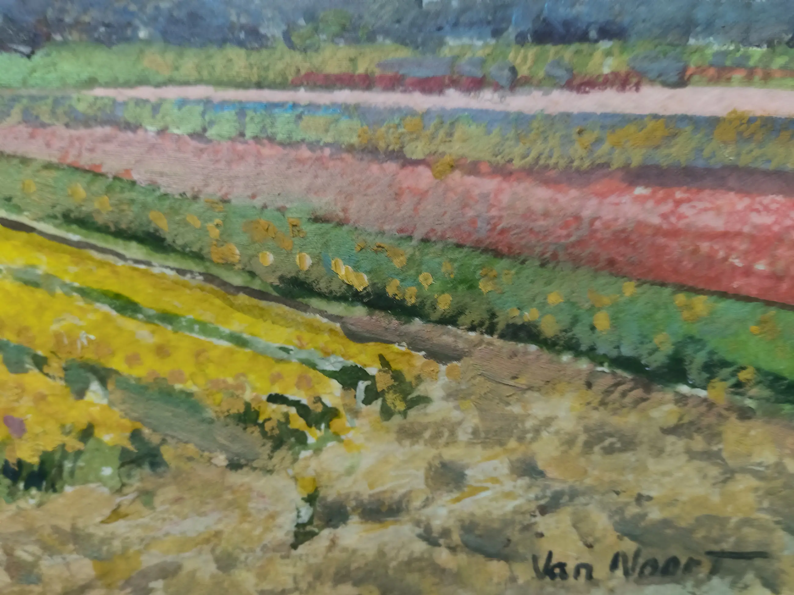 Arie Kees van Noort was een kunstenaar die sterk werd geïnspireerd door de Nederlandse bollenvelden. In zijn werk legde hij de kleurrijke strepen van tulpen en andere bloemen vast, vaak met veel aandacht voor licht en diepte.