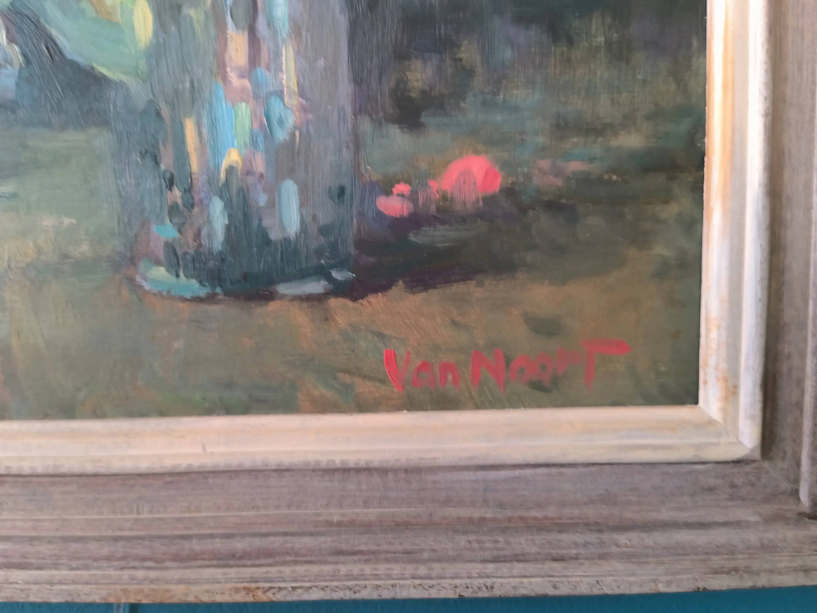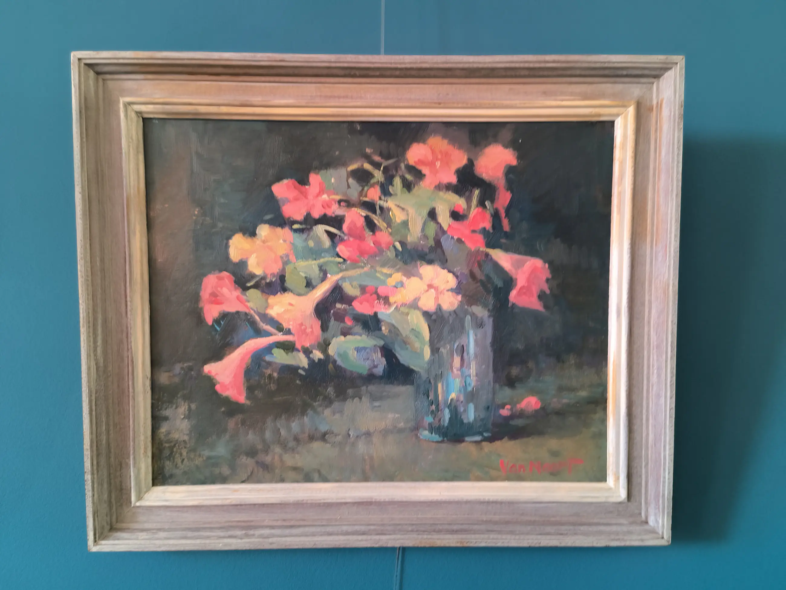 Zeer mooi werk door de bekende kunstenaar Arie Cees van Noort bloemen olieverf op paneel in zeer goede staat minimale sporen door leeftijd ouderdom kan zo aan de muur een pracht!