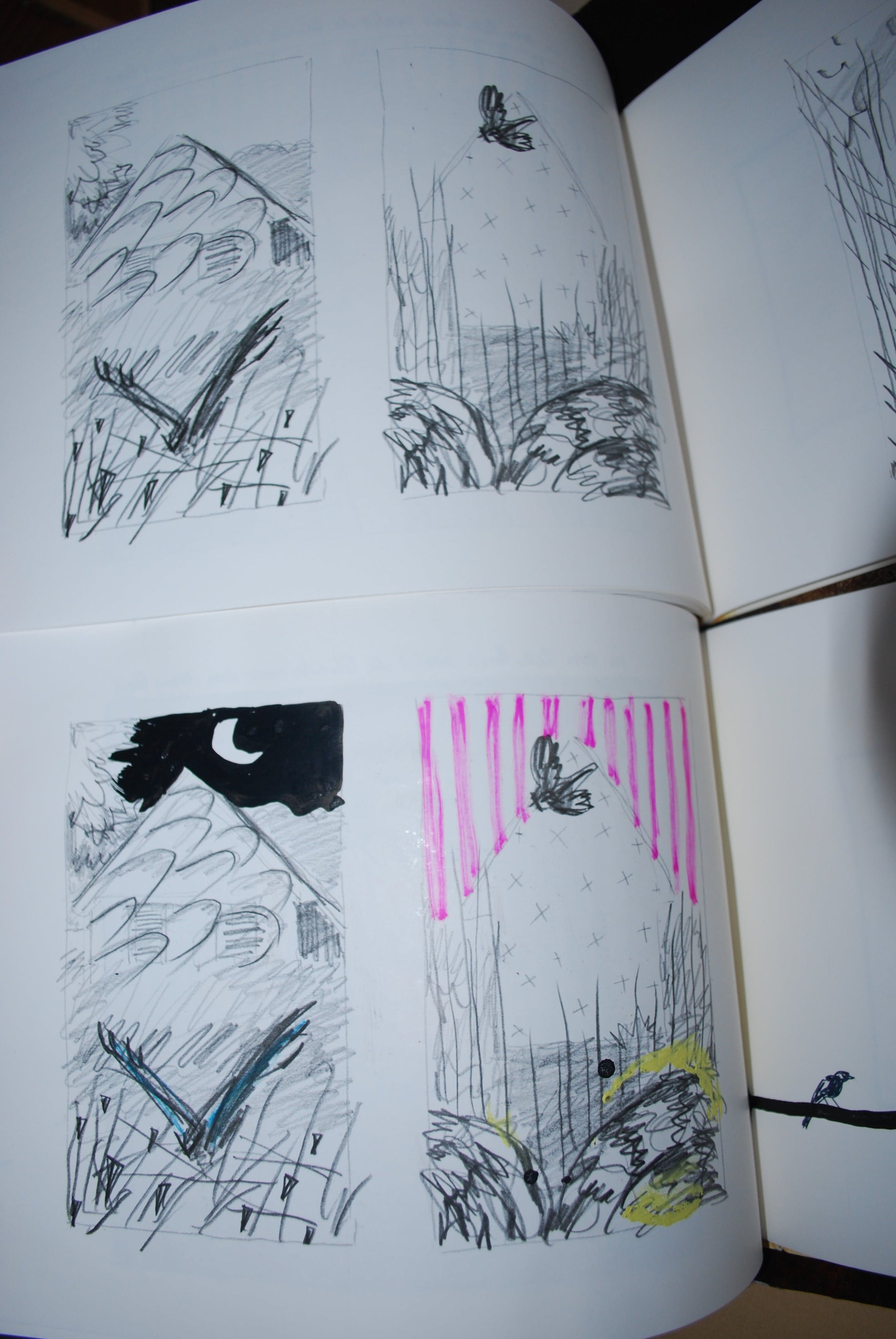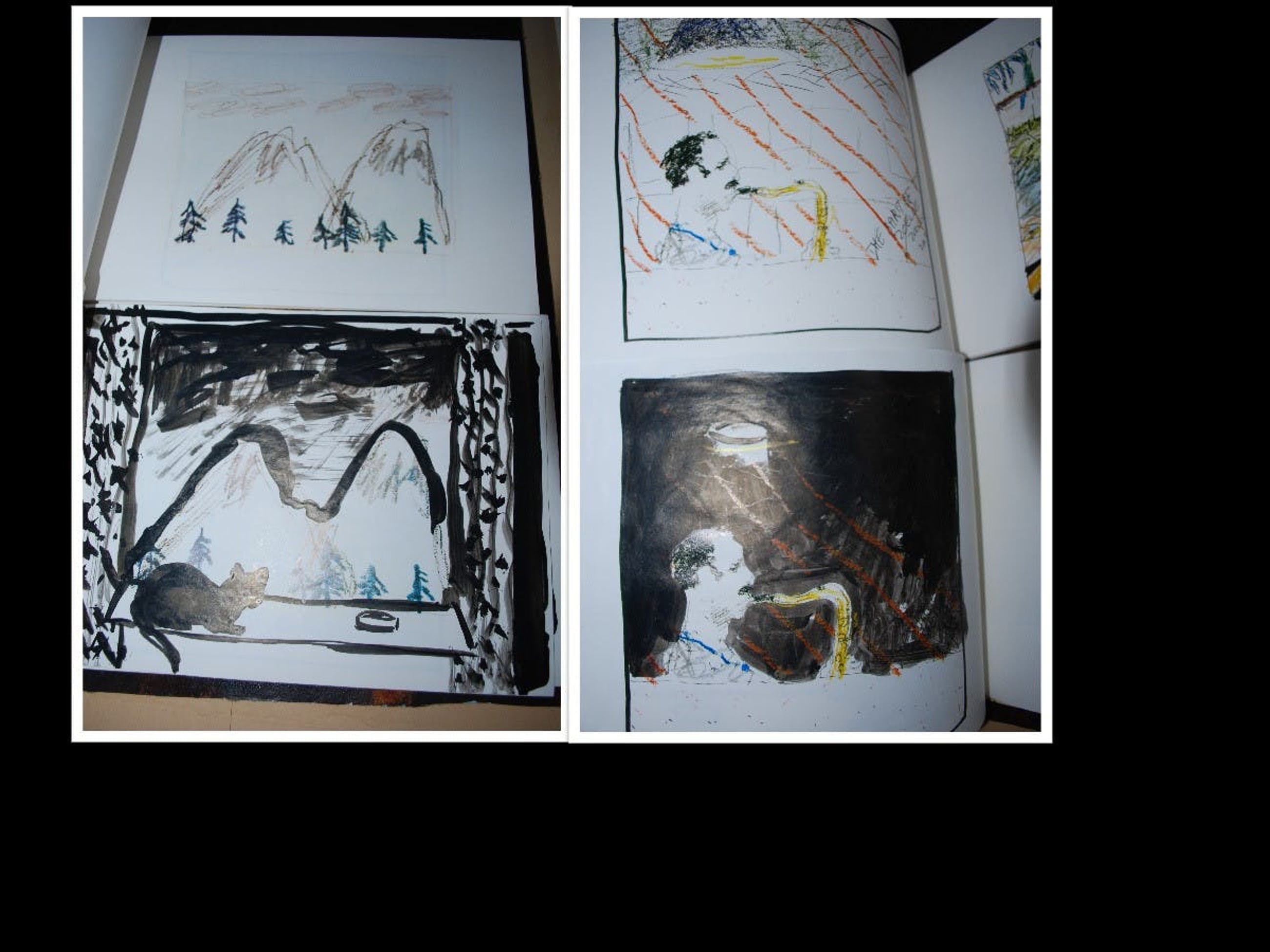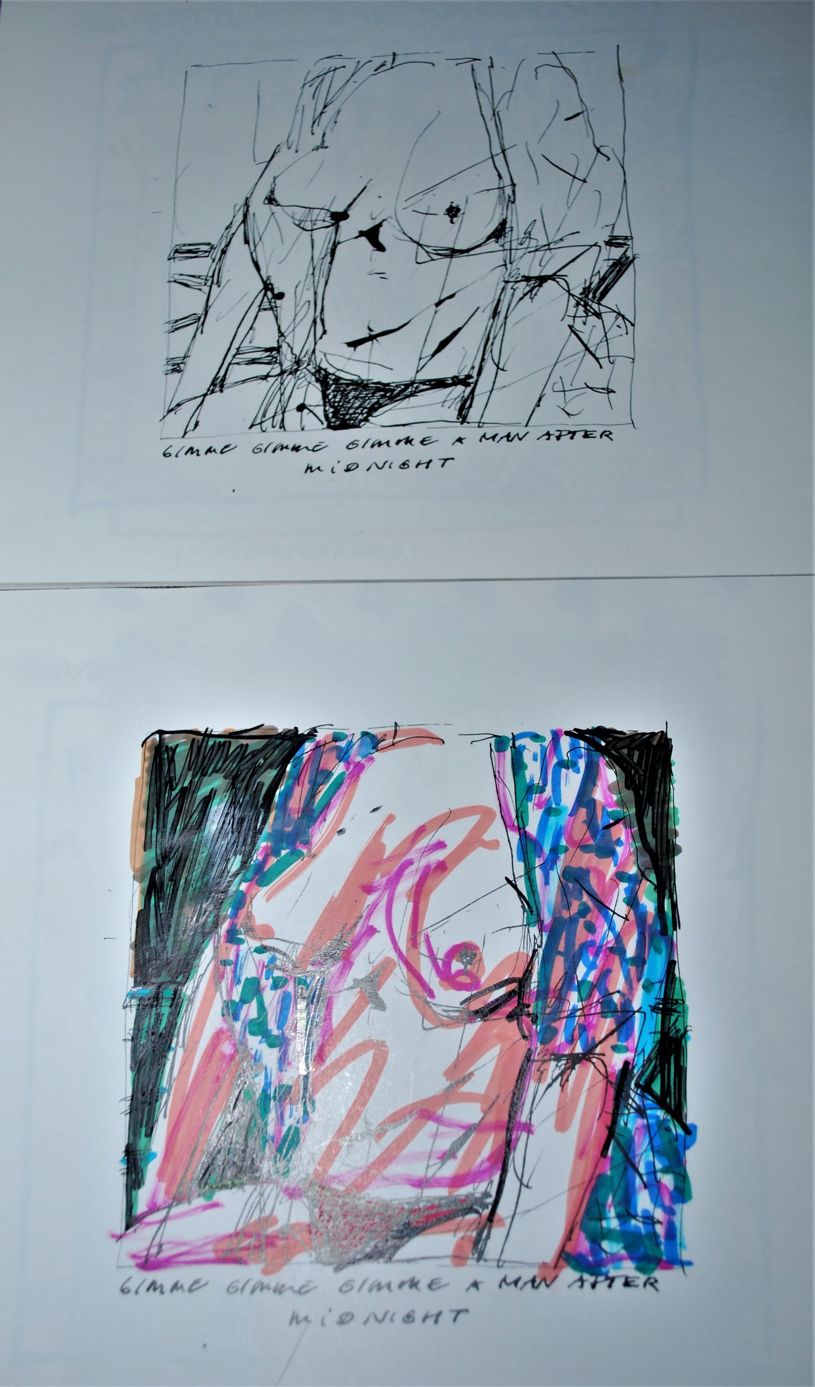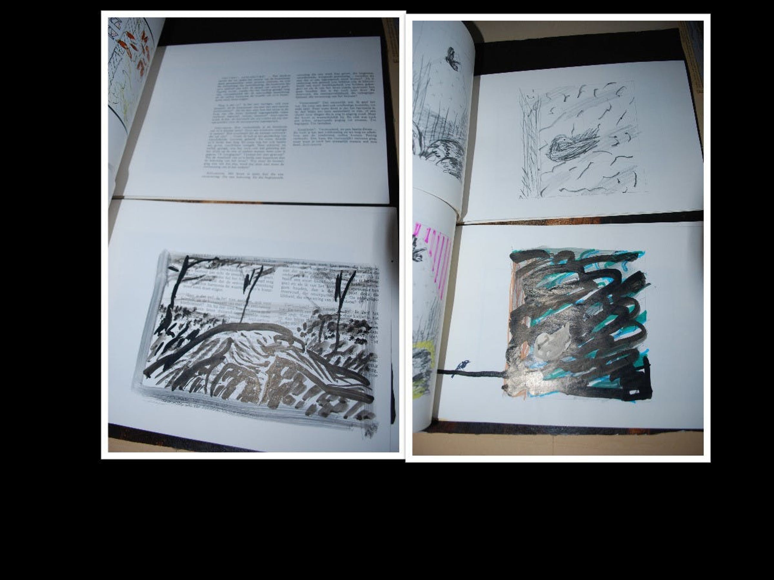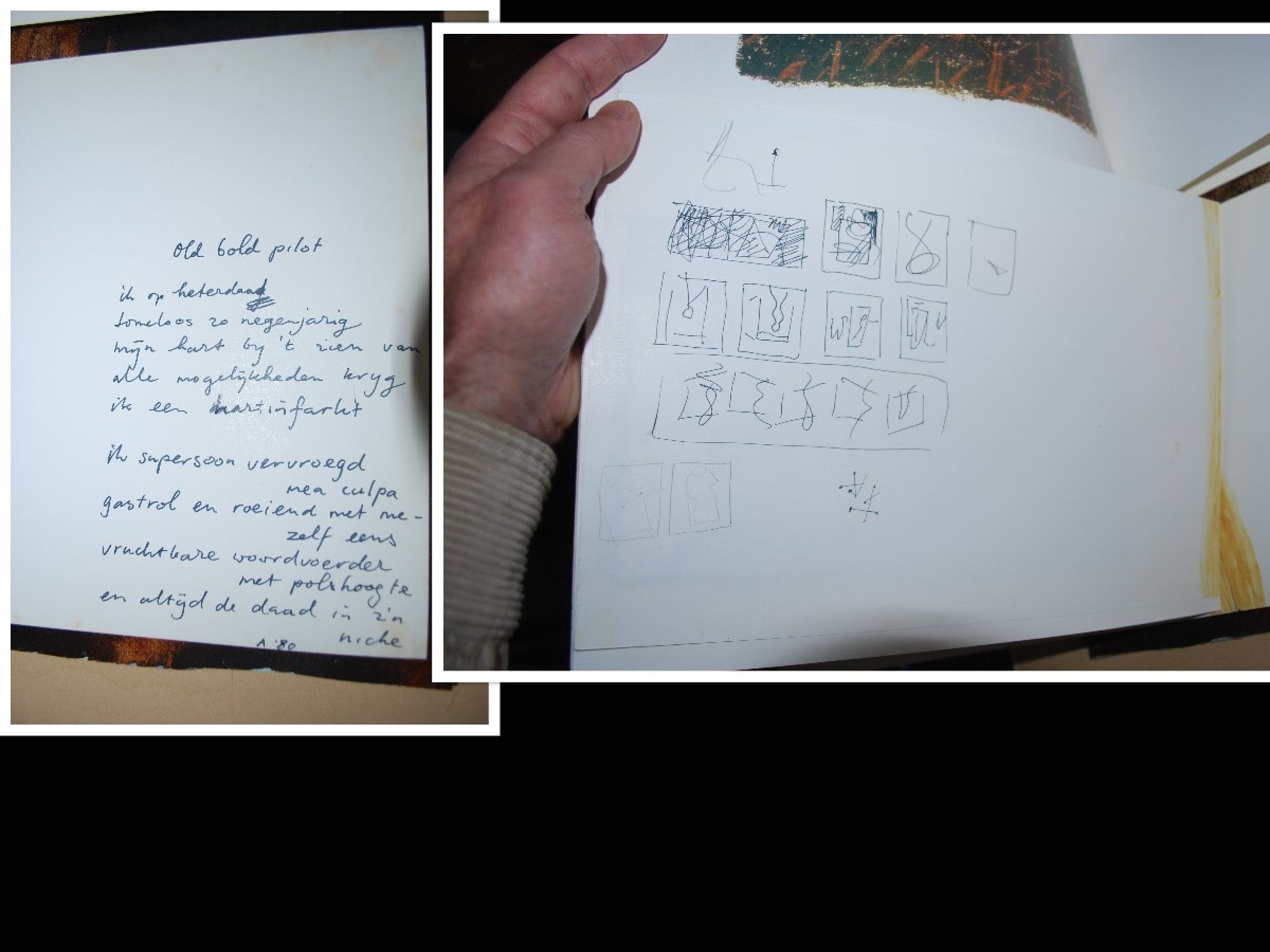 Het onderste deel van de foto's laat telkens het omgewerkte deel zien, de bovenkant de standaard catalogus. Daarbij een beschilderd krantenknipsel, een beschilderde envelop en de uitnodigingskaart vd expo.