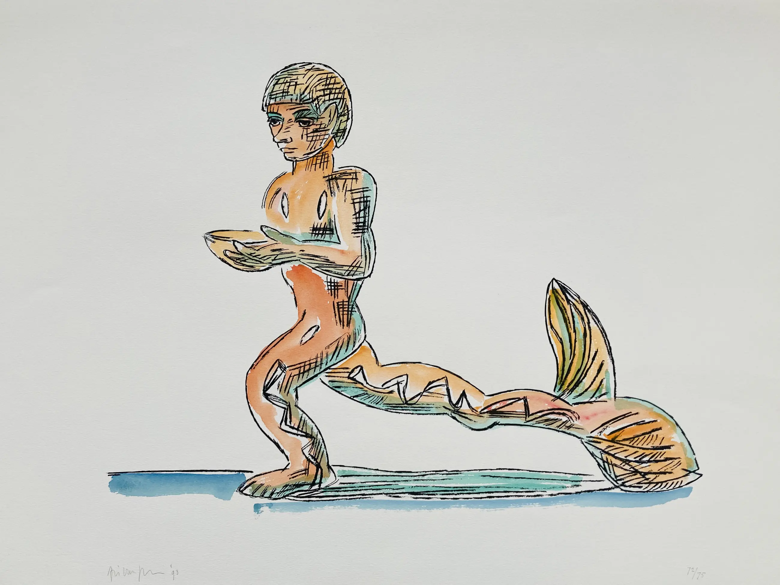 Een mooie zeefdruk, met aquarel hand ingekleurd van de Nederlandse kunstenaar Arie van Geest. Het werk verkeert in uitstekende conditie en is hand gesigneerd door de kunstenaar. Het werk kan zo ingelijst worden voor de liefhebber.