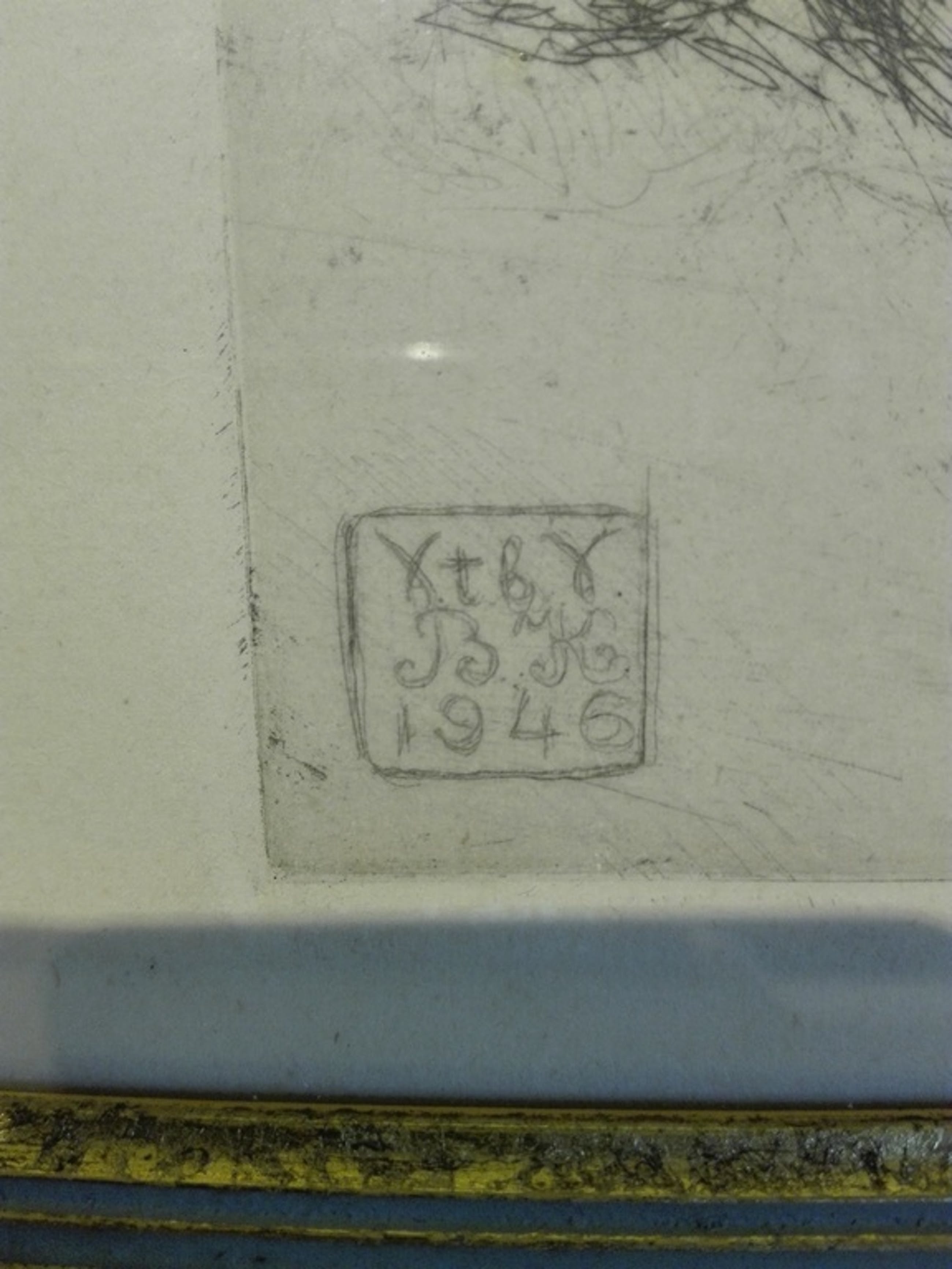 Mooie ets uit 1946, gesigneerd rechtsonder door Arie van Mever ( 1899-1978). Afmetingen beeld 27,5 bij 24 cm.