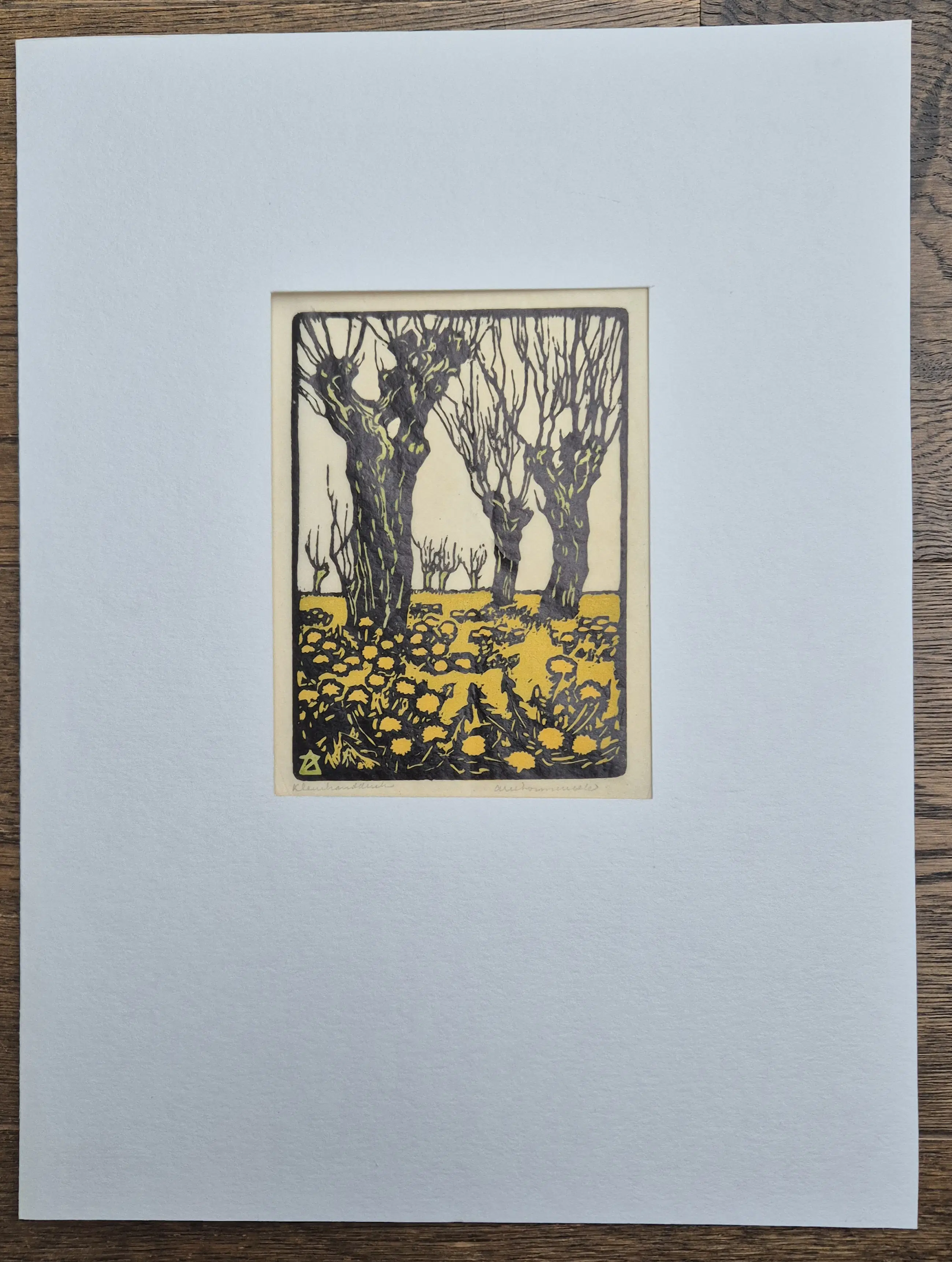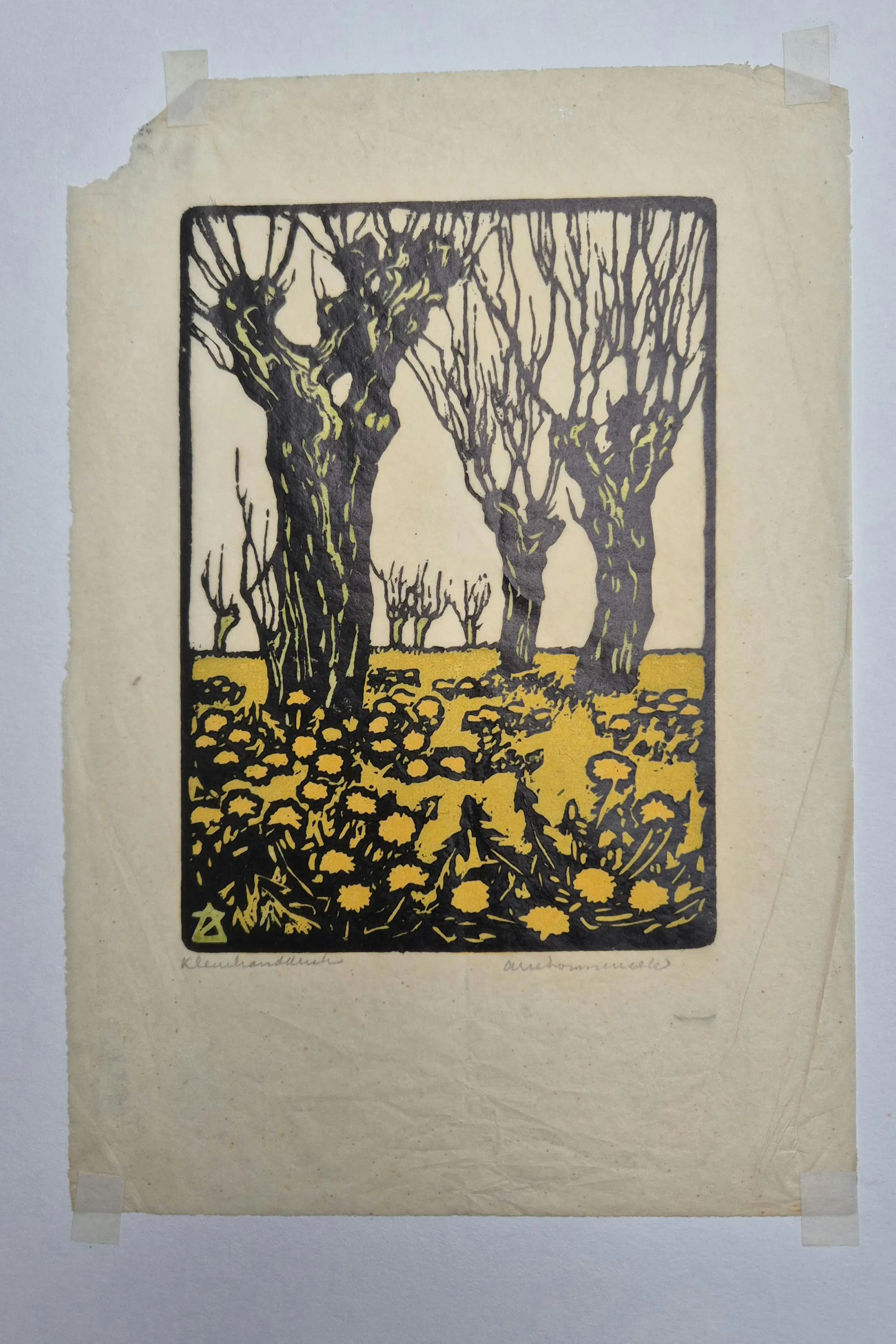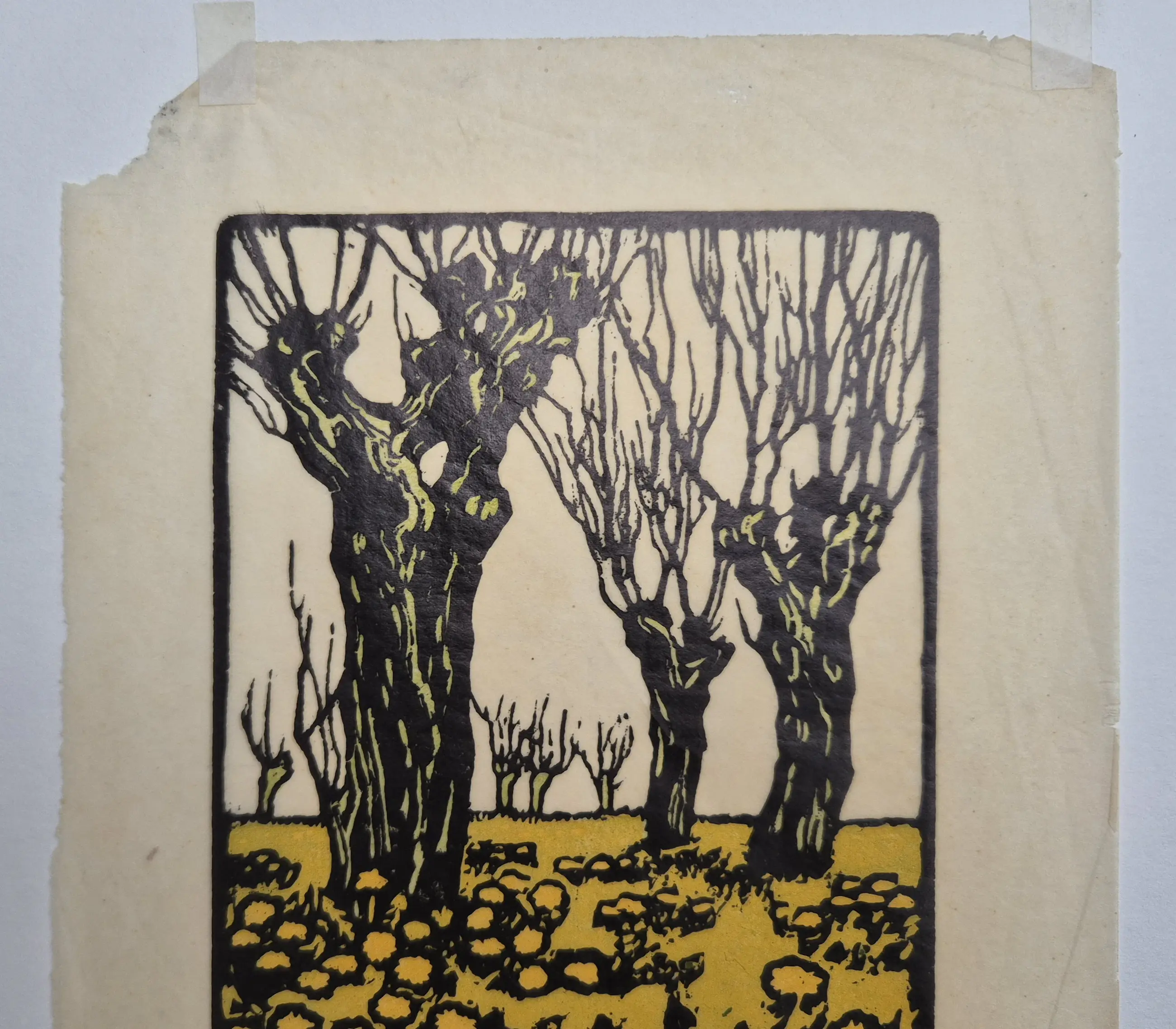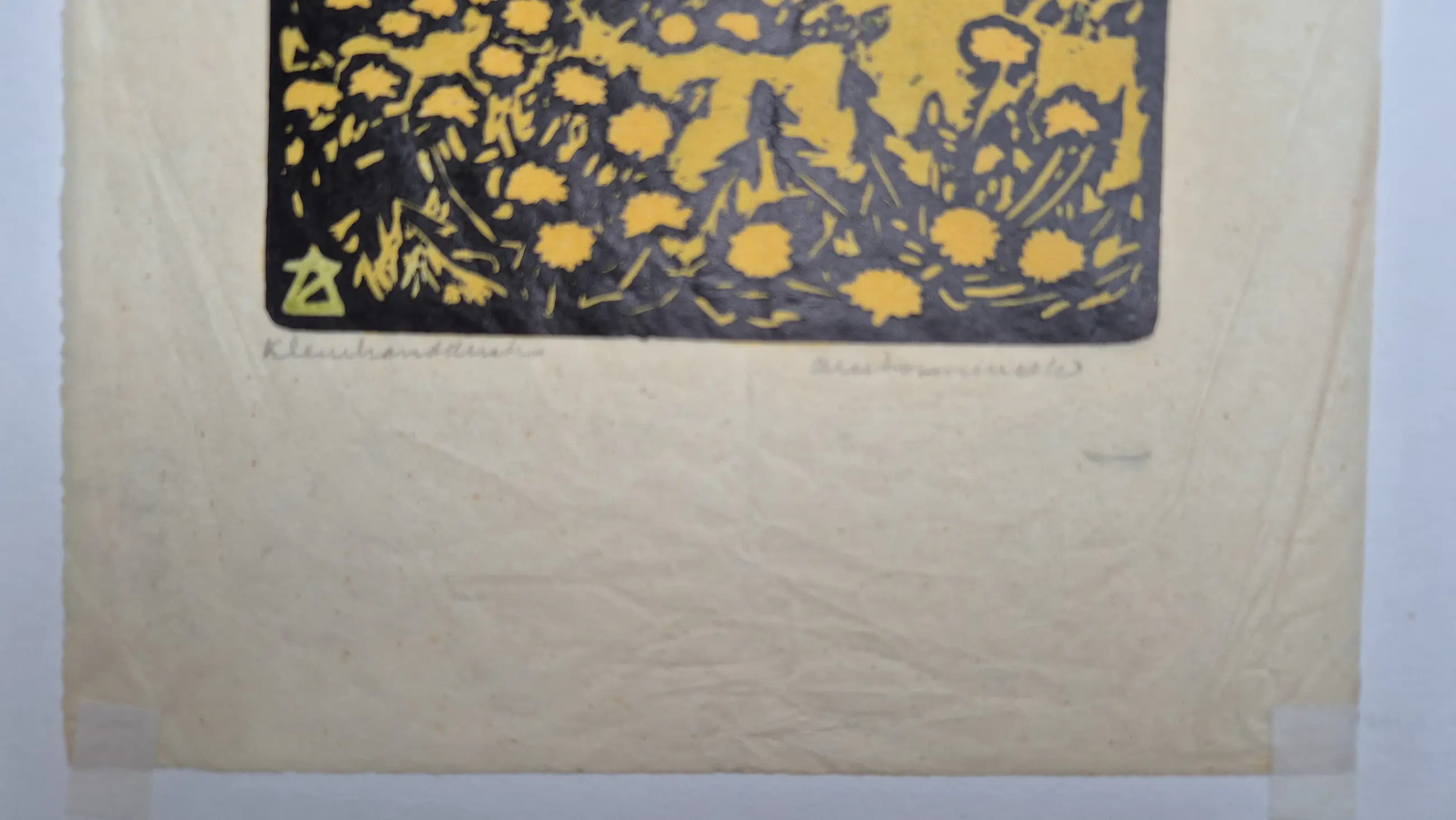 Conditie: kreukjes in het papier en bovenste hoek afgescheurd, zie scans. Niet zichtbaar onder passepartout.