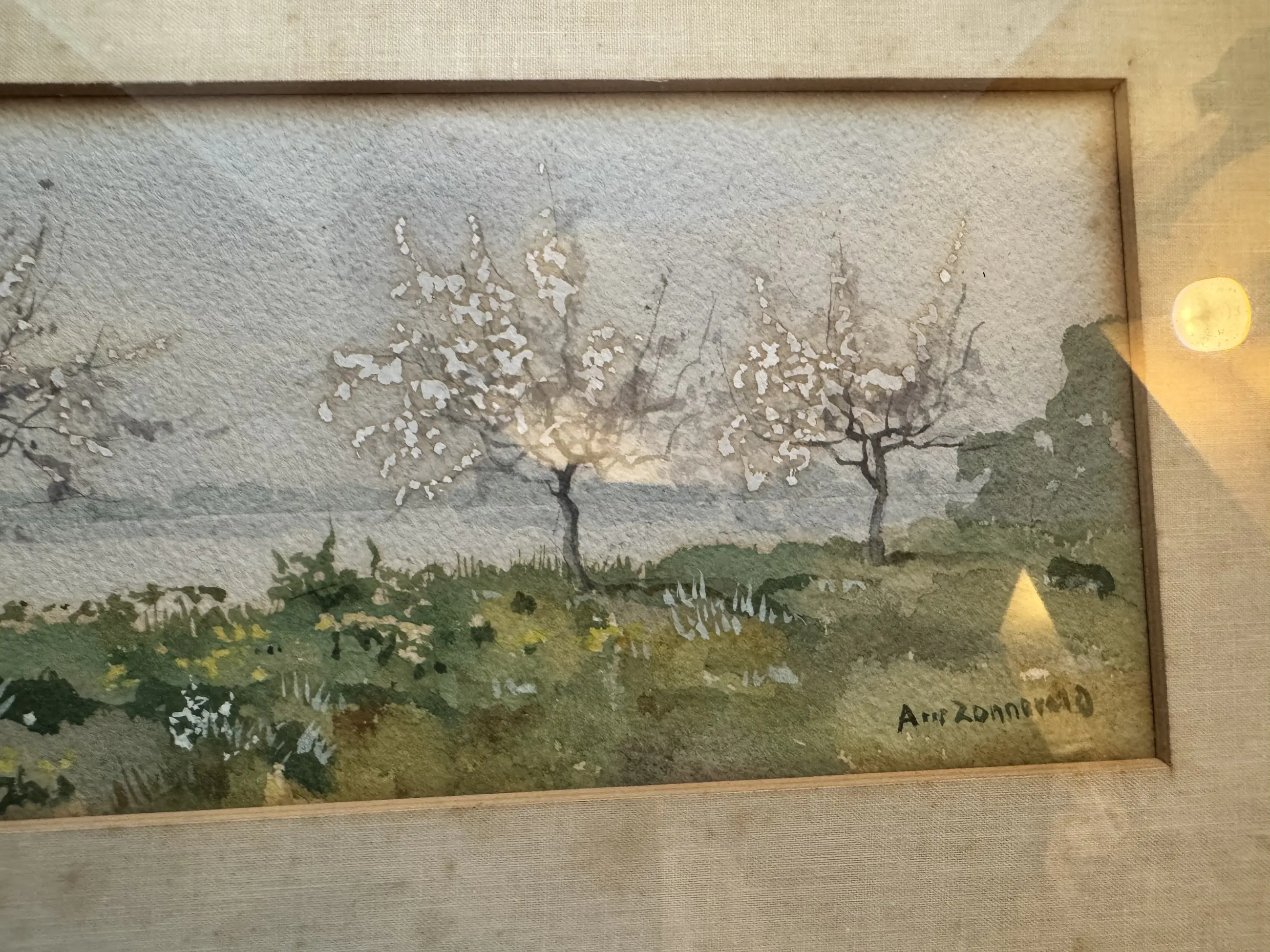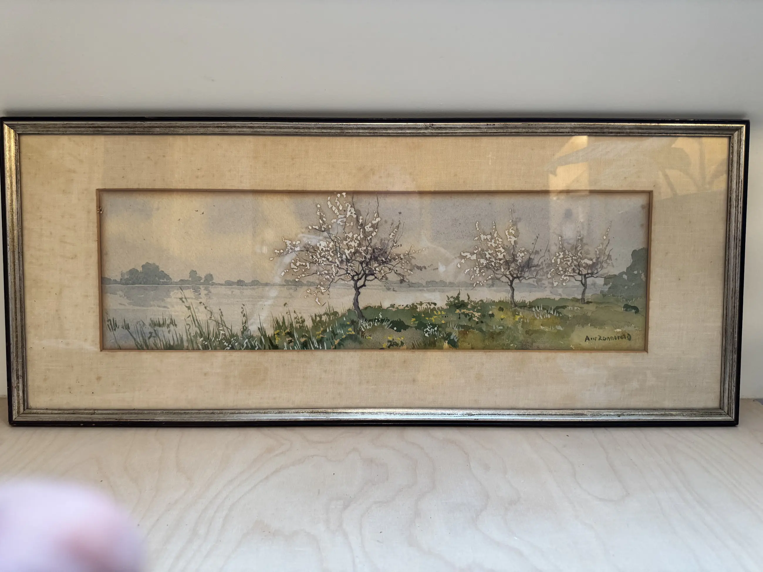 Een prachtig panoramisch Hollands landschap, gesigneerd door Arie Zonneveld (1905–1941). Zonneveld was een Nederlandse schilder en graficus die bekend stond om zijn rustige, realistische weergaven van het polderlandschap. Dit werk is daar een mooi voorbeeld van.