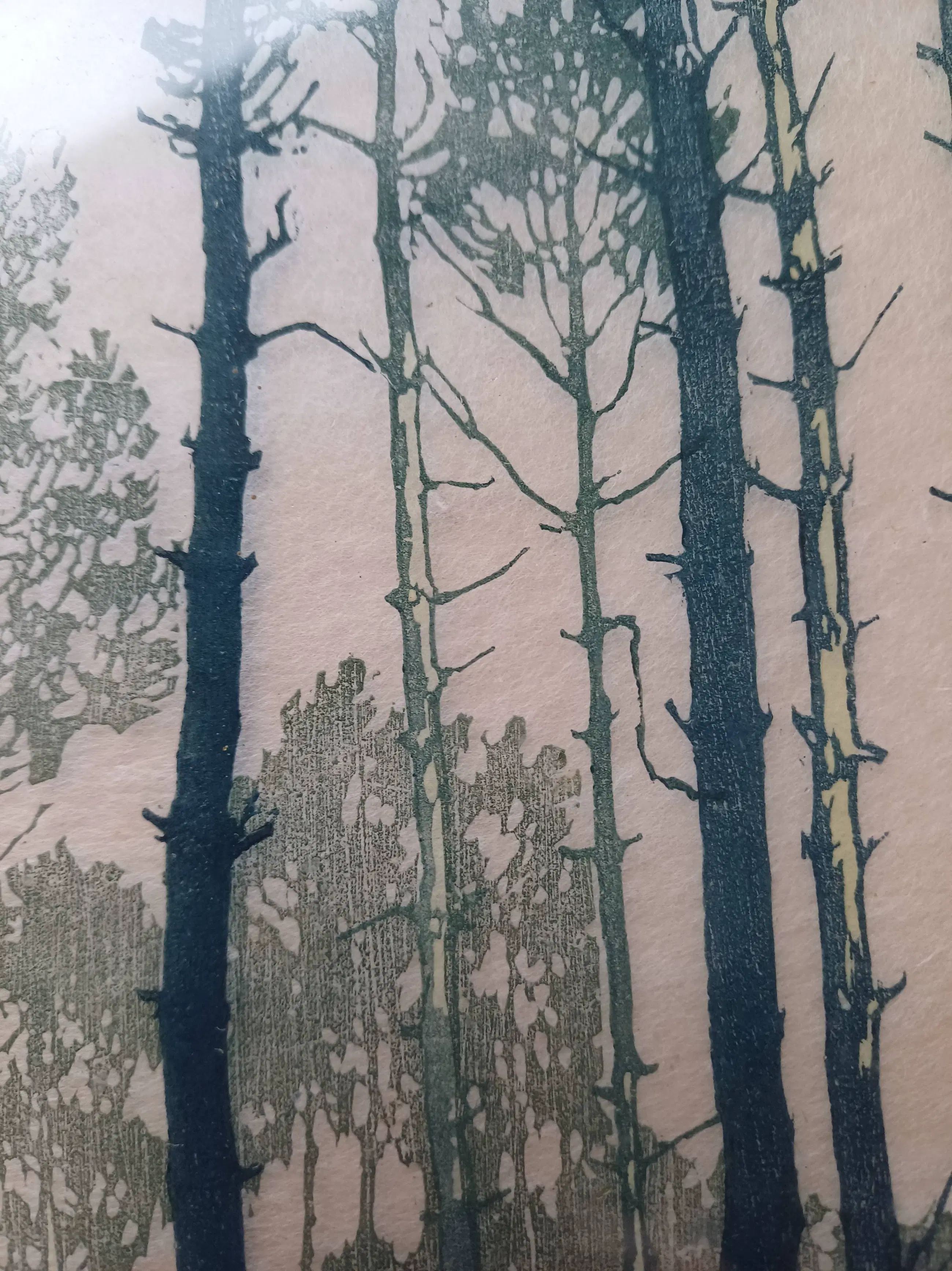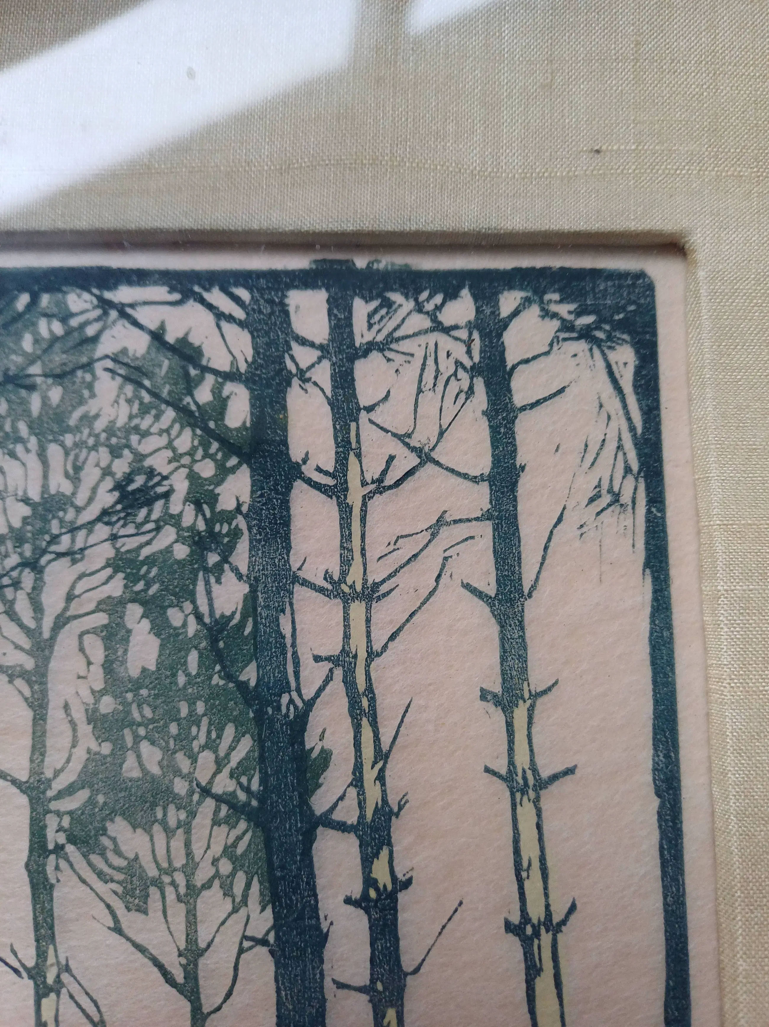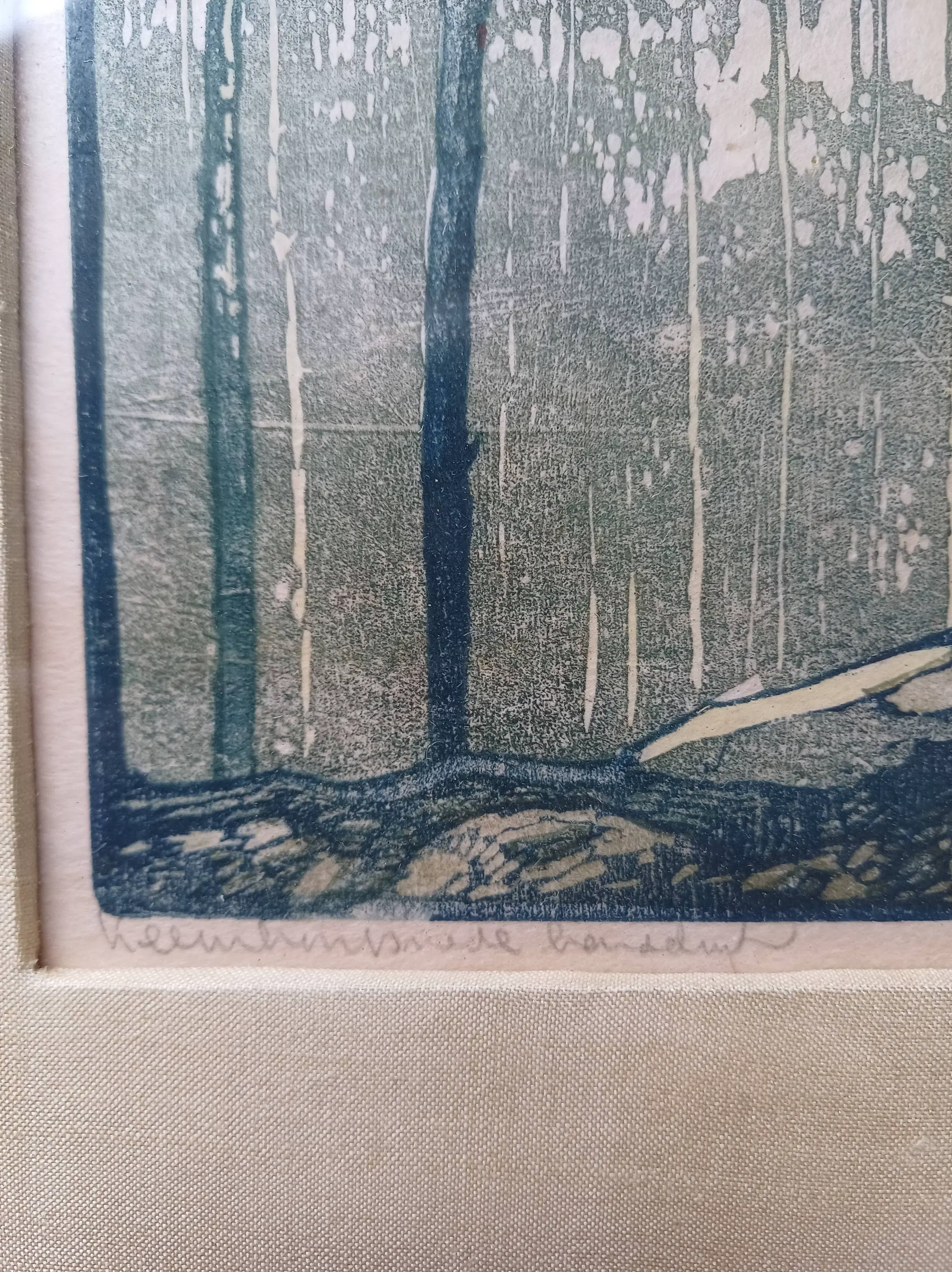 Houtsnede op dun papier van de kunstenaar Arie Zonneveld. Gesigneerd rechtsonder, linksonder staat iets geschreven wat moeilijk te lezen is.