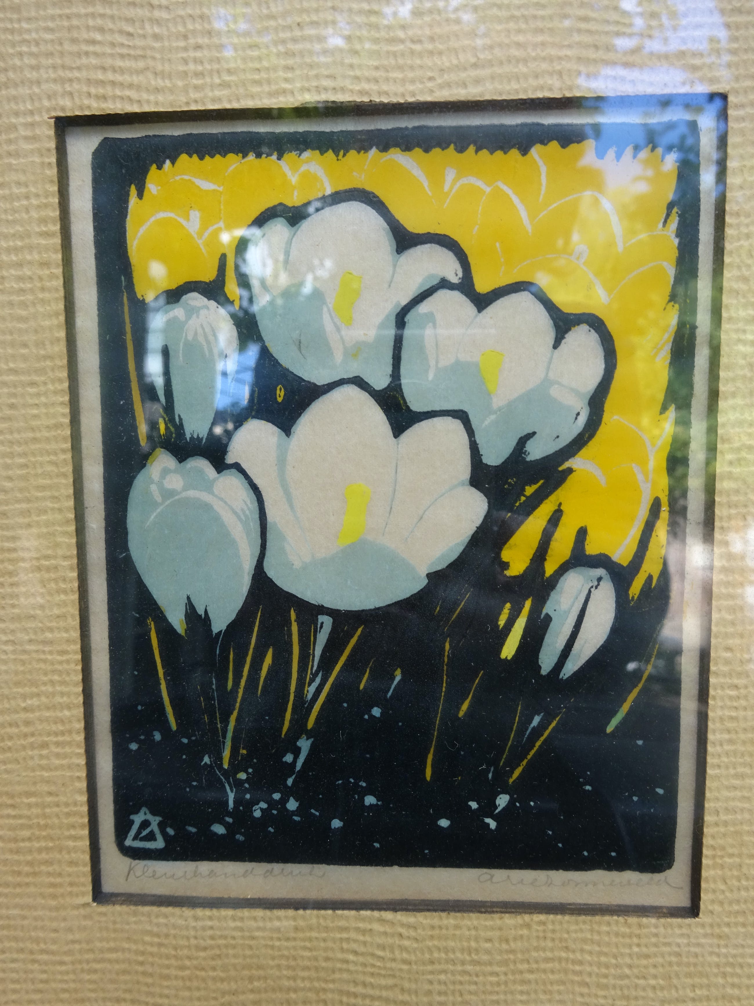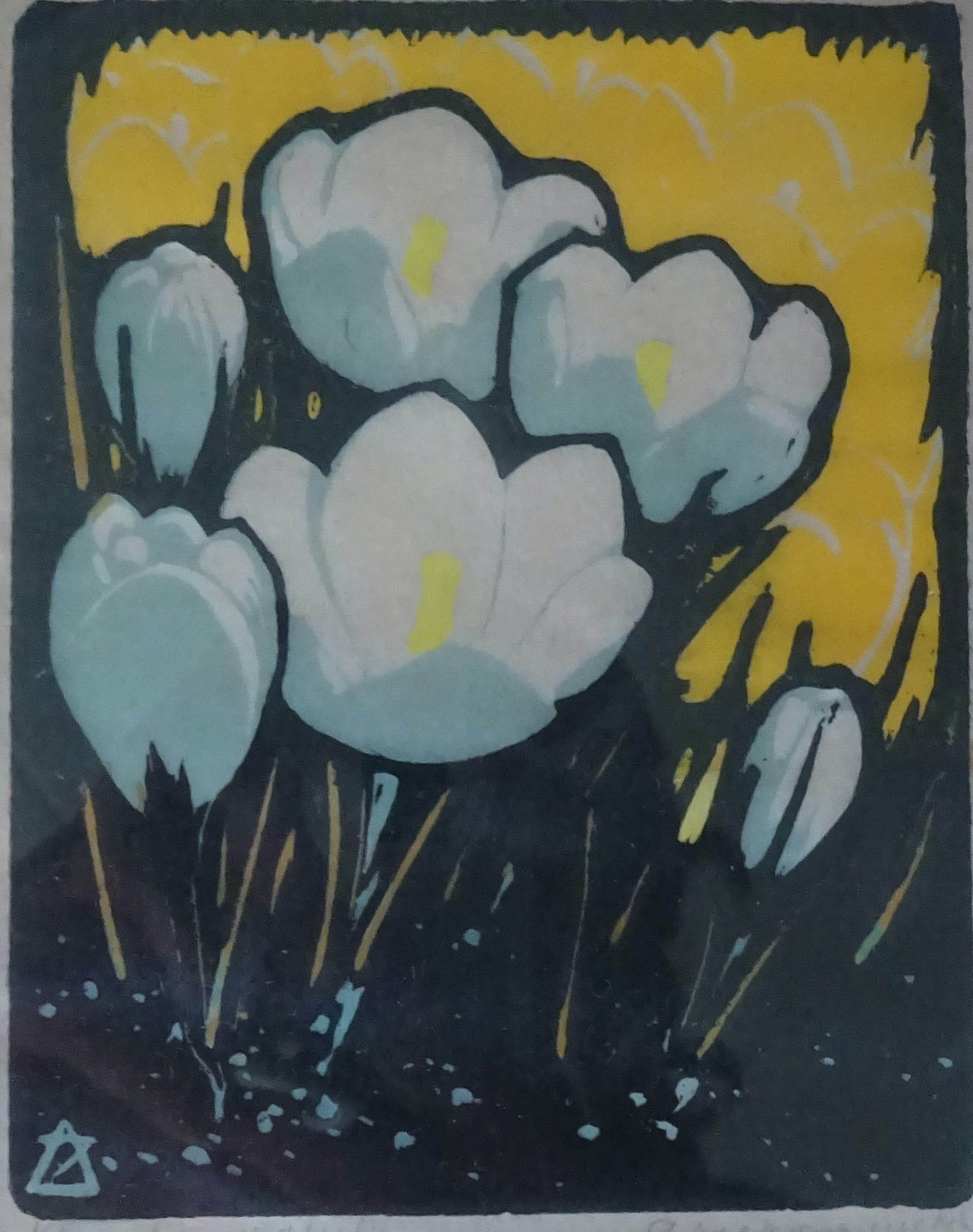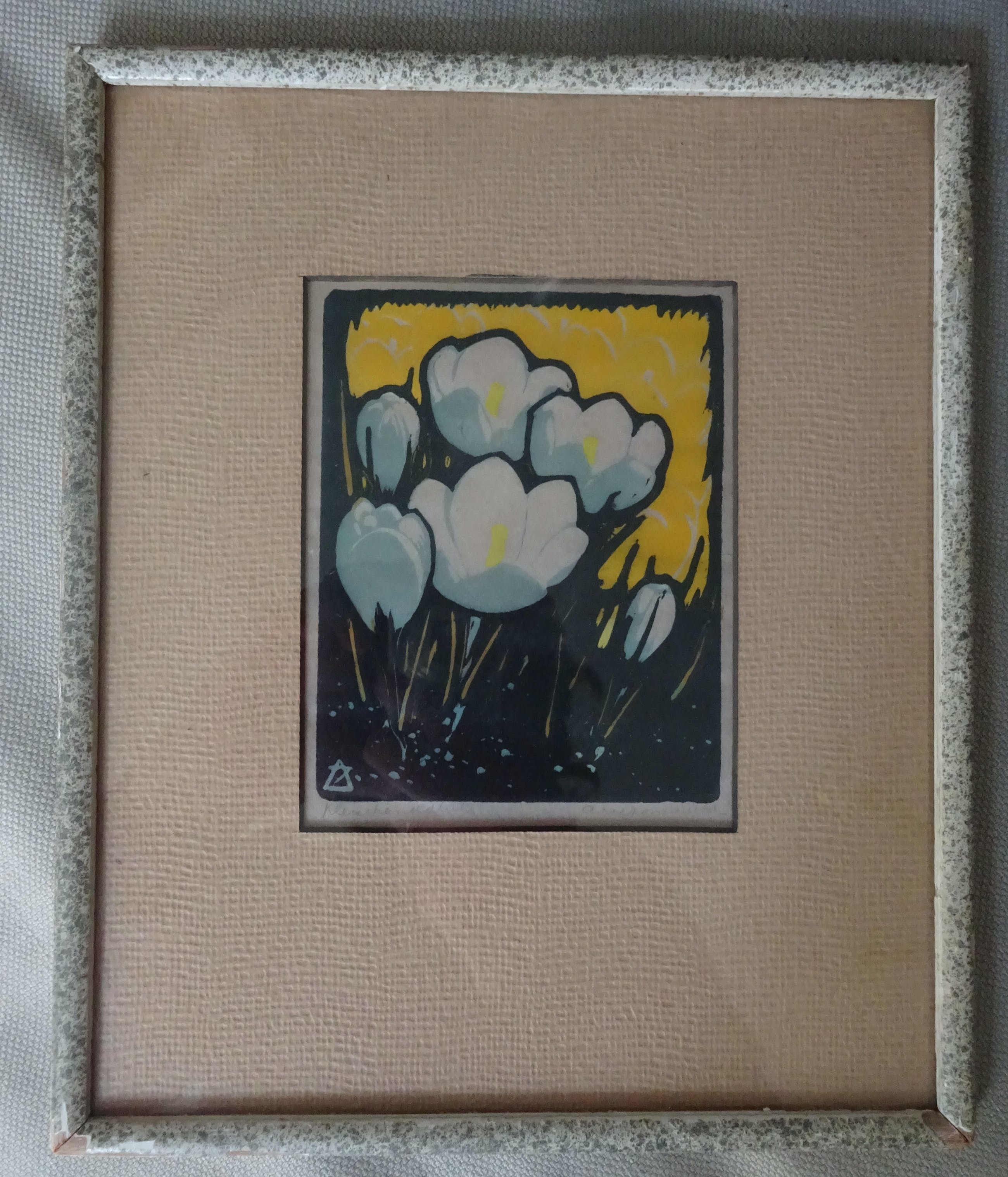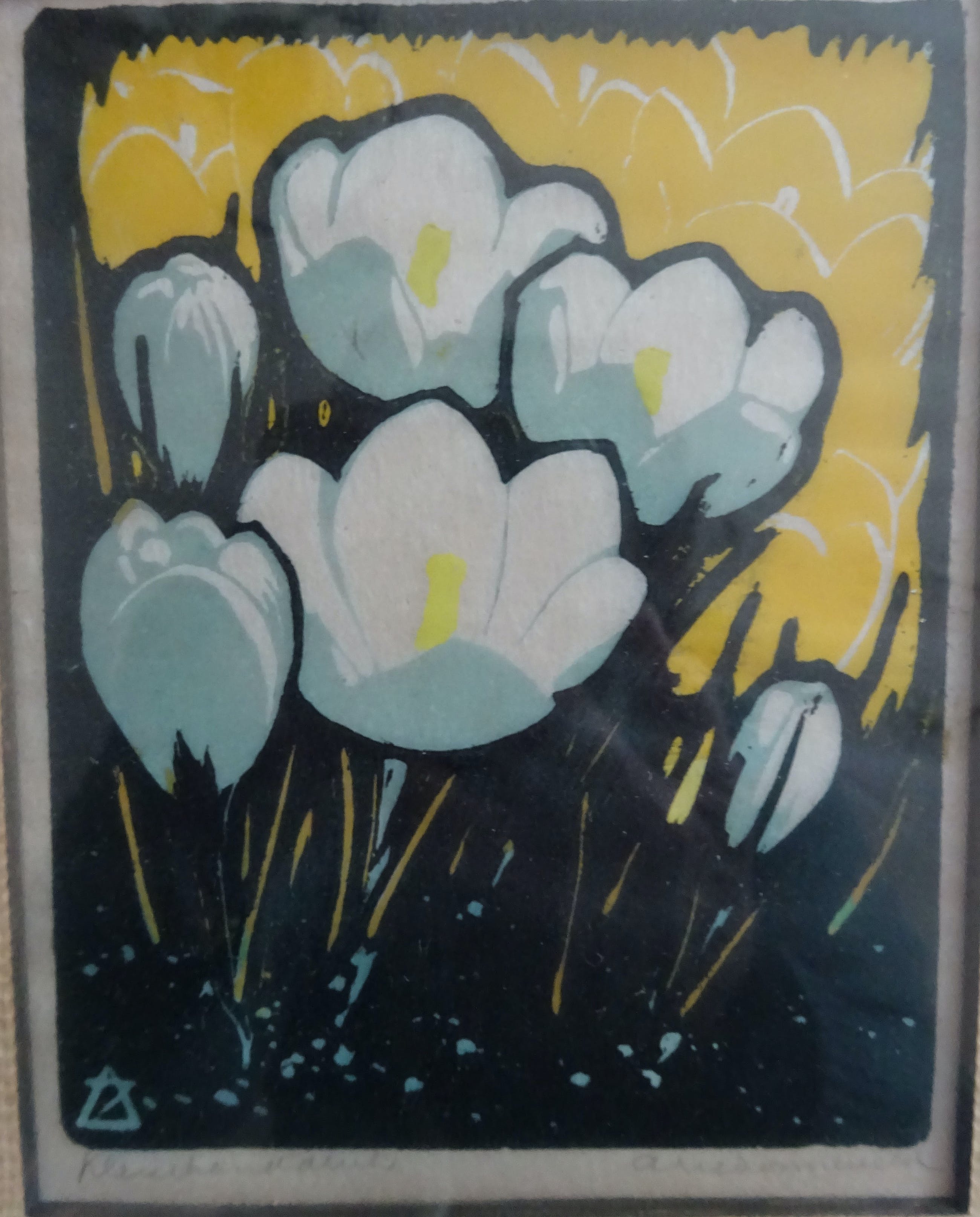 Titel: Crocus Beeldend kunstenaar: ARIE ZONNEVELD 29 december 1905 - 5 april 1941 Geboren in Amsterdam, overleden in Den Haag Jaar: 1934 Techniek: Kleuren-houtsnede op dun papier Afmeting: 9 x 11 cm Afmeting met lijst: 21. x 25.5 cm Kleuren: Geel / Grijsblauw / Indigo Kunsthandel: Van de Geer Den Haag