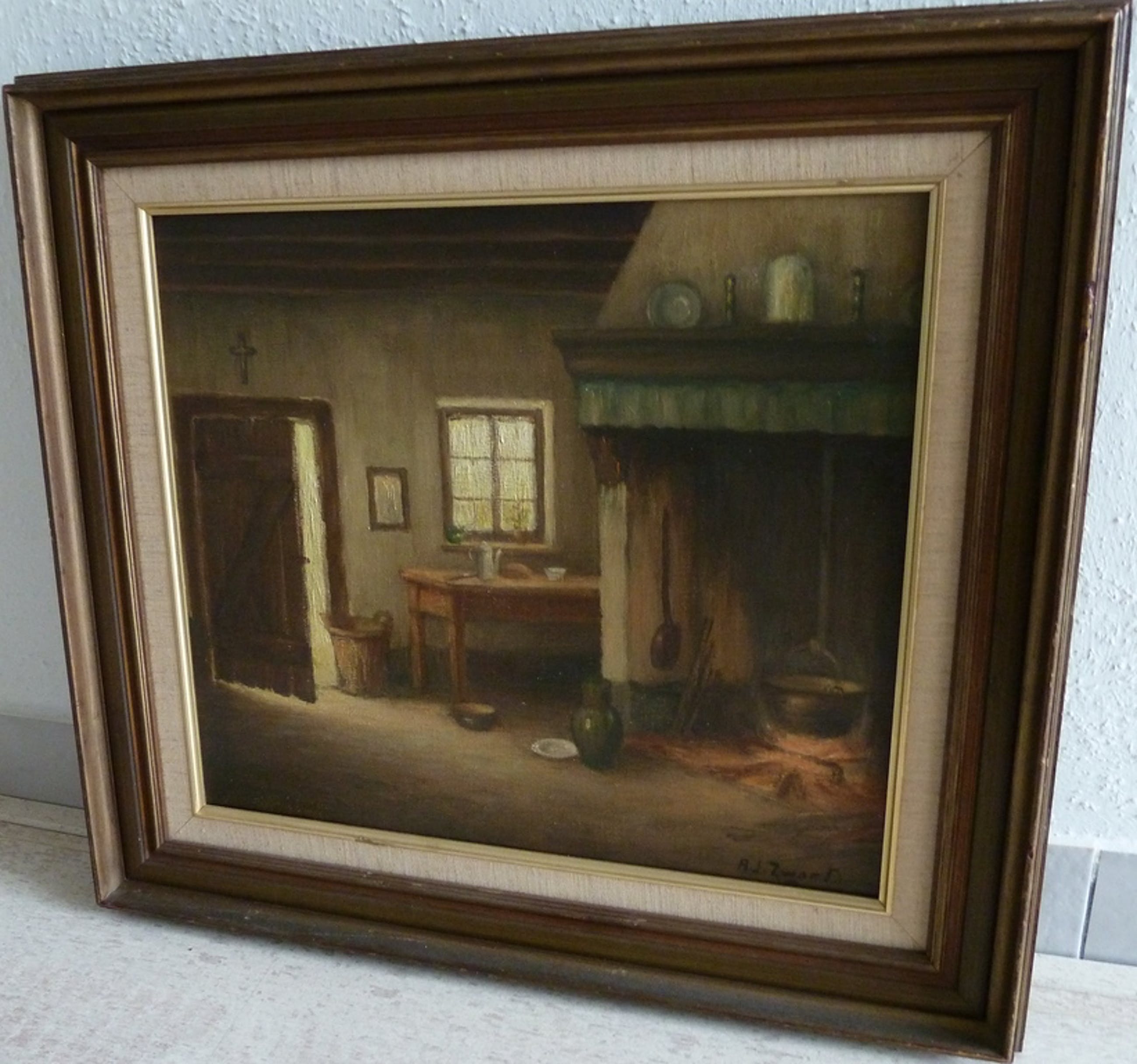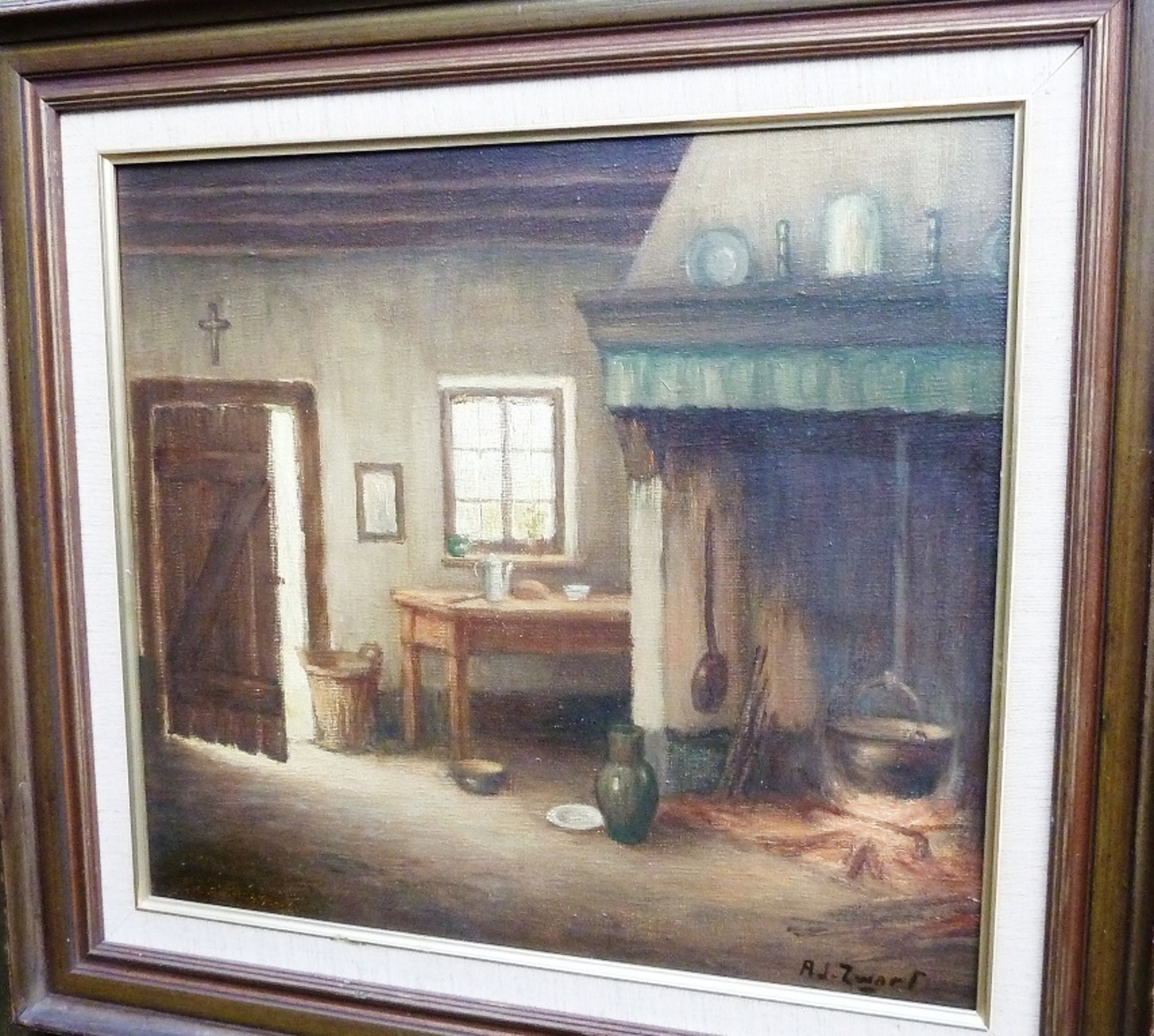 mooi en gaaf schilderstuk van aj zwart, het betreft boeren tafereel. 60x55cm de lijst is niet uit de tijd van het schilderstuk