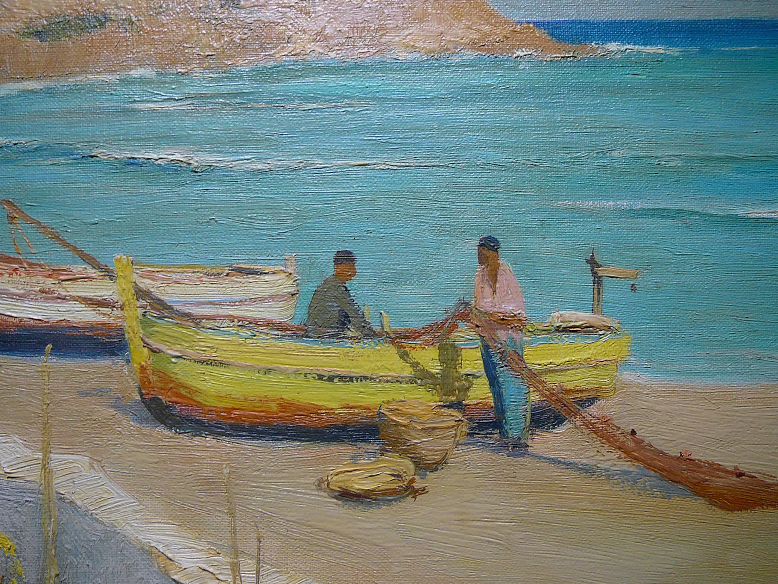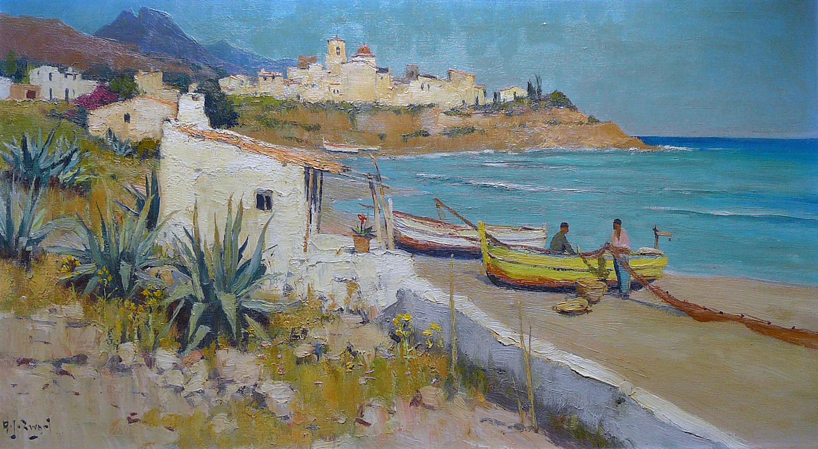 Fors olieverf schilderij (59 x 94 cm) van de hand van Adrianus Johannes (Arie) Zwart uit de jaren vijftig van de vorige eeuw. In het verleden was Benidorm een klein vissersdorpje. Linksonder en verso gesigneerd en betiteld. Het geheel verkeert in goede tot zeer goede staat.