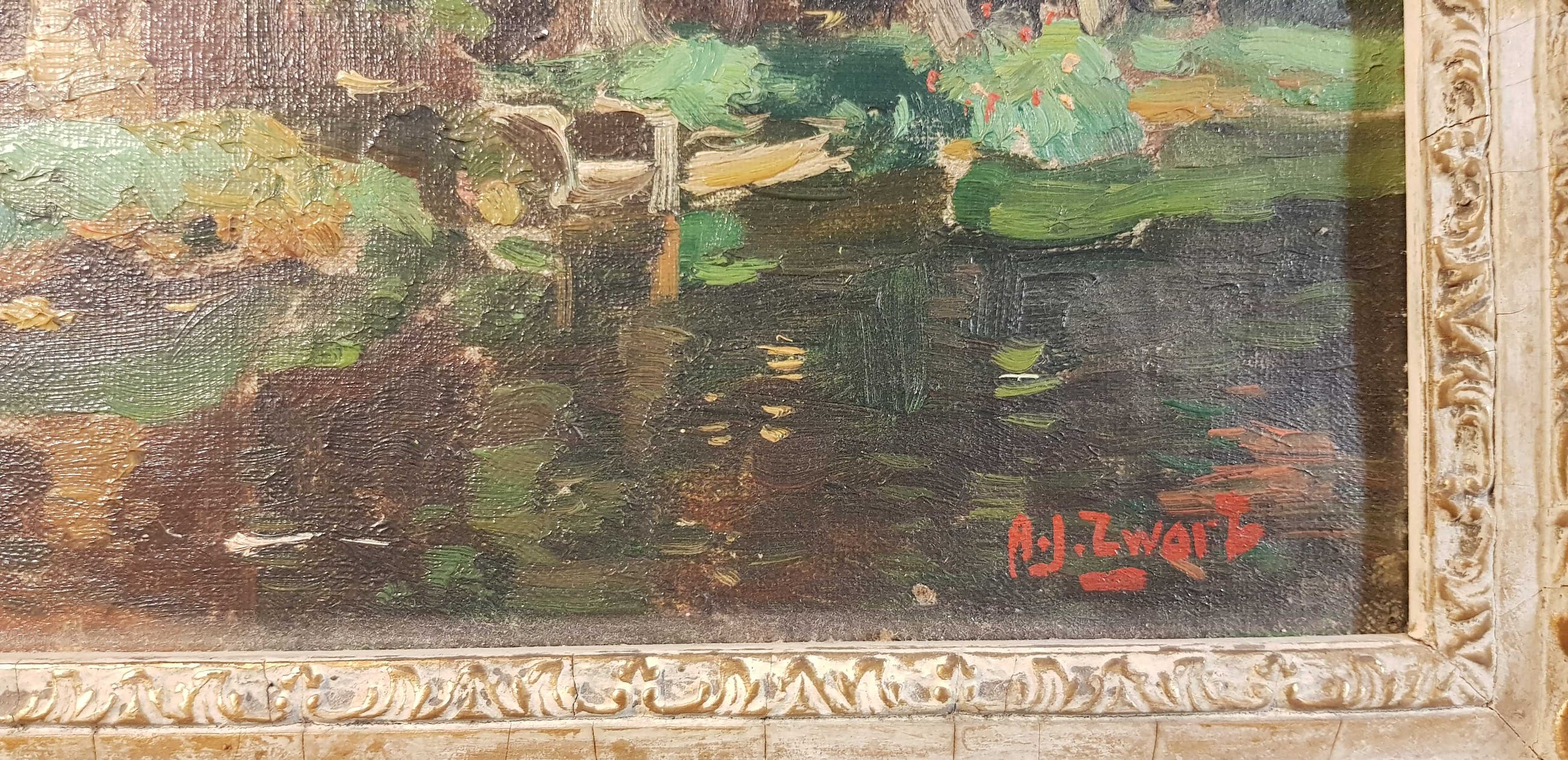 Zwart. Het werk is in tiptop conditie, de bewerkte lijst is licht beschadigd. Ik heb het werk gekregen van mijn oom die een ook kunstschilder was en bevriend met Arie Zwart verkregen. Op de achterkant staat Rijswijk 1929 genoemd.