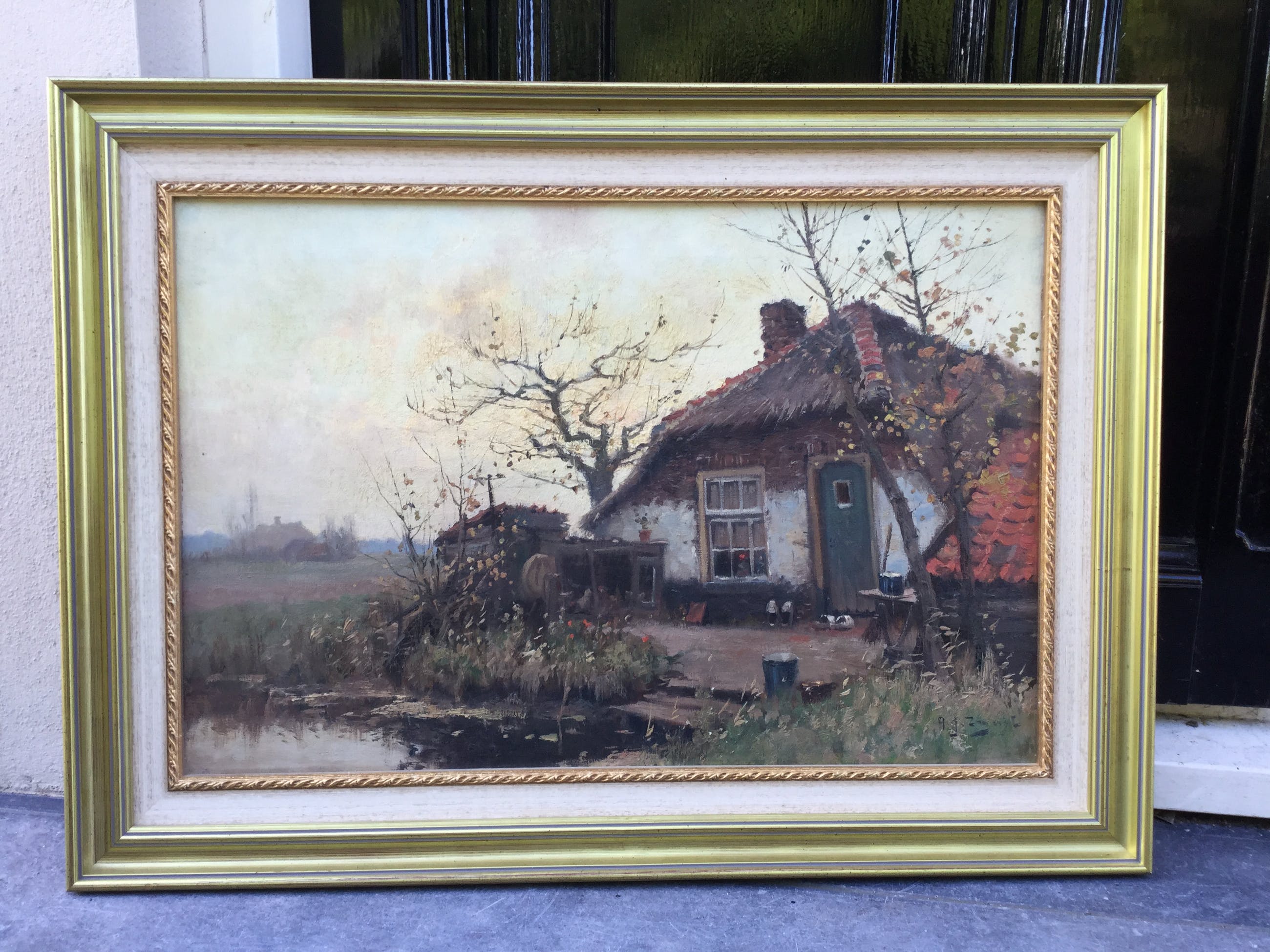Doek bevat oppervlaktevuil en verkleurde vernis door de tijd, doek bobbelt iets want is wat slap. De lijst bevat oppervlaktevuil en slijtschade door de tijd. | |