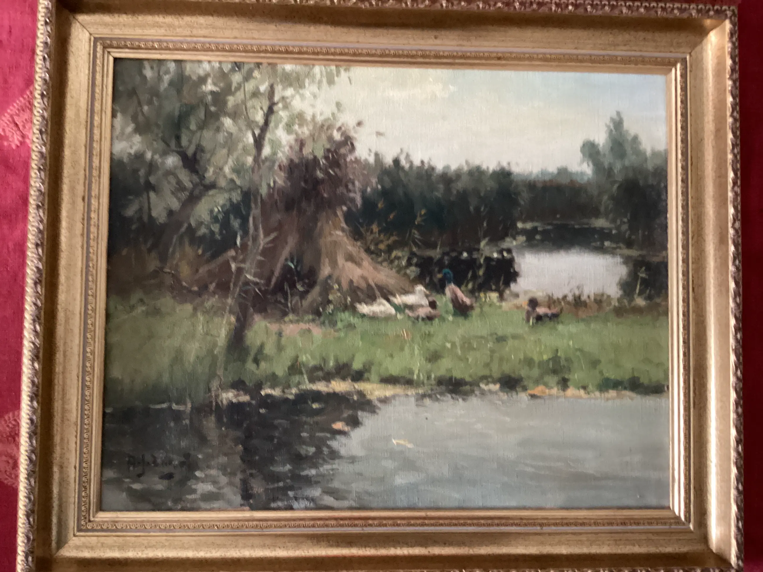 Dit betreft een klein olieverfschilderij van eenden aan het water van de bekende kunstschilder Arie Zwart. Het omvangrijke oeuvre van Arie Zwart is vrijwel geheel geschilderd in de impressionistische stijl die werd ontwikkeld door de schilders van de Haagse School. Daarin spelen licht en stemming een belangrijke rol. Hetzelfde geldt voor zijn onderwerpen: landschappen, boerderijen, plassen en stillevens. De schilder bond zich niet aan een bepaalde streek en trok het liefst rond: in de jaren 30 met een woonwagen door Brabant en Gelderland en tussen 1936 en 1974 met een woonboot door Overijssel en Noord- en Zuid Holland. Daarna meerde hij af in Woerden. Tussendoor maakte hij reizen naar Spanje, Portugal en Zuid-Frankrijk. Schilderij en lijst zijn in goede conditie.