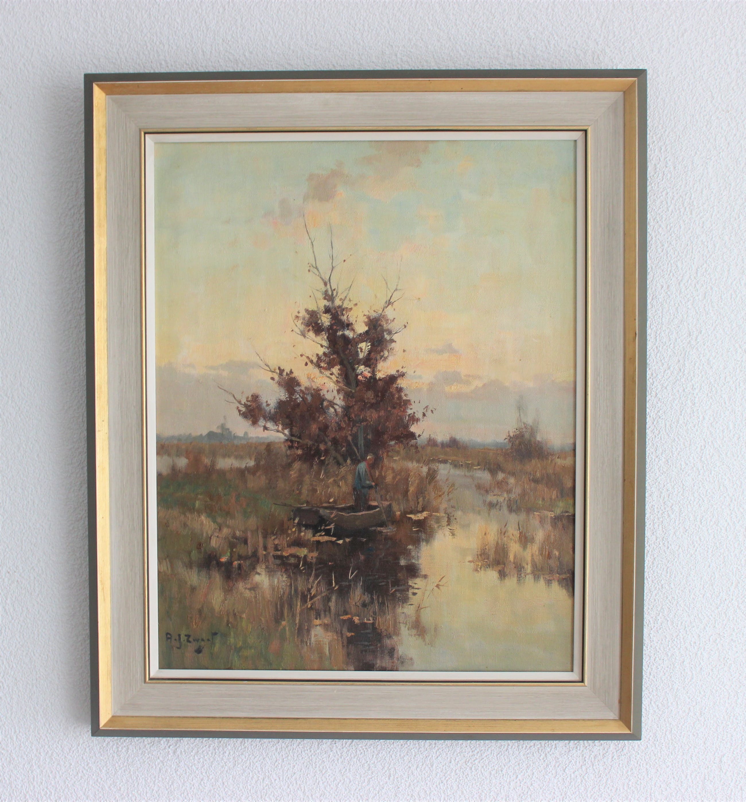 Dit prachtige schilderij is van de Nederlandse kunstenaars "Arie" Zwart (1903-1981). Afgebeeld is een polderlandschap met een kleine stroom onder een licht bewolkte hemel. Centraal op het doek is een visser in een bootje te zien die langzaam over het water beweegt. Het schilderij is 50 x 40 cm (61 x 51 inclusief lijst), linksonder gesigneerd en verso getiteld en gesigneerd.
