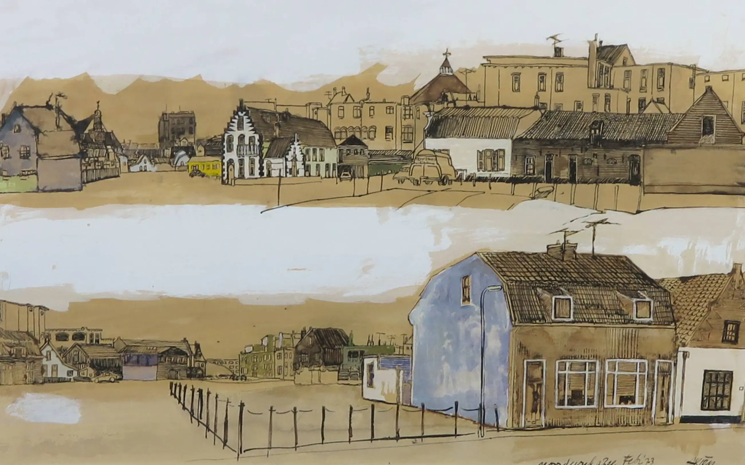 Arien van Waterland - Inkttekening, Noordwijk aan Zee - Ingelijst kopen? Bied vanaf 35!
