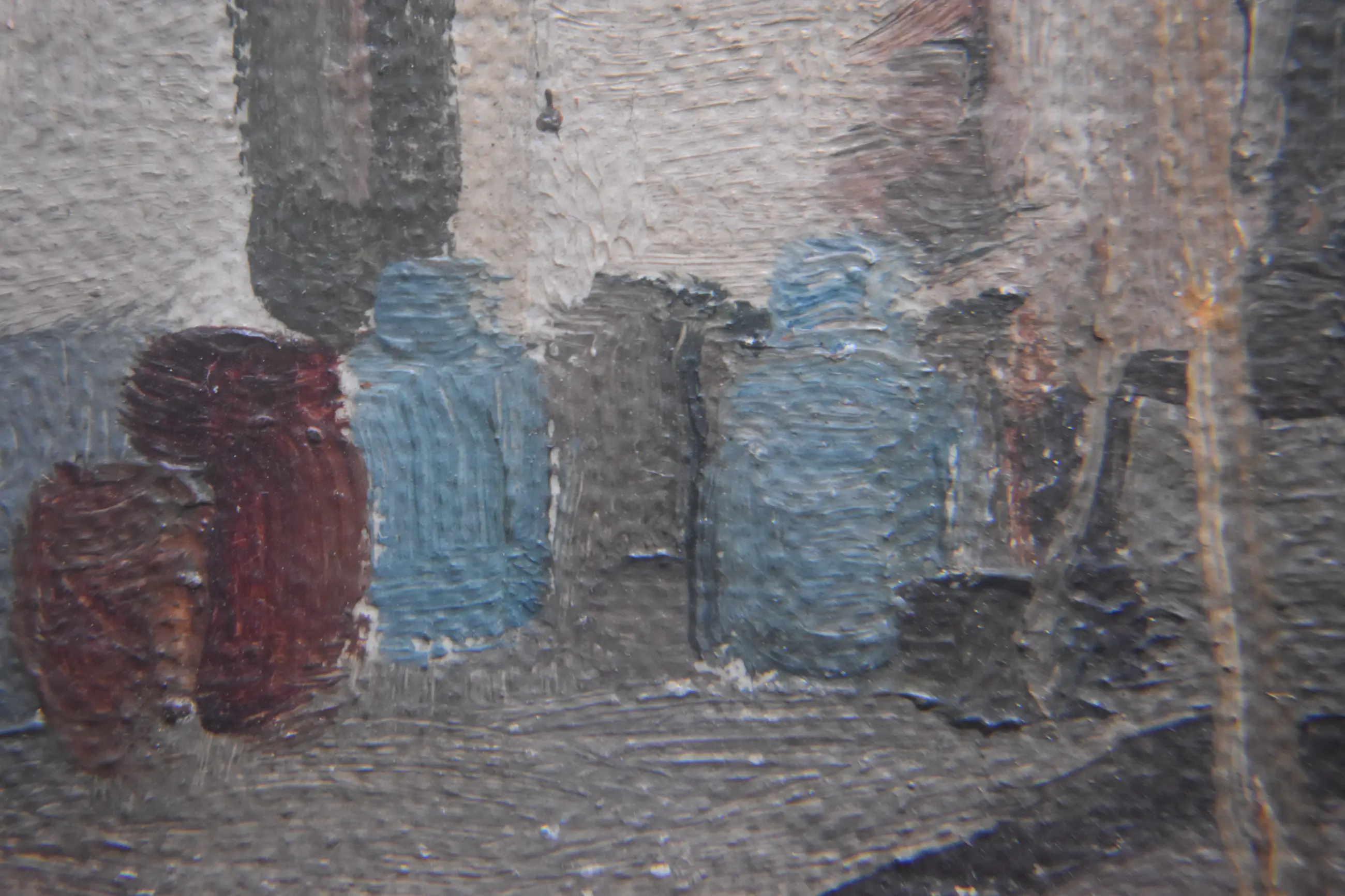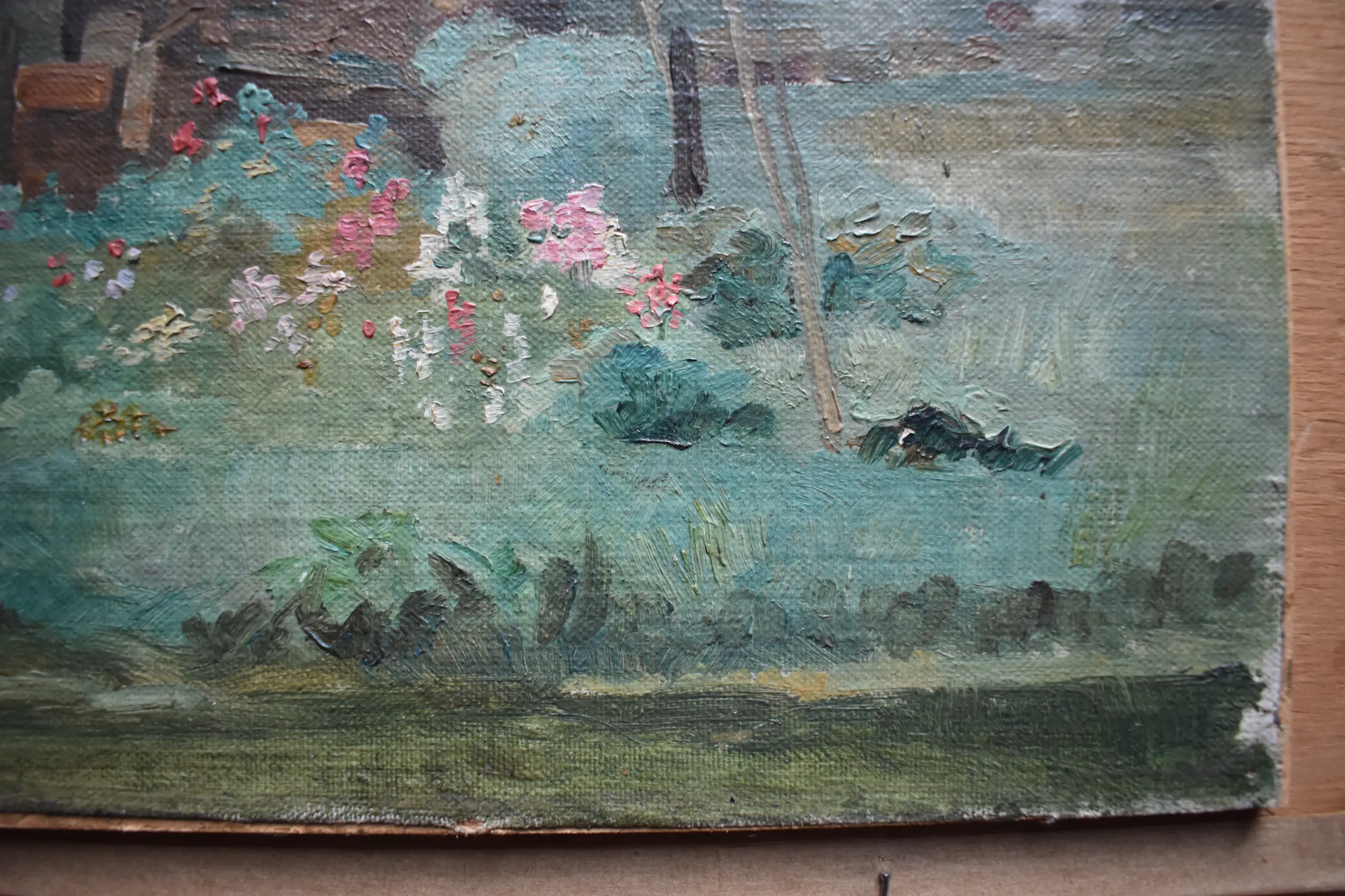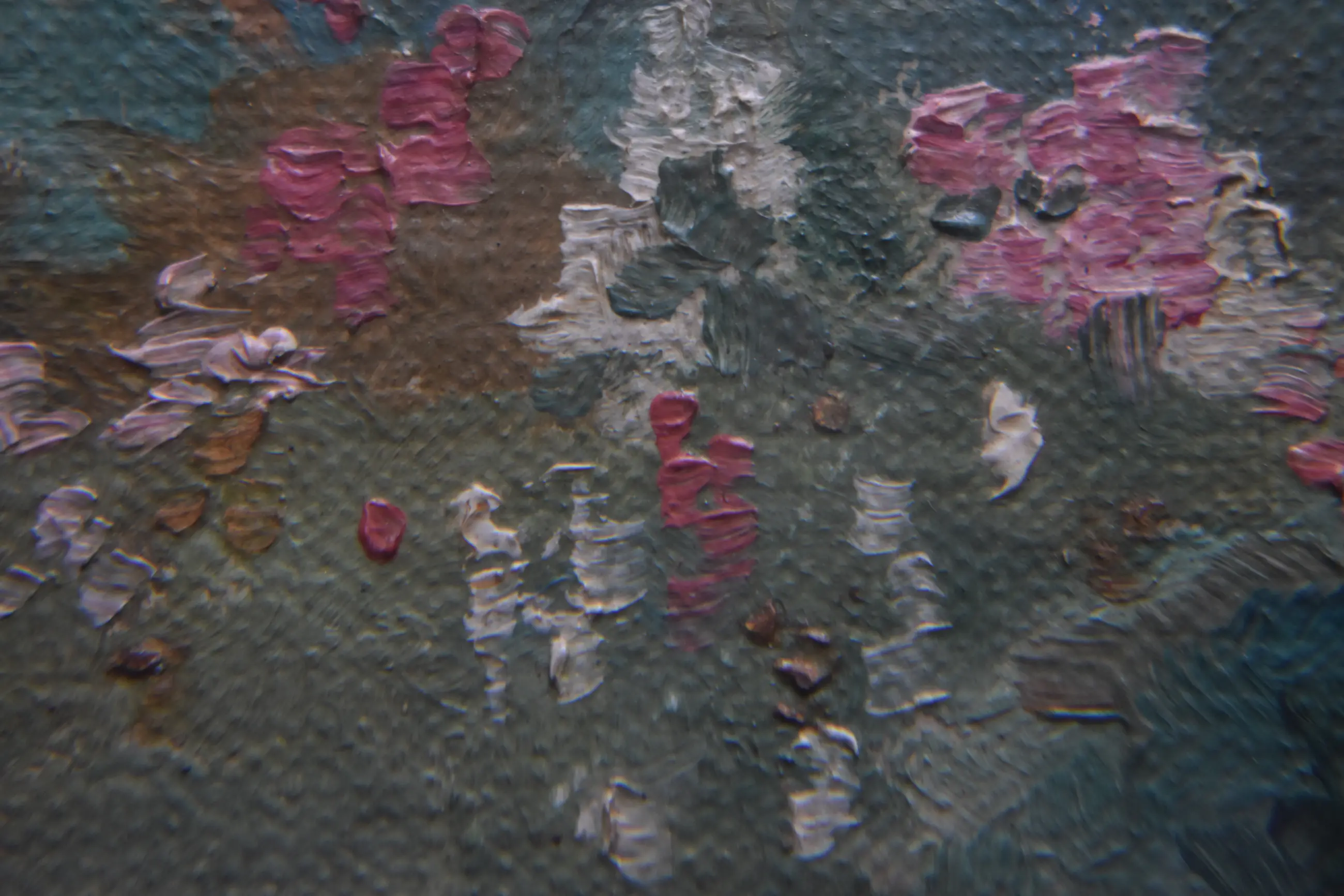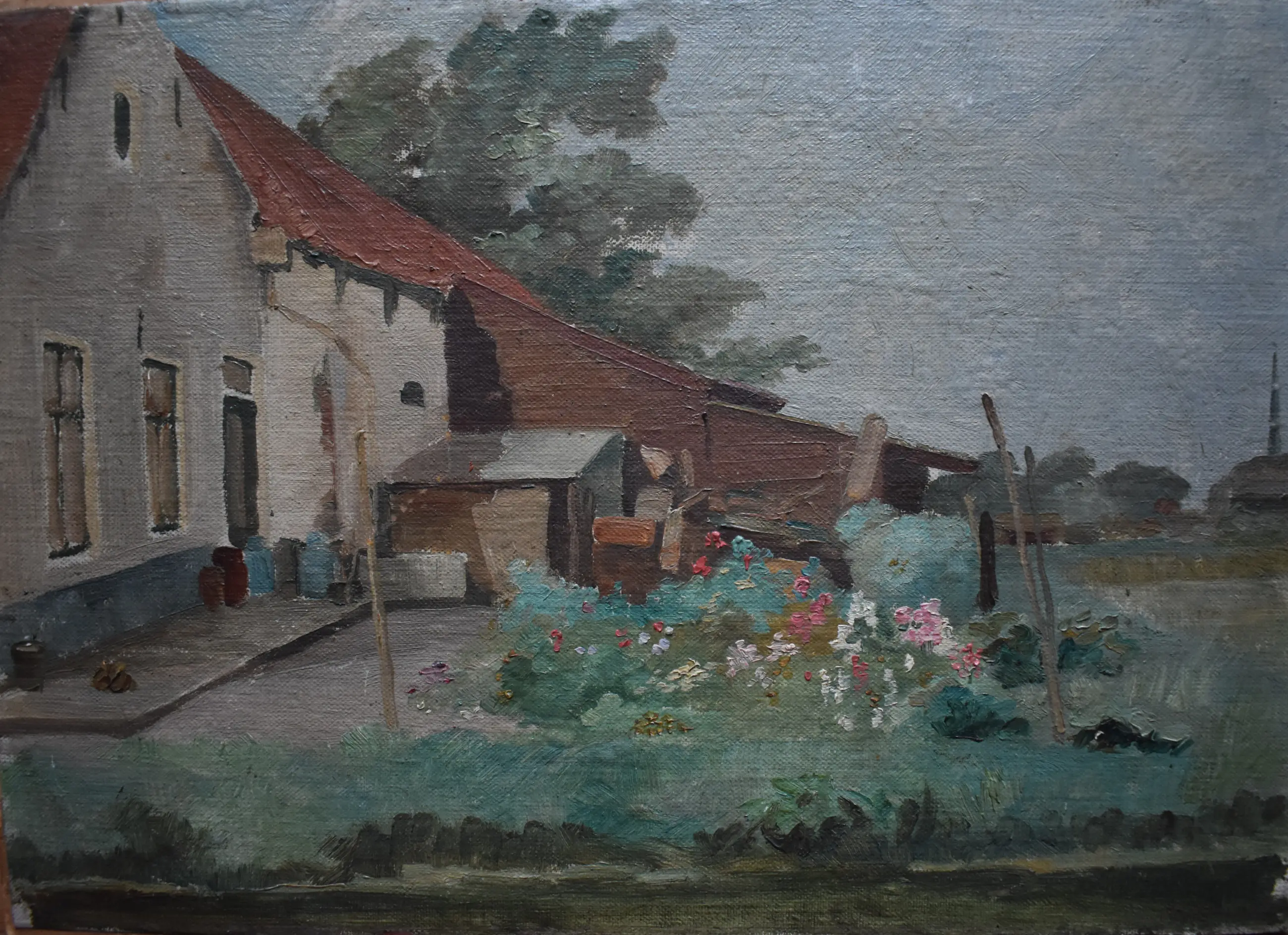 De olieverf is mogelijk van de hand van Aris Knikker. Er zijn wel onduidelijke sporen van signatuur maar helaas niet duidelijk. Het betreft een mooi lichtkleurig olieverfje dat kompleet is gezien de hoeken waar punaise gaatjes zitten. Is later op paneel gemonteerd. Qua stijl komt het heel dicht bij Aris Knikker, de oudste uit de Knikker familie. De konditie is prima. De maat is geschikt voor een lijst in standaard formaat.