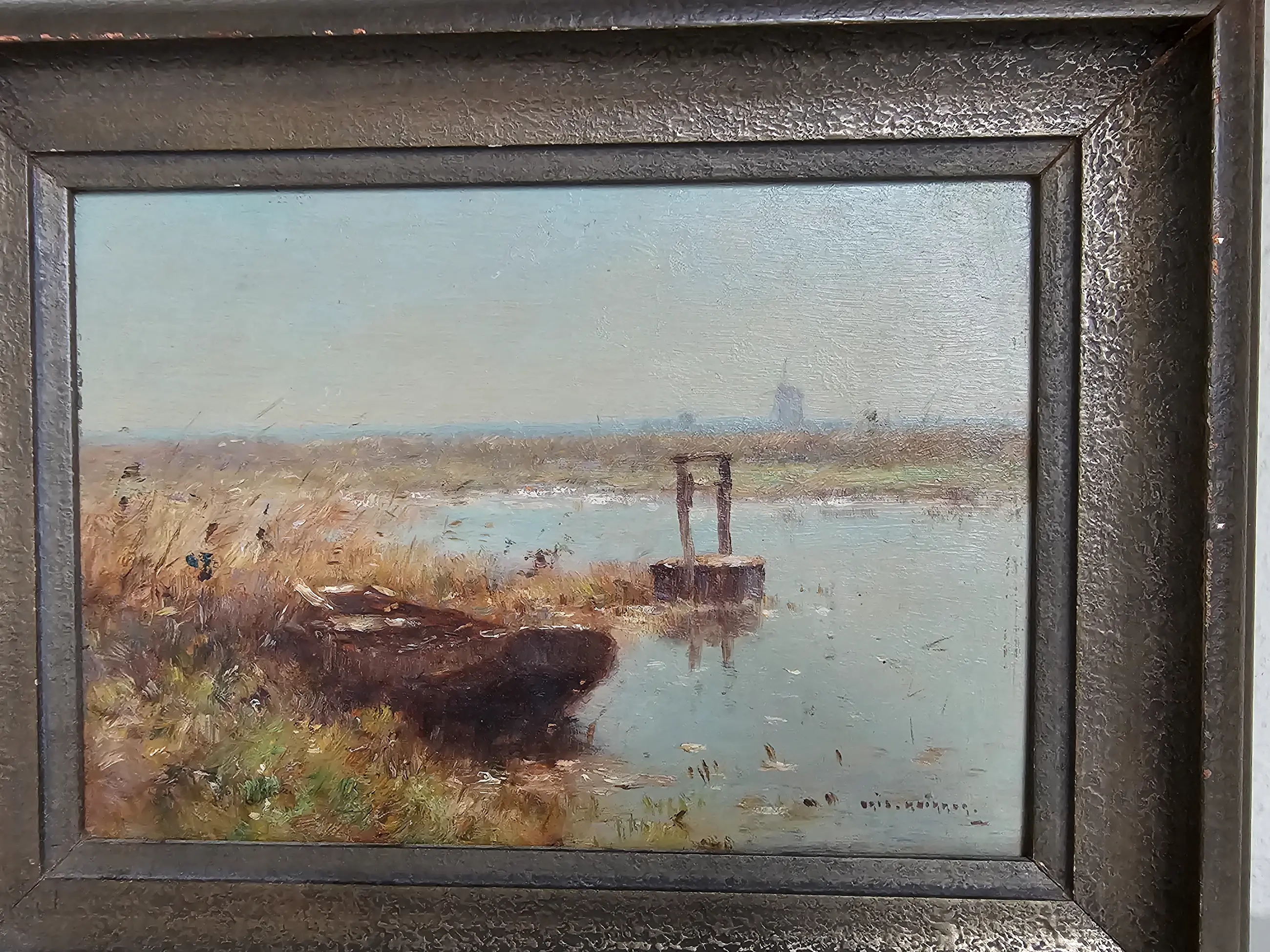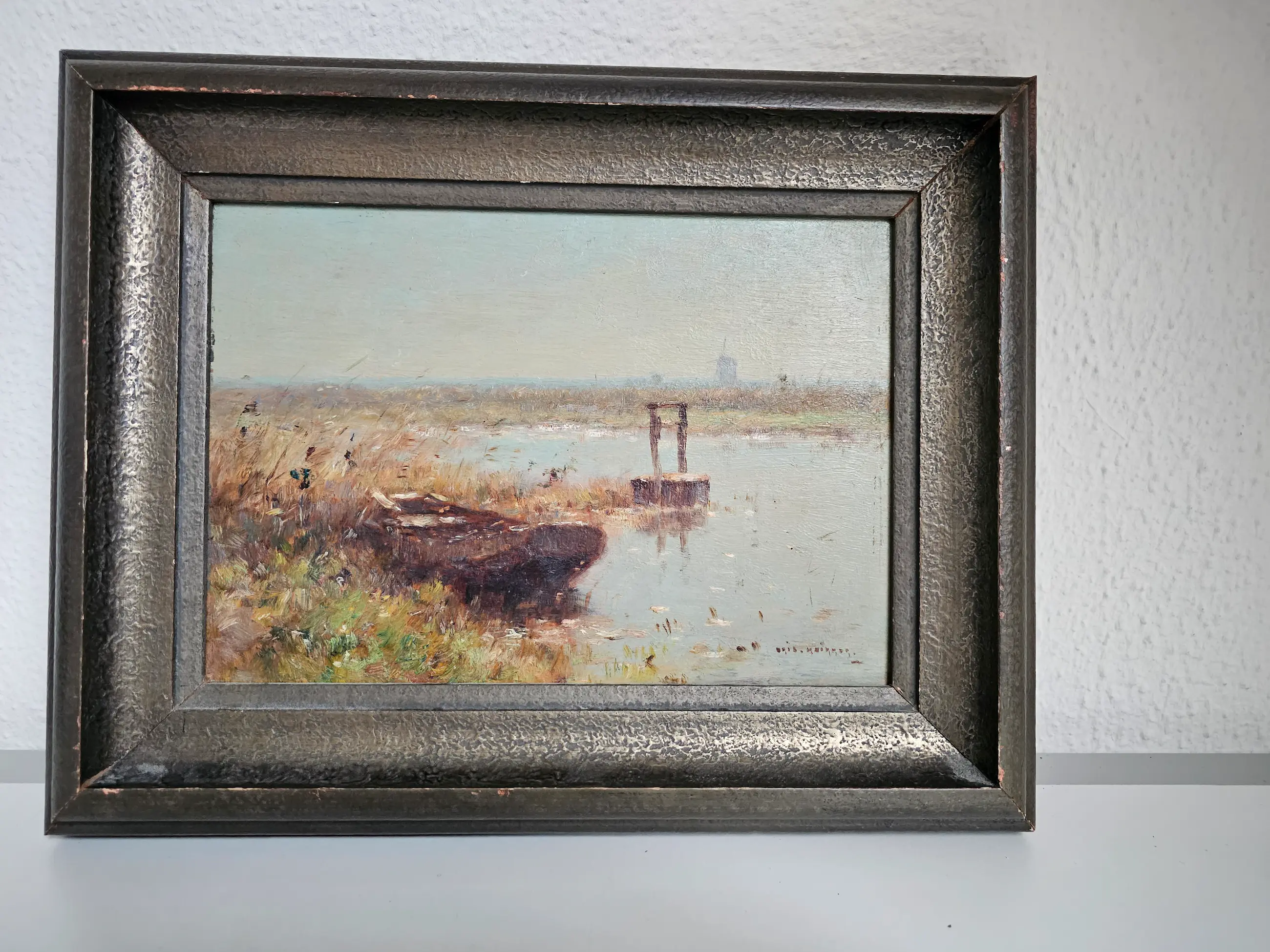 "Polderlandschap met schuit" is een authentiek en sfeervol schilderij Aris Knikker. Dit werk brengt de serene en rustgevende sfeer van een rustig waterlandschap tot leven, met de subtiele weergave van een aangemeerd vissersbootje. Kenmerken van de stijl van Knikker zoals zijn lichte penseelstreken en het subtiele kleurgebruik komen ook in dit schilderij prachtig tot uiting.