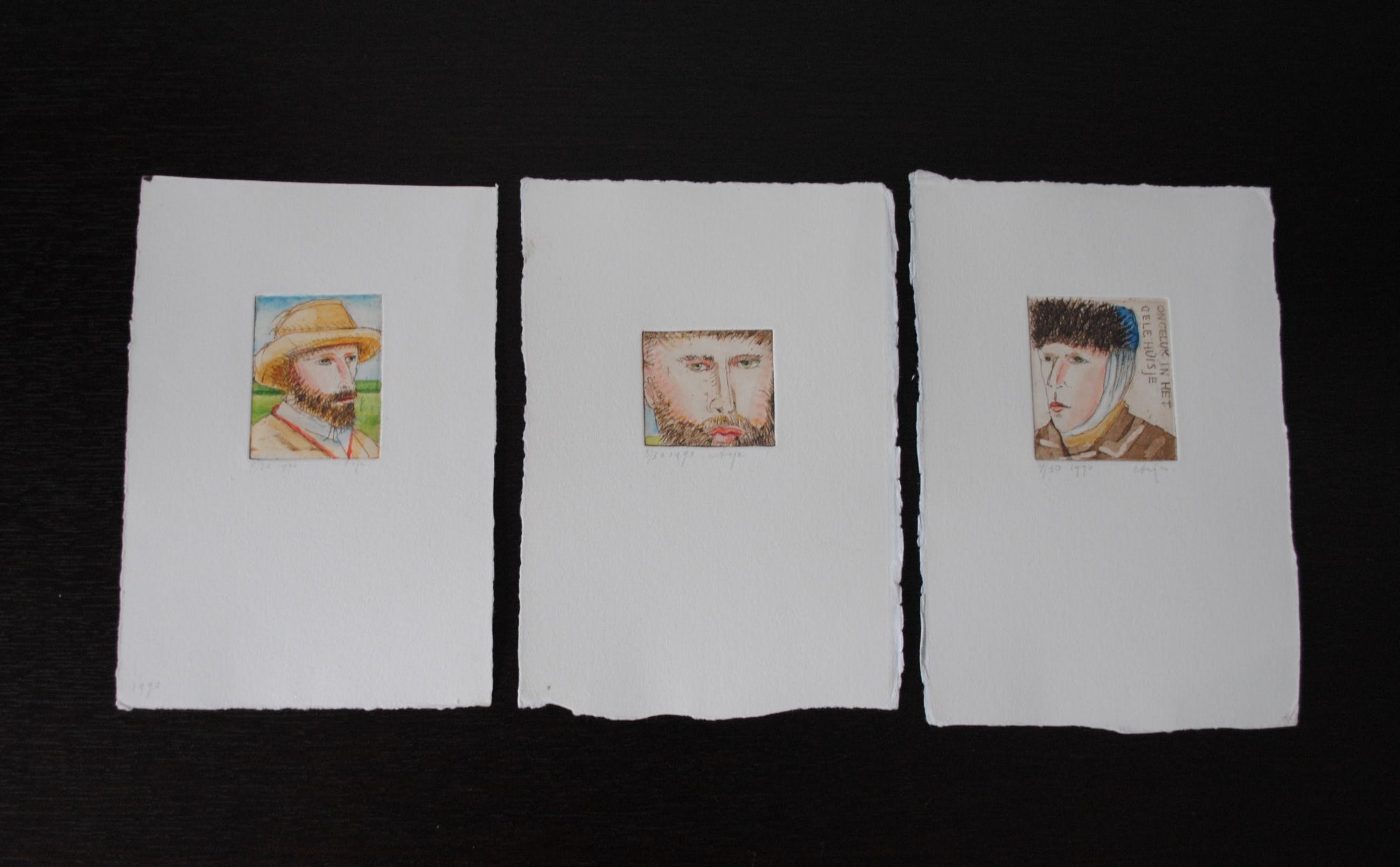 Drie bij elkaar passende kleine kleurenetsen van Arja van den Berg uit 1990 op handgeschept papier: