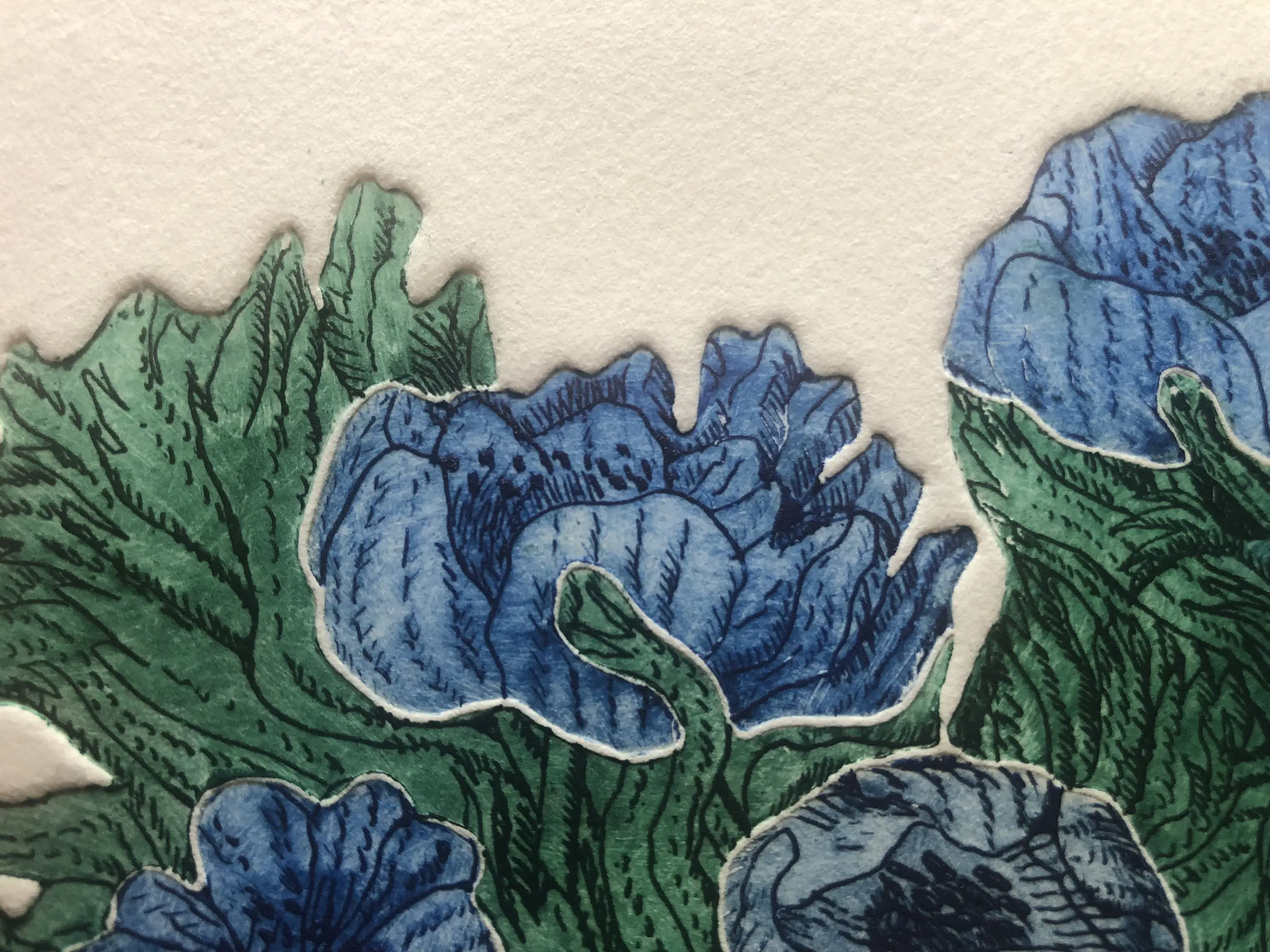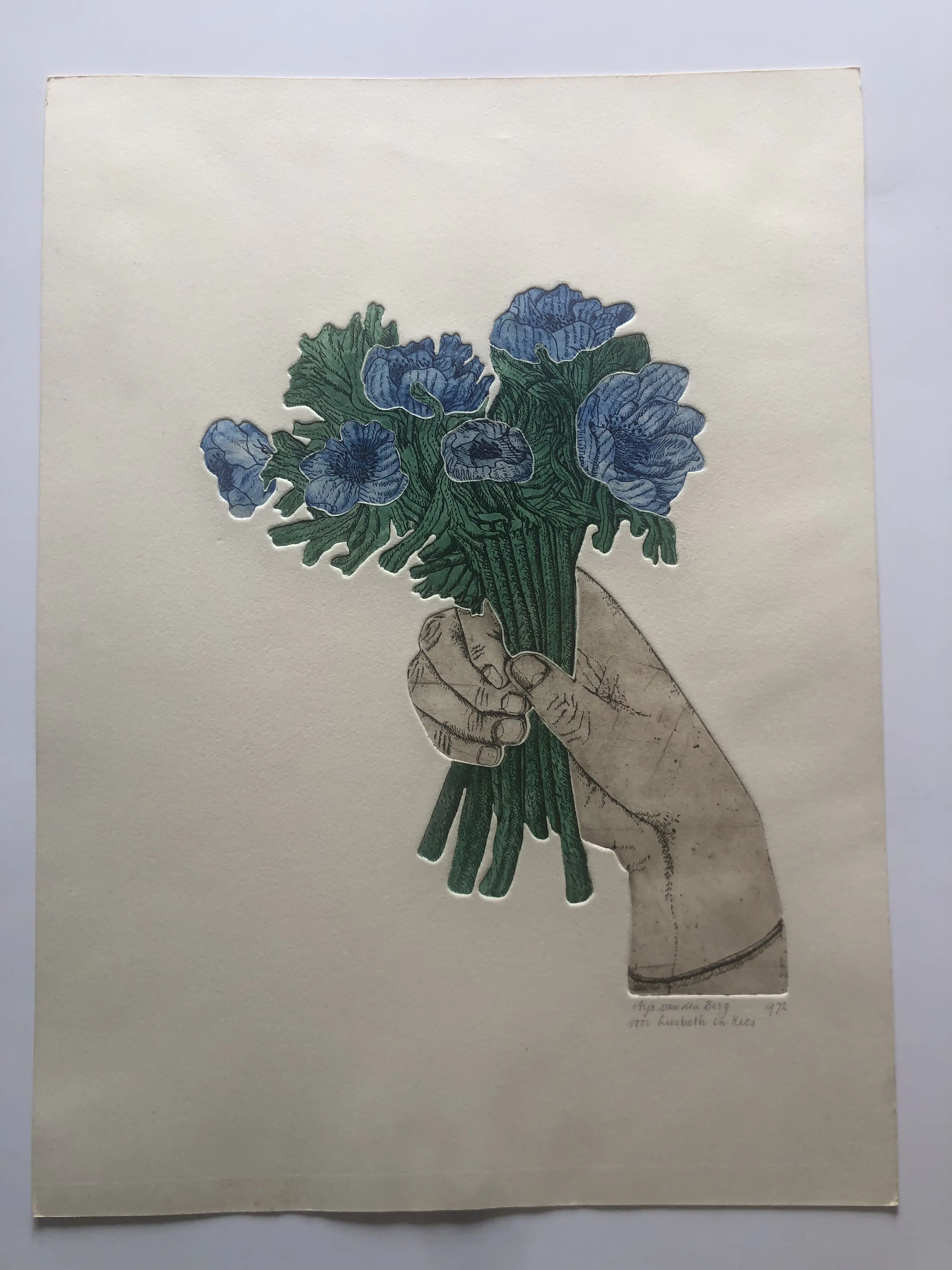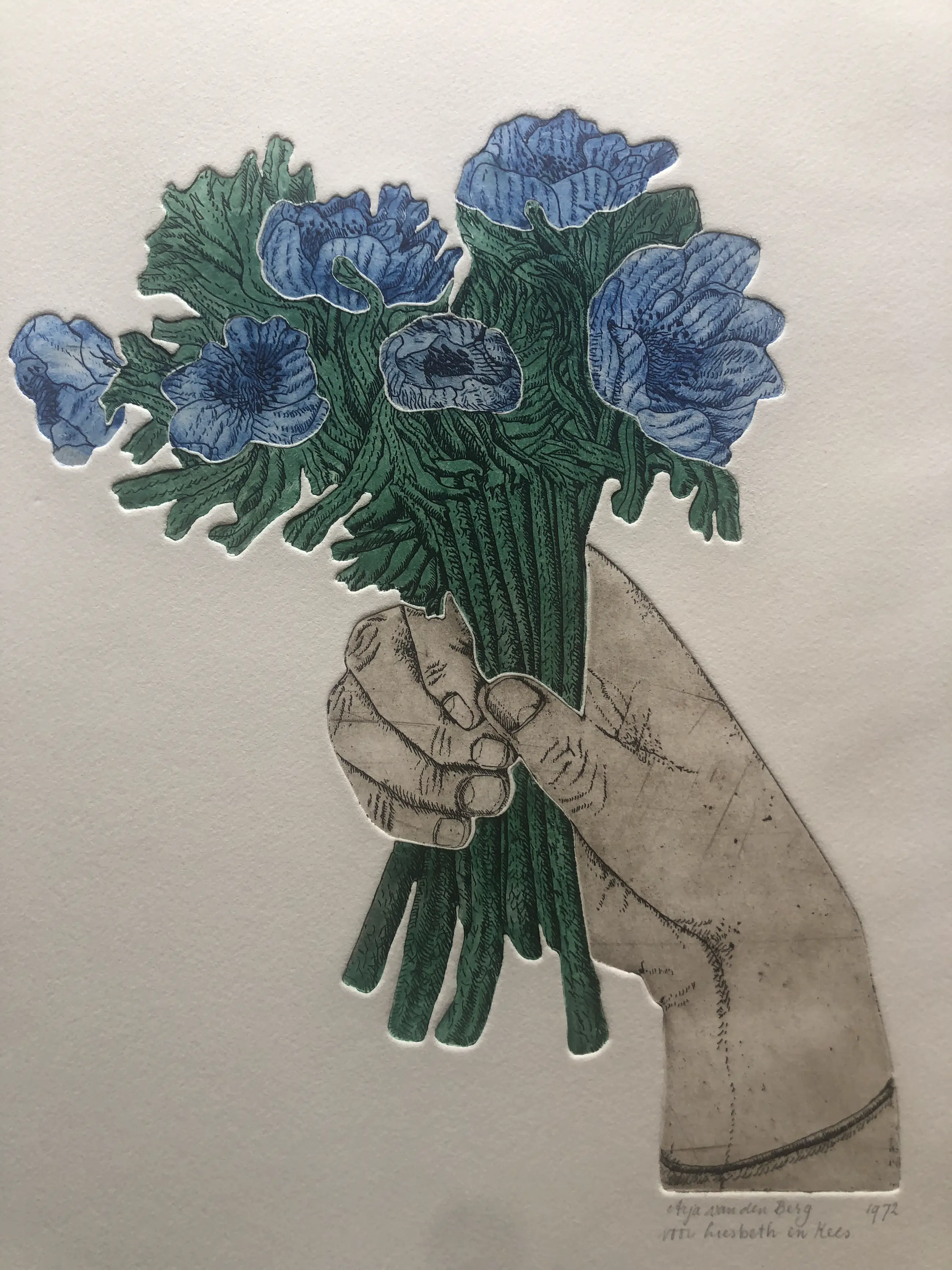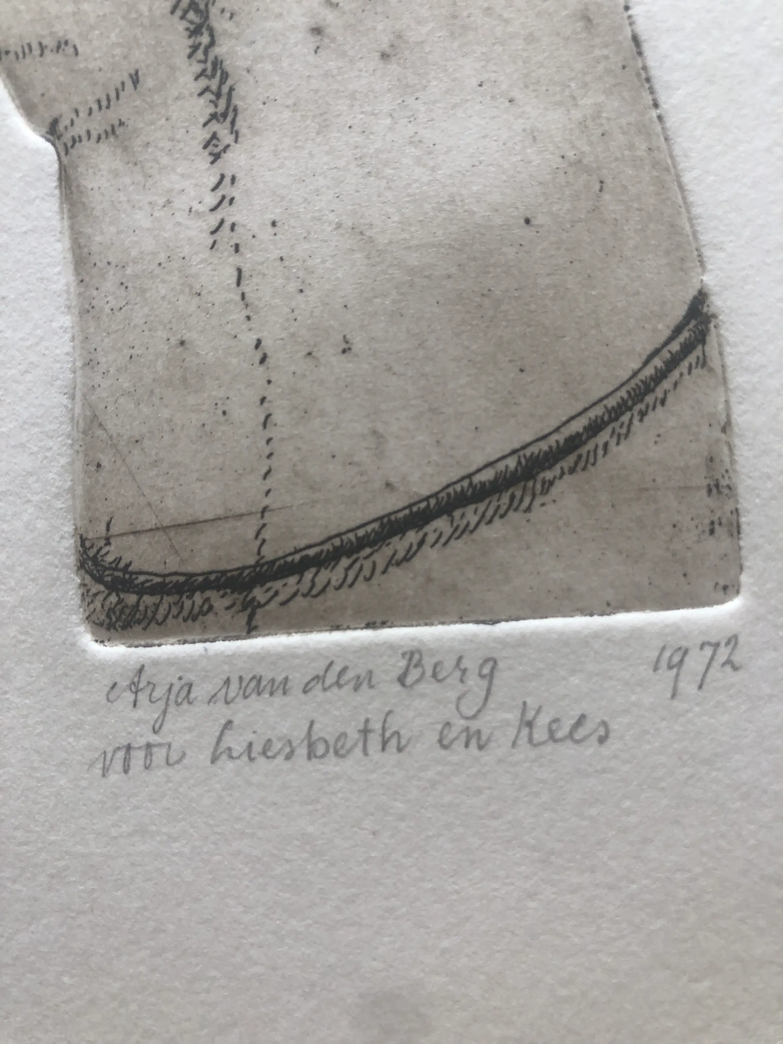 Ets, waarschijnlijk met de hand ingekleurd. Annotatie in potlood (voor Liesbeth en Kees) Uit te gummen als men het stoort.