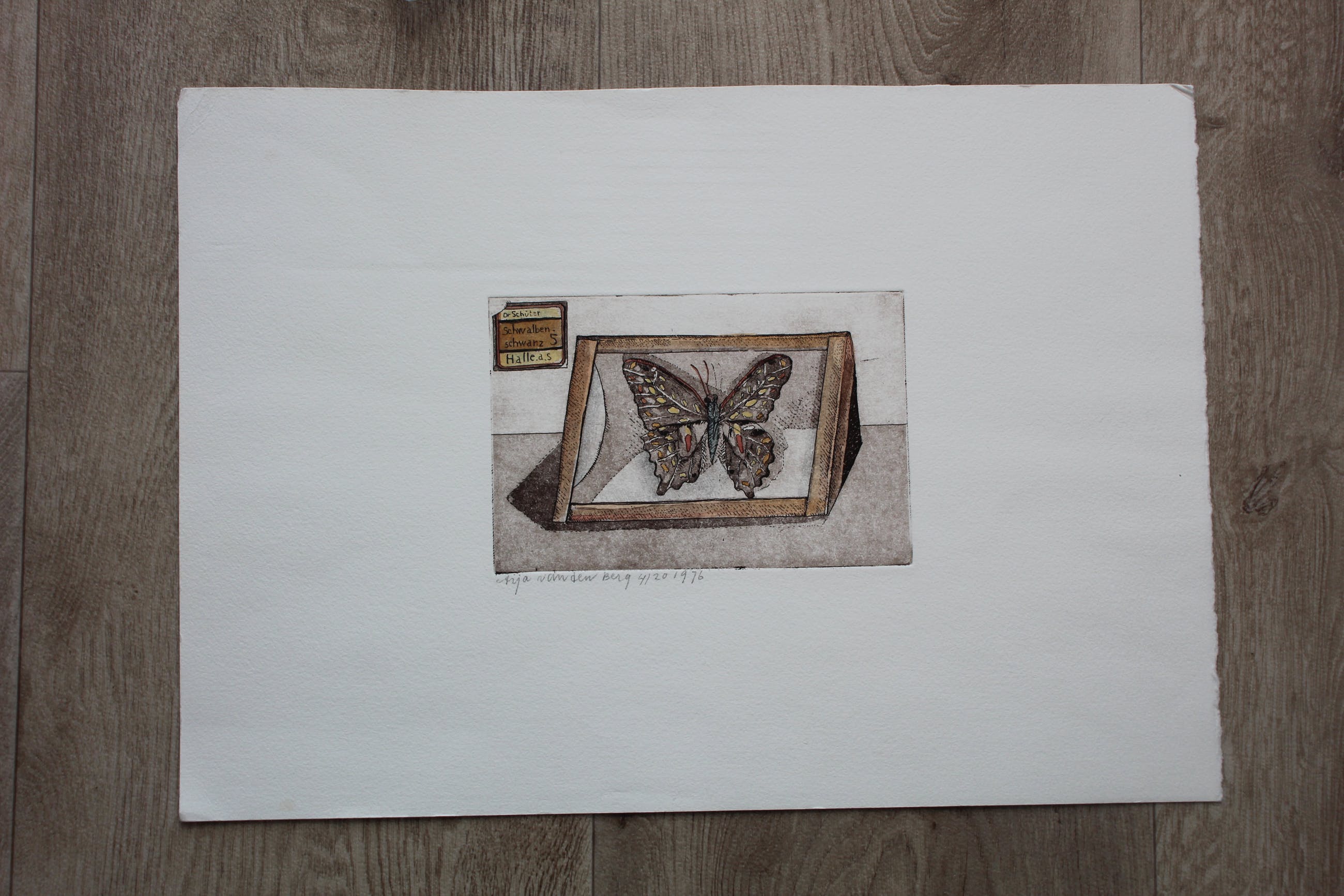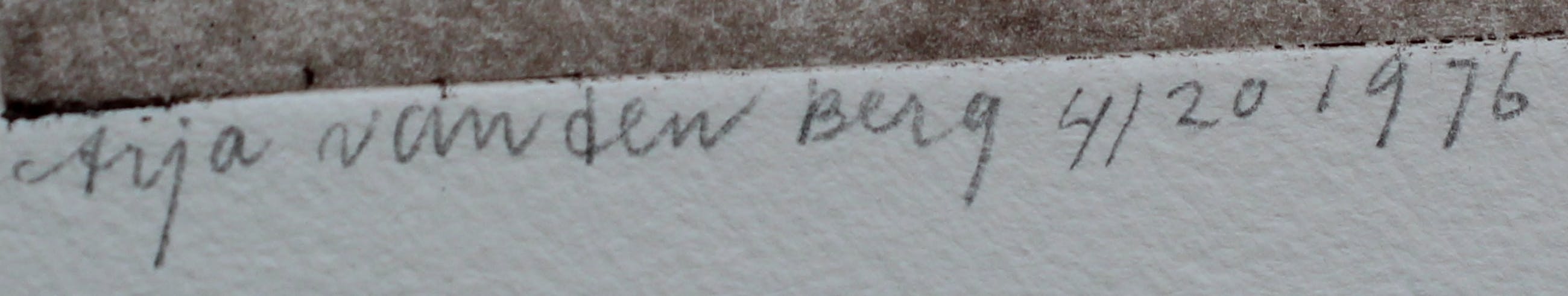 Ets van Arja van den Berg. Arja van den Berg is aangesloten bij de Haagse kunstenaarsvereniging Pulchri. Jaar: 1976. Nummer: 4/20. Afmetingen blad: H26 x b37cm. Afmetingen voorstelling: H9.5 x b15cm. Het werk is linksonder, met potlood, gesigneerd door de kunstenares. De authenticiteit van dit werk wordt volledig gegarandeerd. Een certificaat van echtheid kan, op aanvraag, worden gemaild.