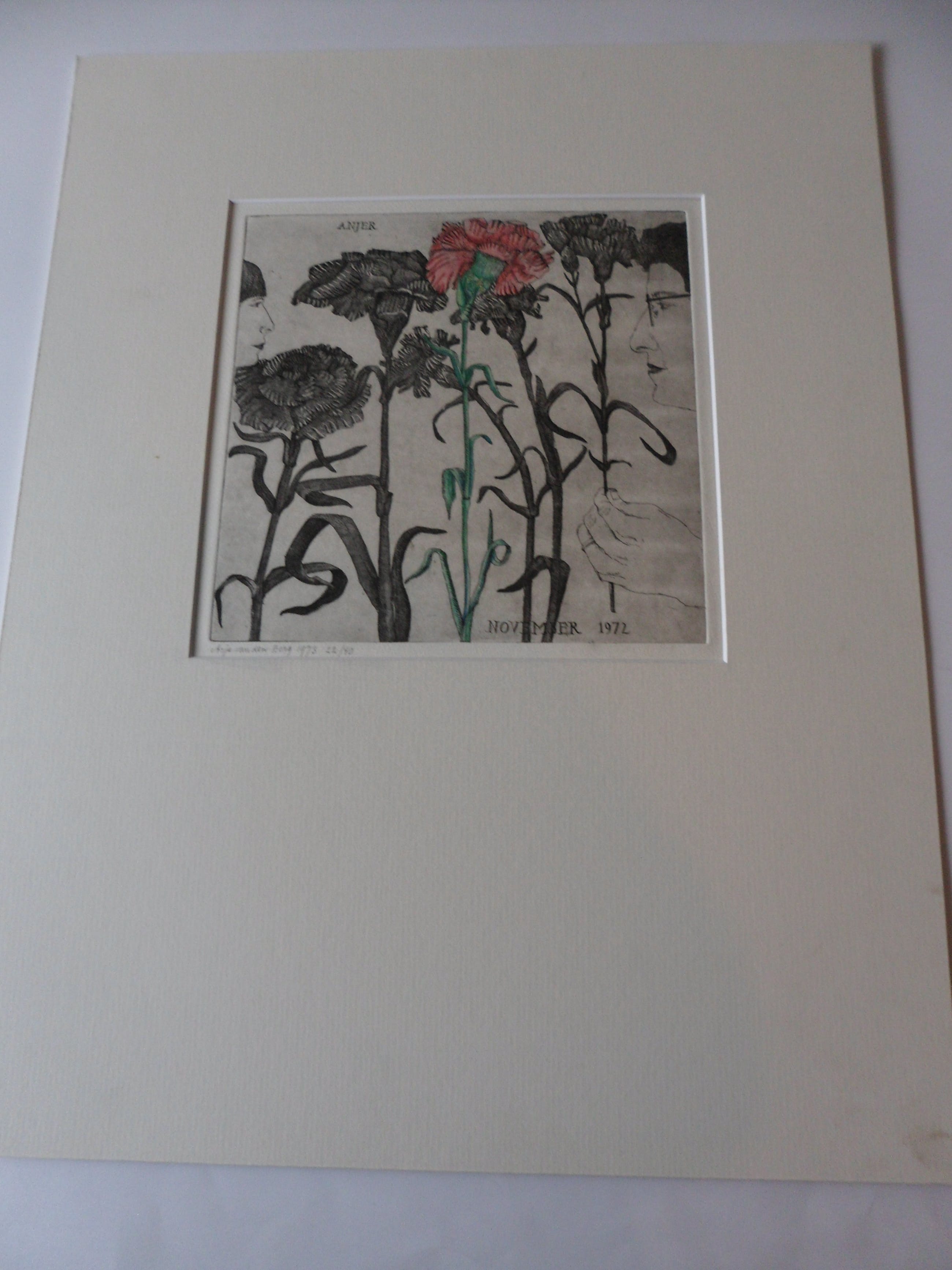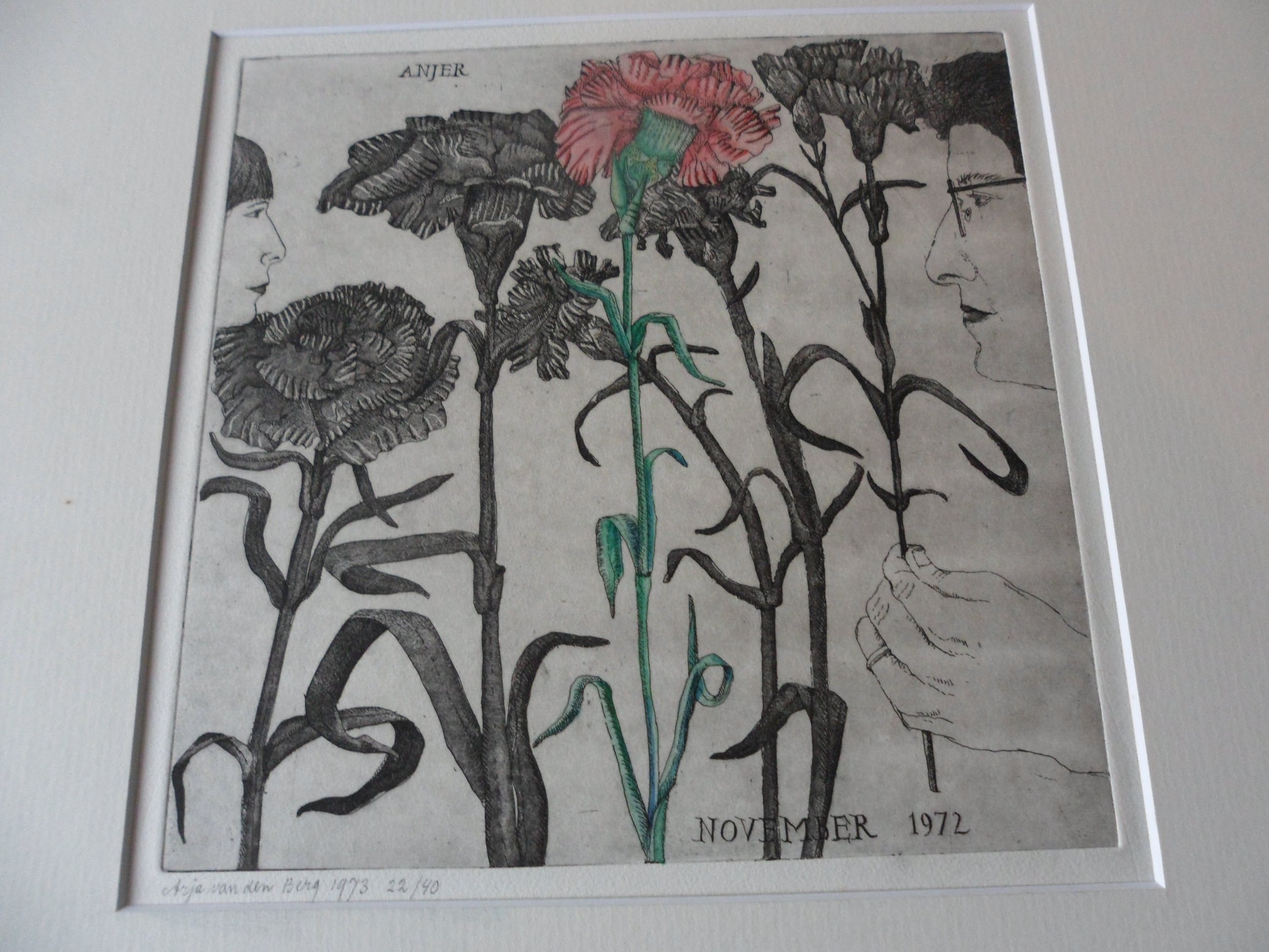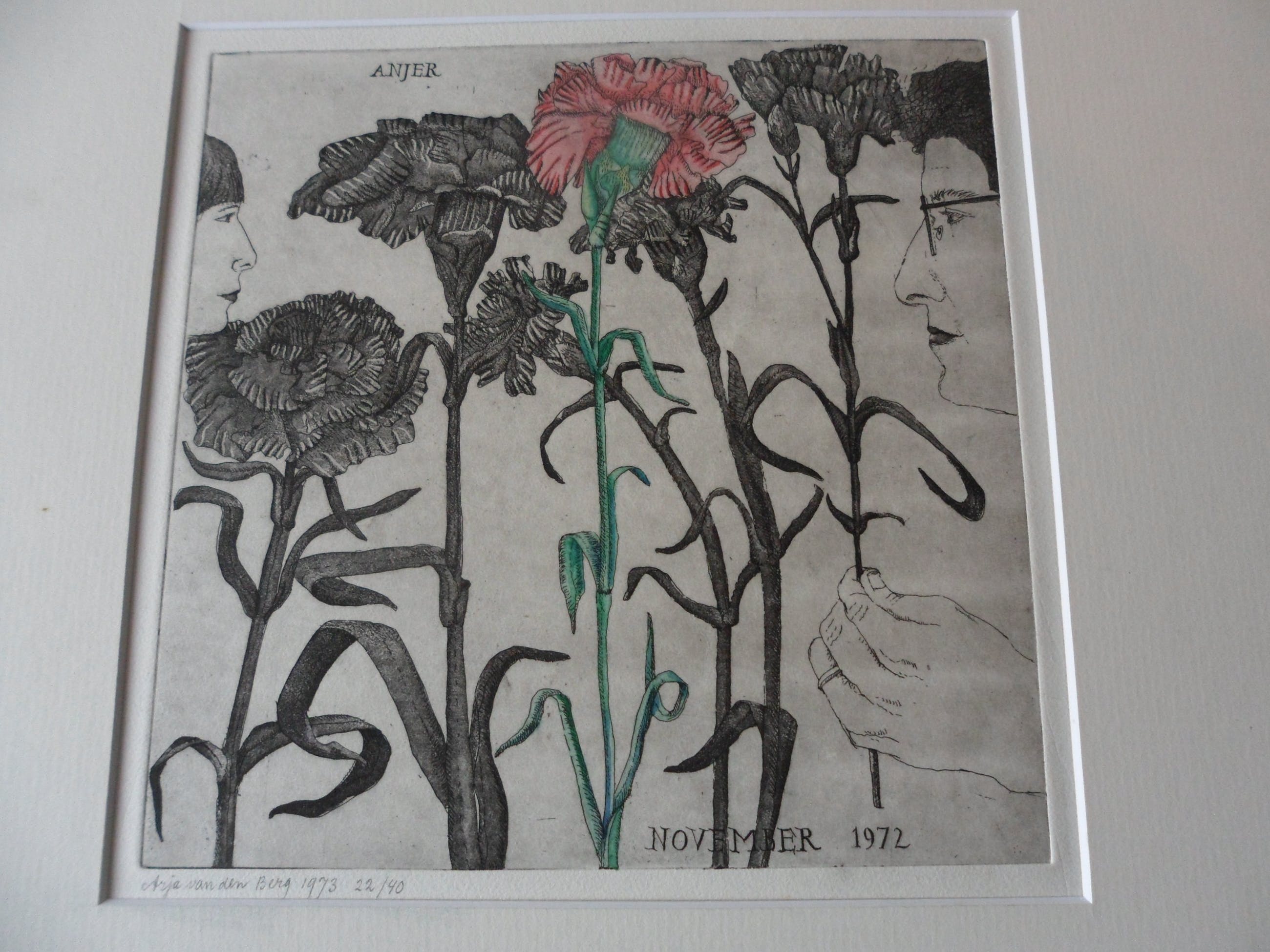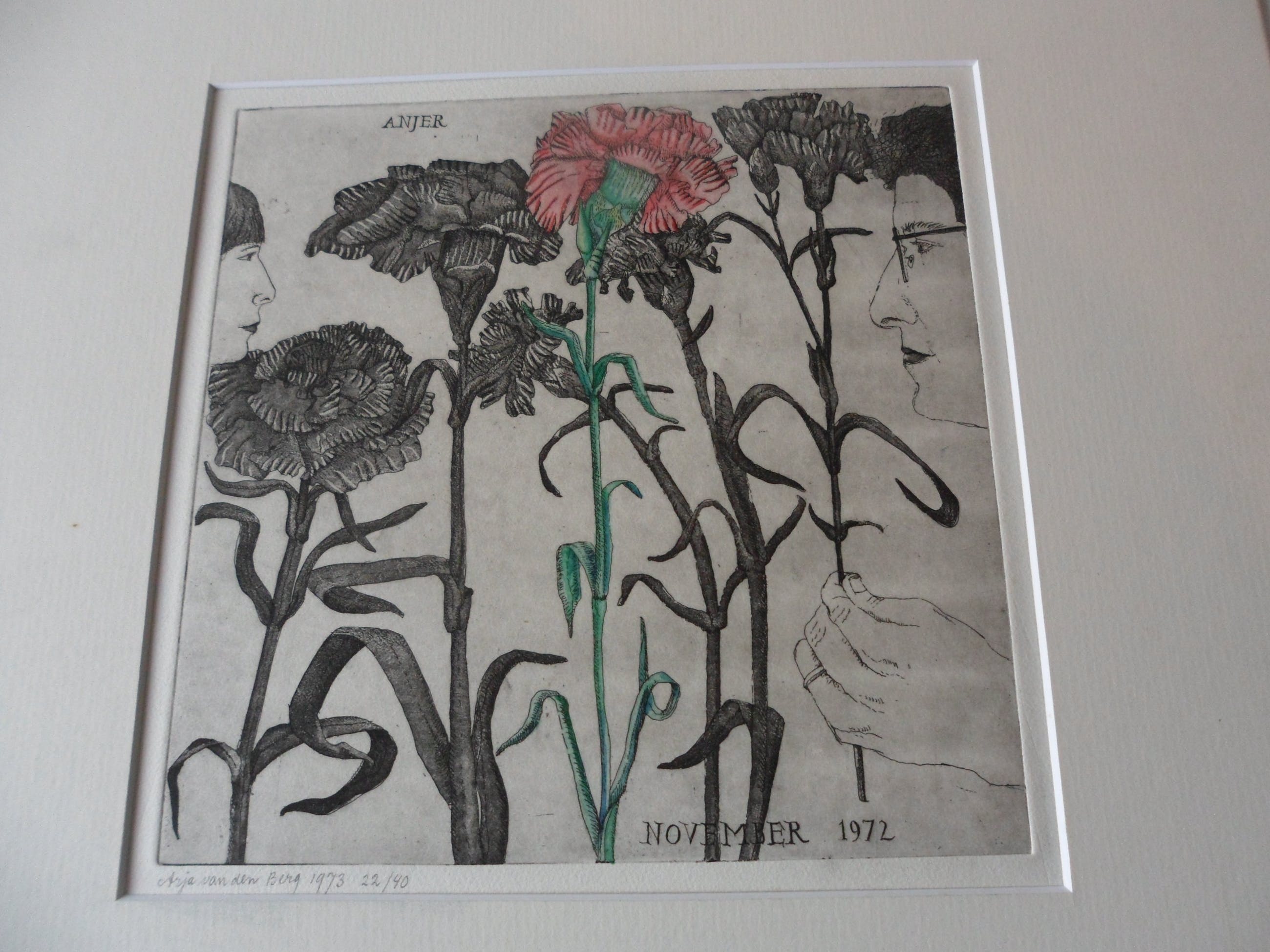 Bijzondere ets hand ingekleurd door Arja van den berg waardoor iedere ets uniek is. Kleine oplage en uitstekende conditie