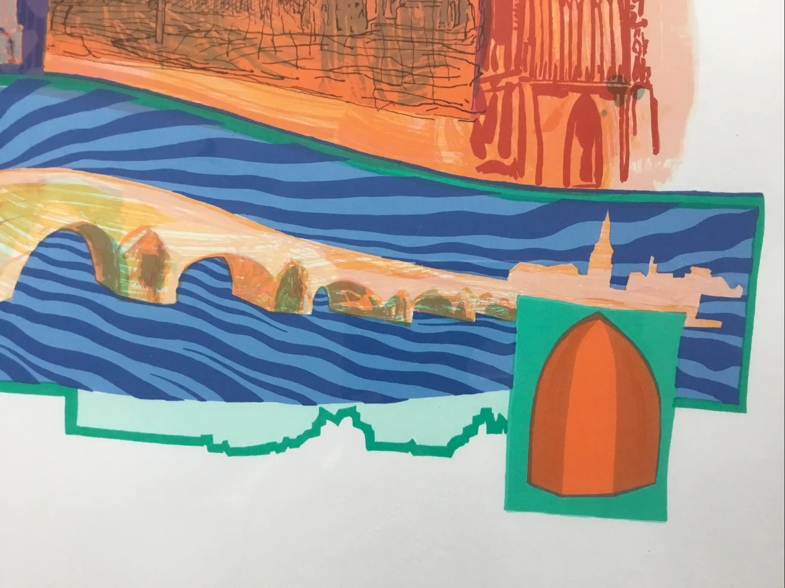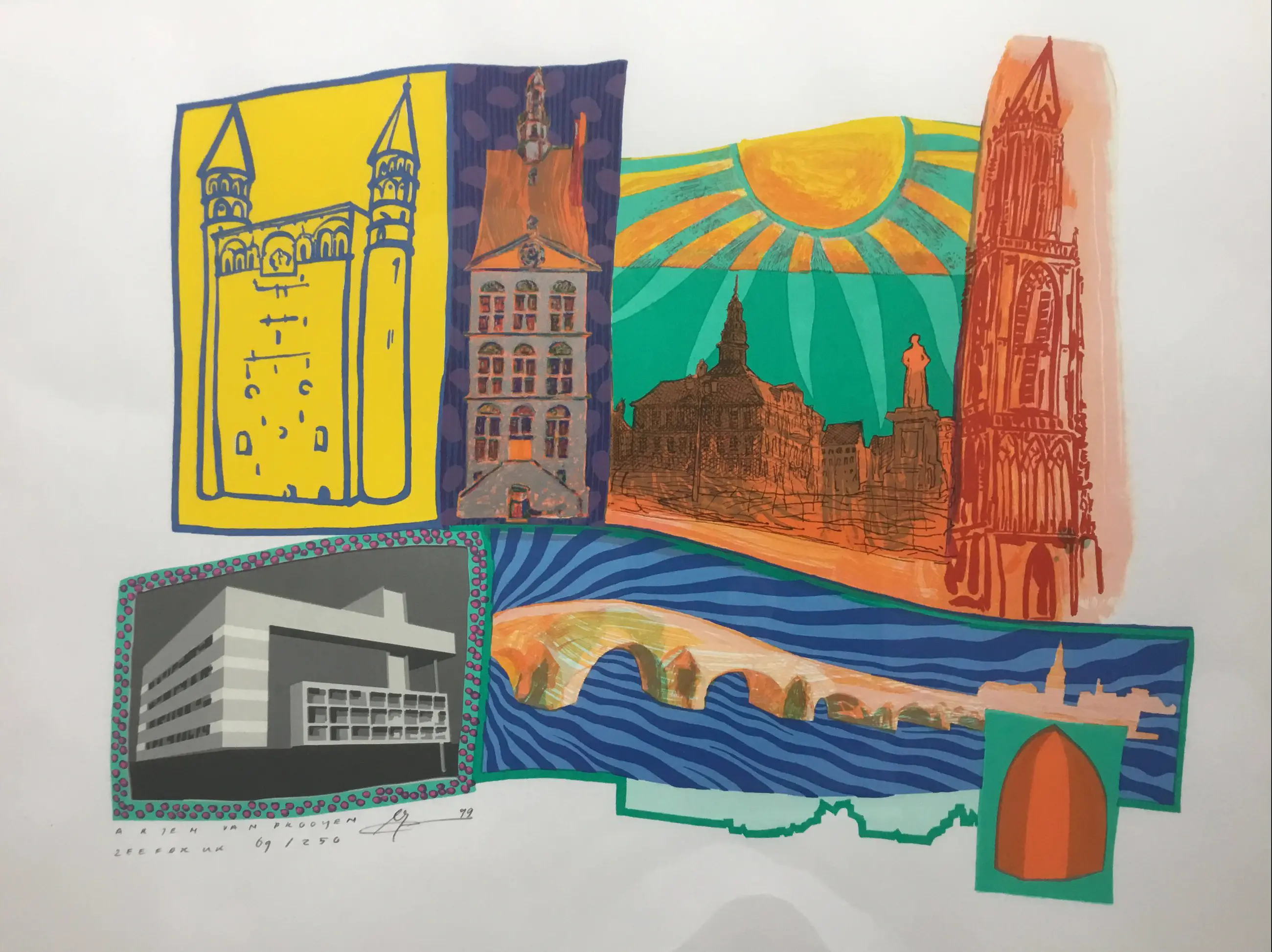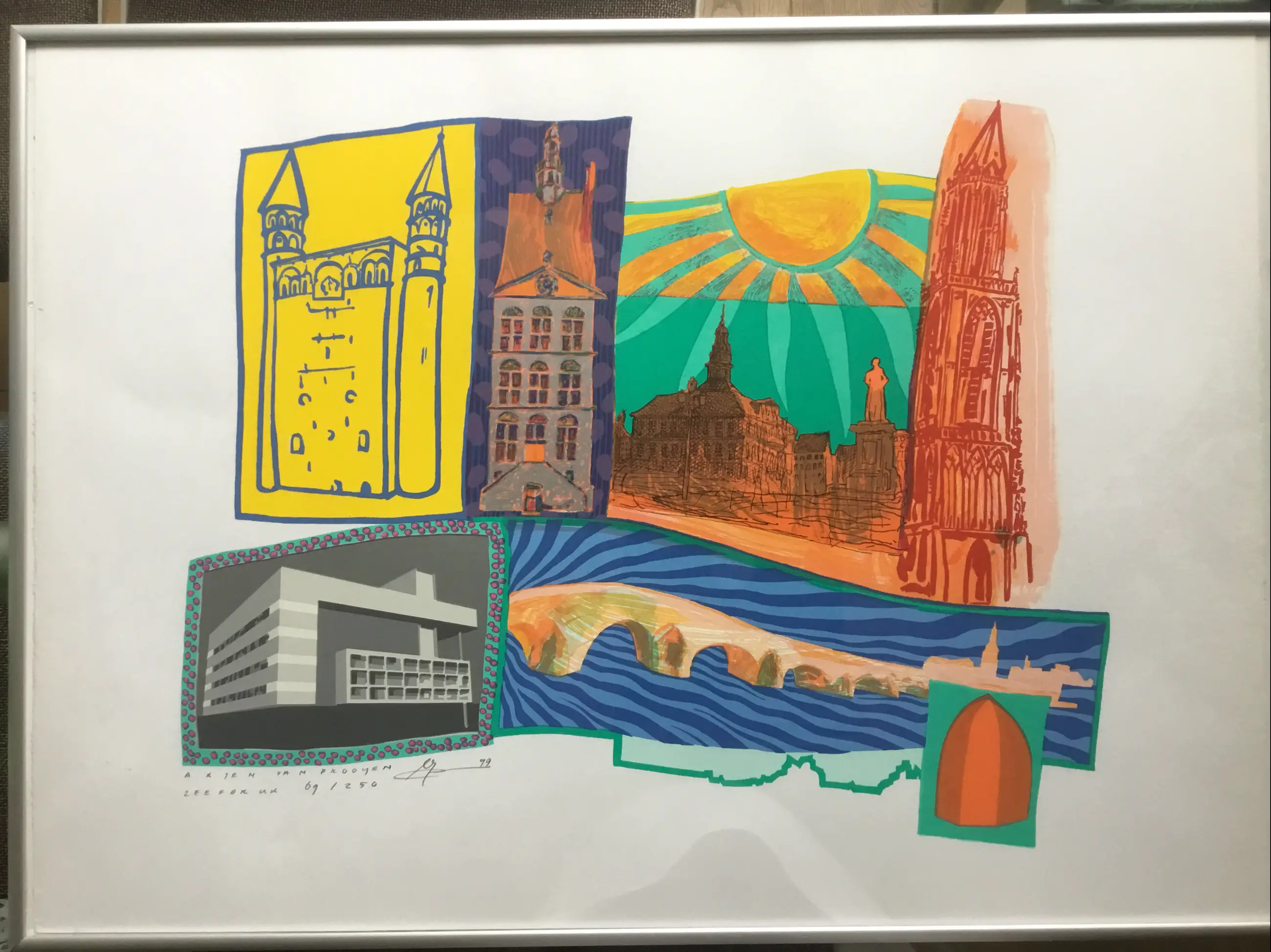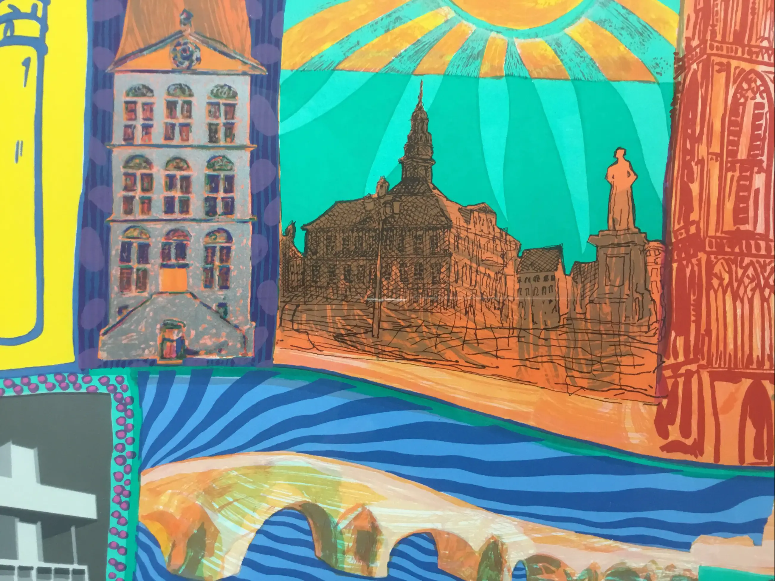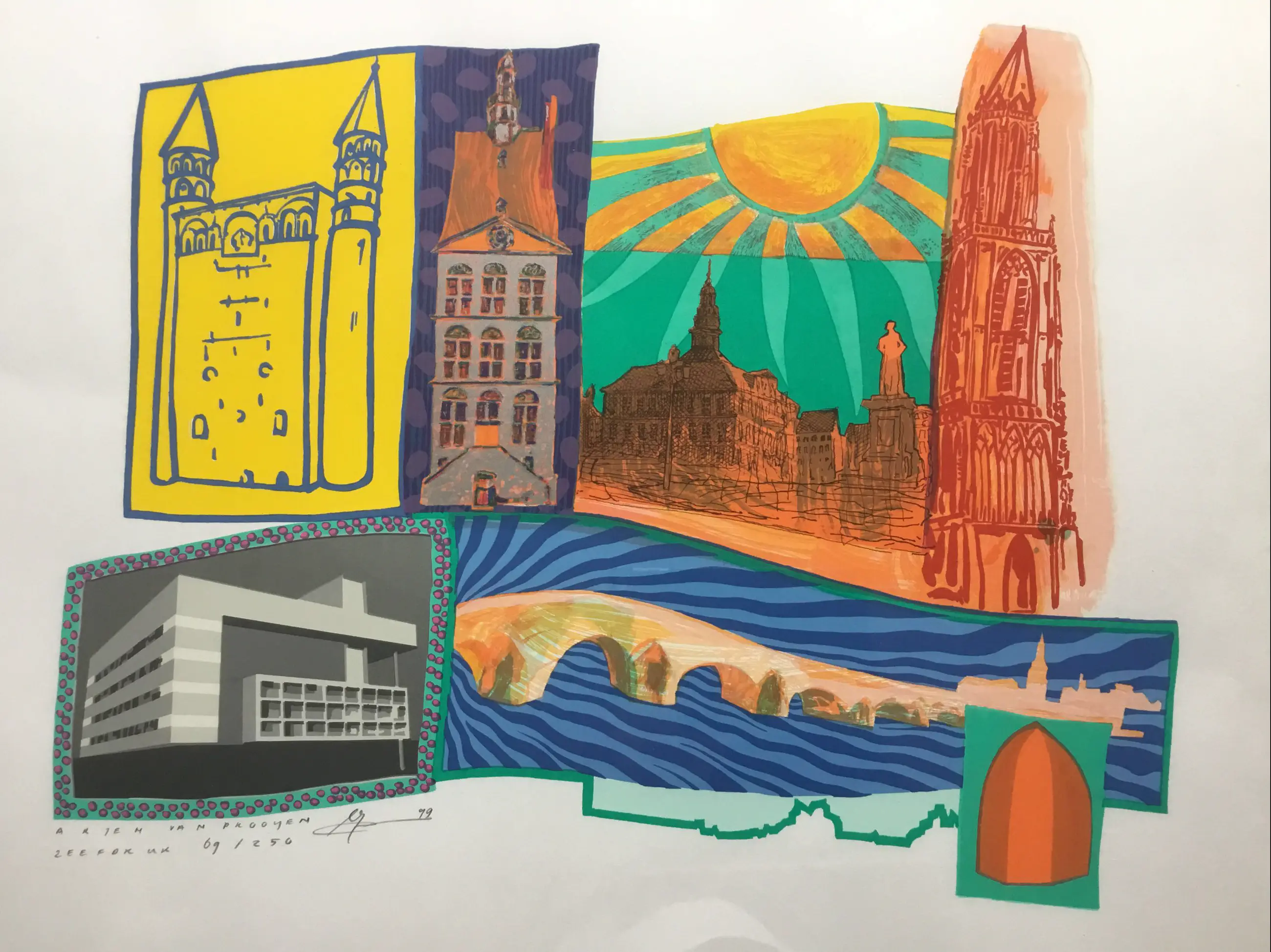 Kleurrijke zeefdruk met bekende gebouwen van Maastricht