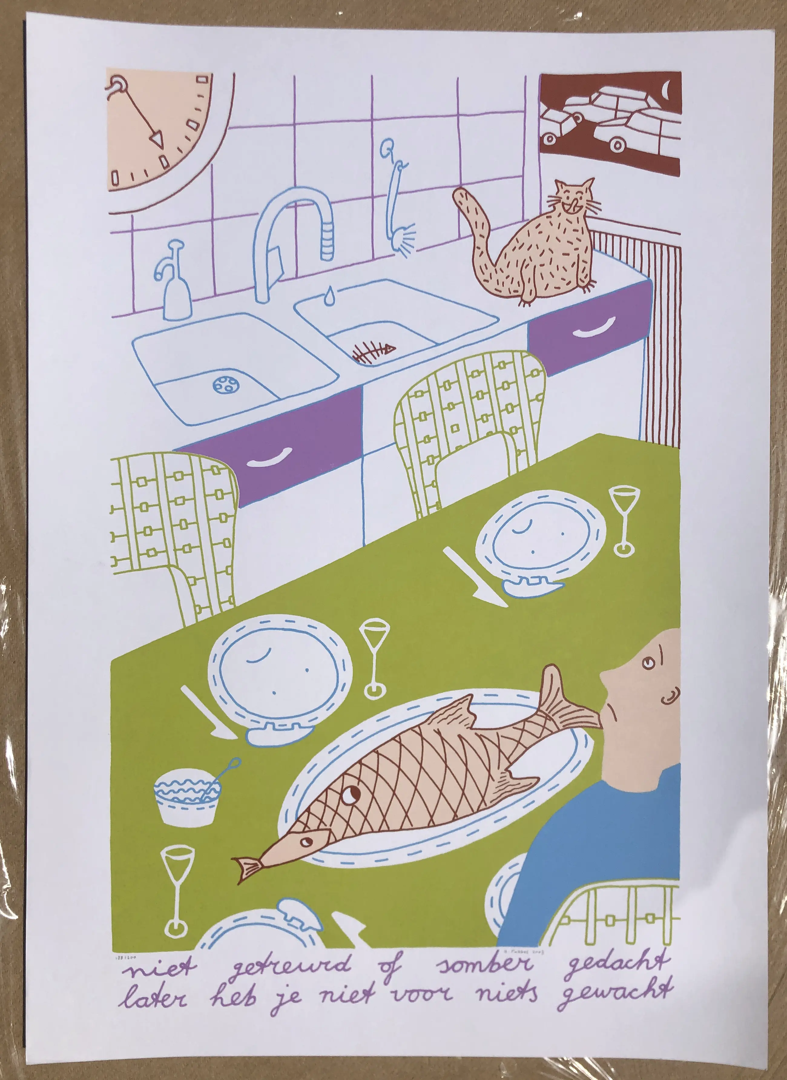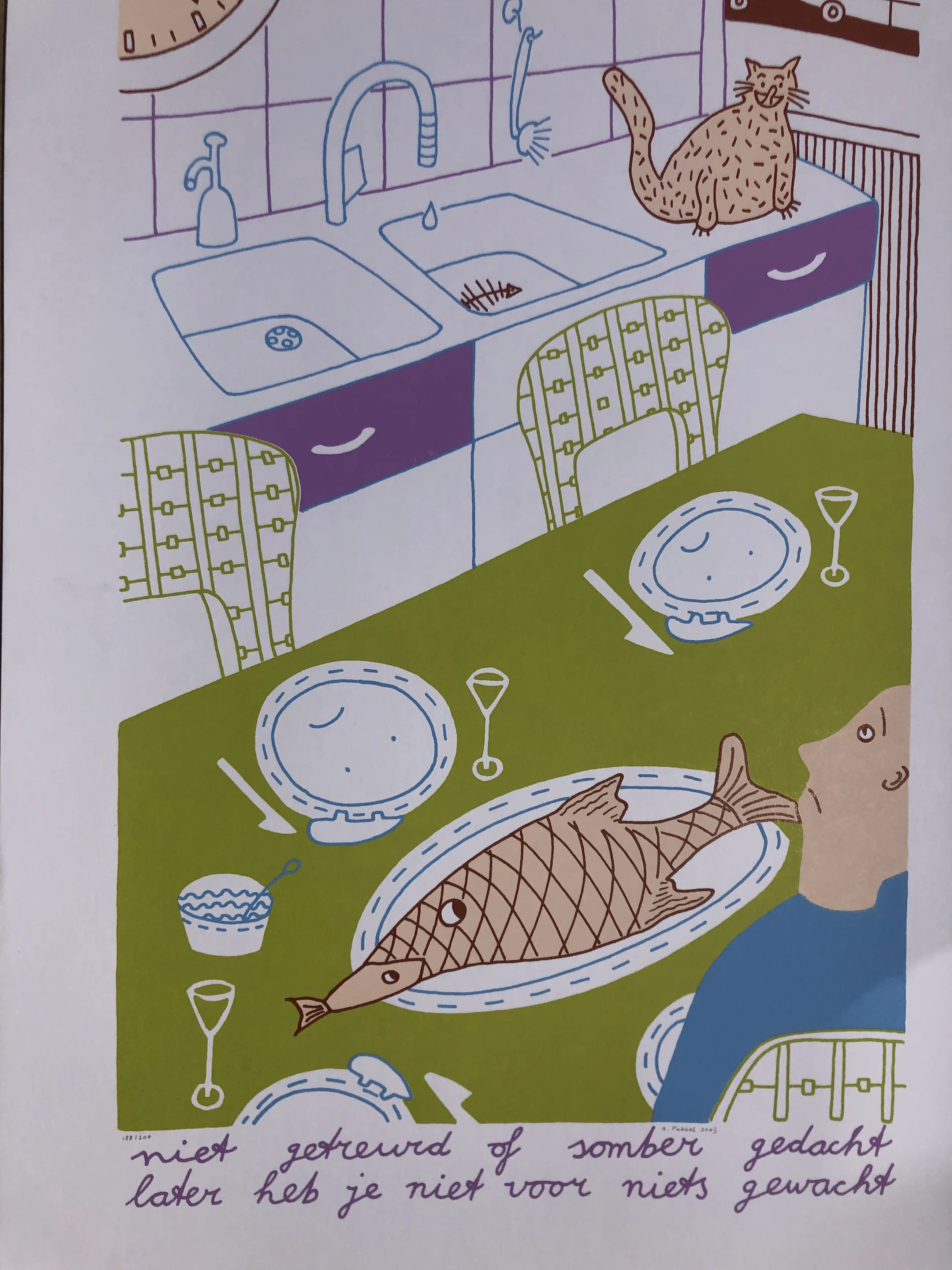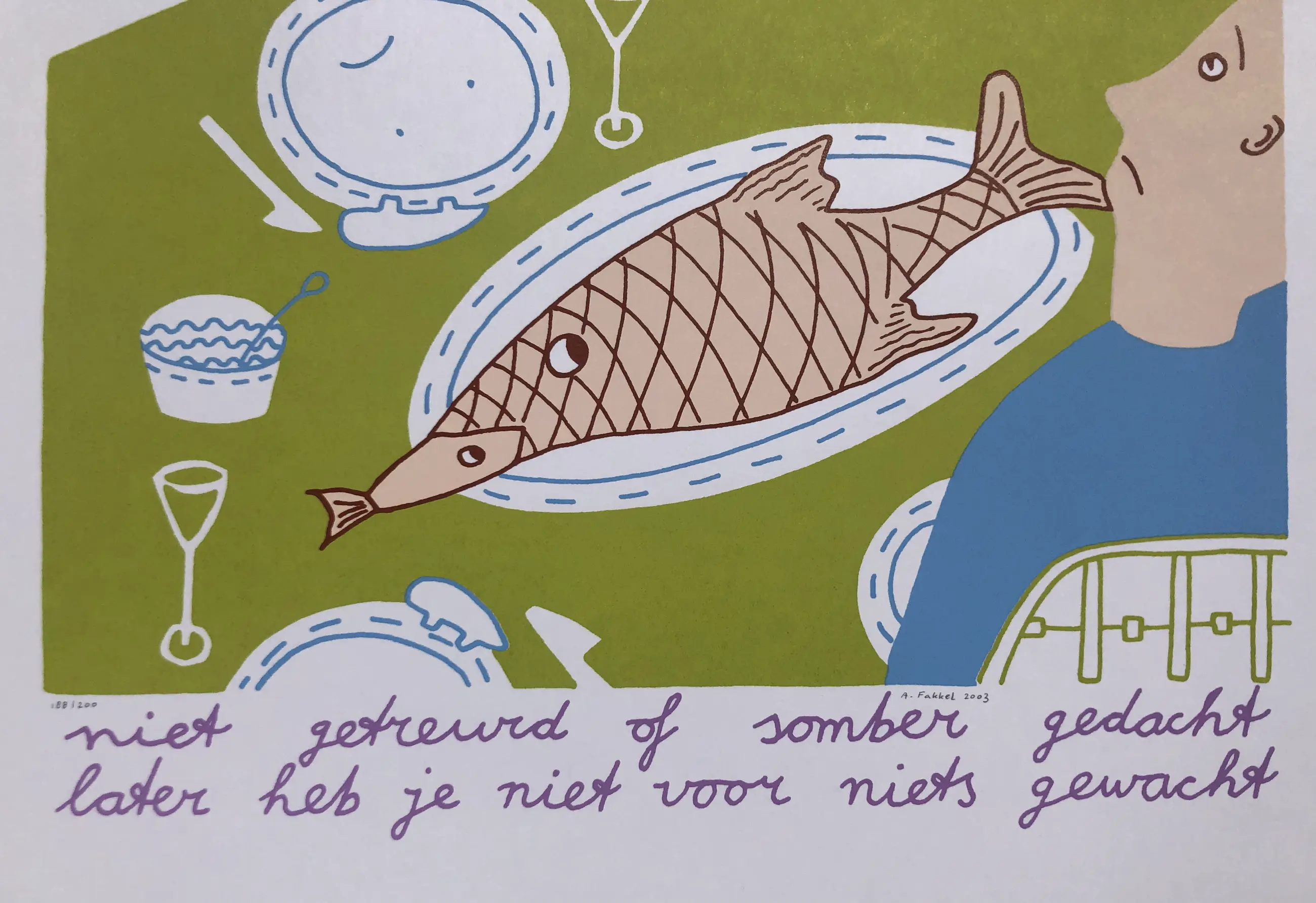 Zeefdruk van Arjenne Fakkel met de titel: niet getreurd of somber gedacht, later heb je niet voor niets gewacht. Nummer: 147/190. Jaar: 2003. Afmetingen: h70 x b50 cm.