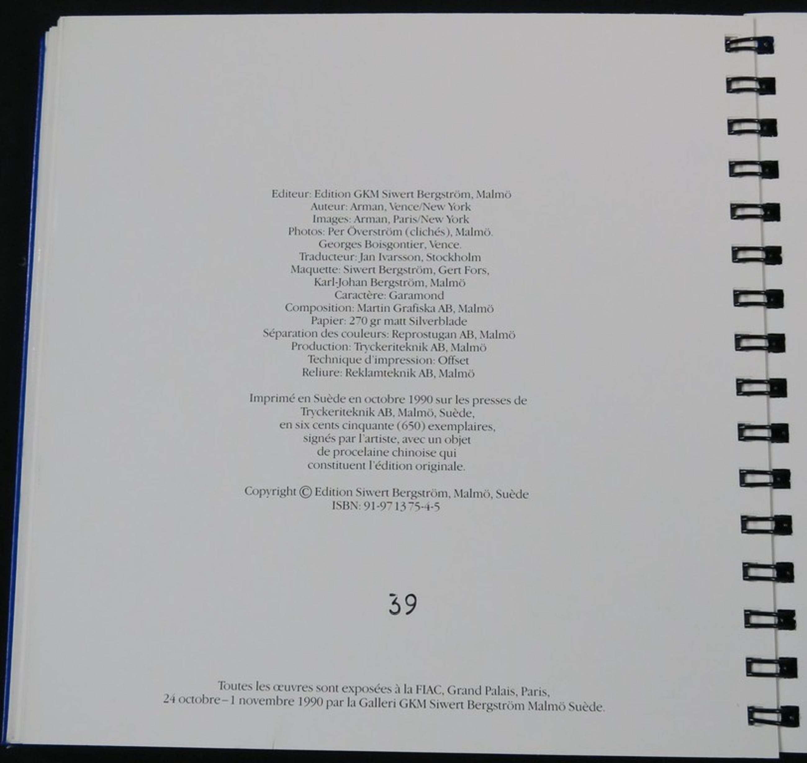 Deze catalogus is uitgebracht ten tijde van de Internationale kunstbeurs FIAC in Parijs in 1990. 650 exemplaren zijn door de kunstenaar op de voorzijde gesigneerd en hebben op de cover een 'ingelijste' compositie van gebroken Chinees porselein.