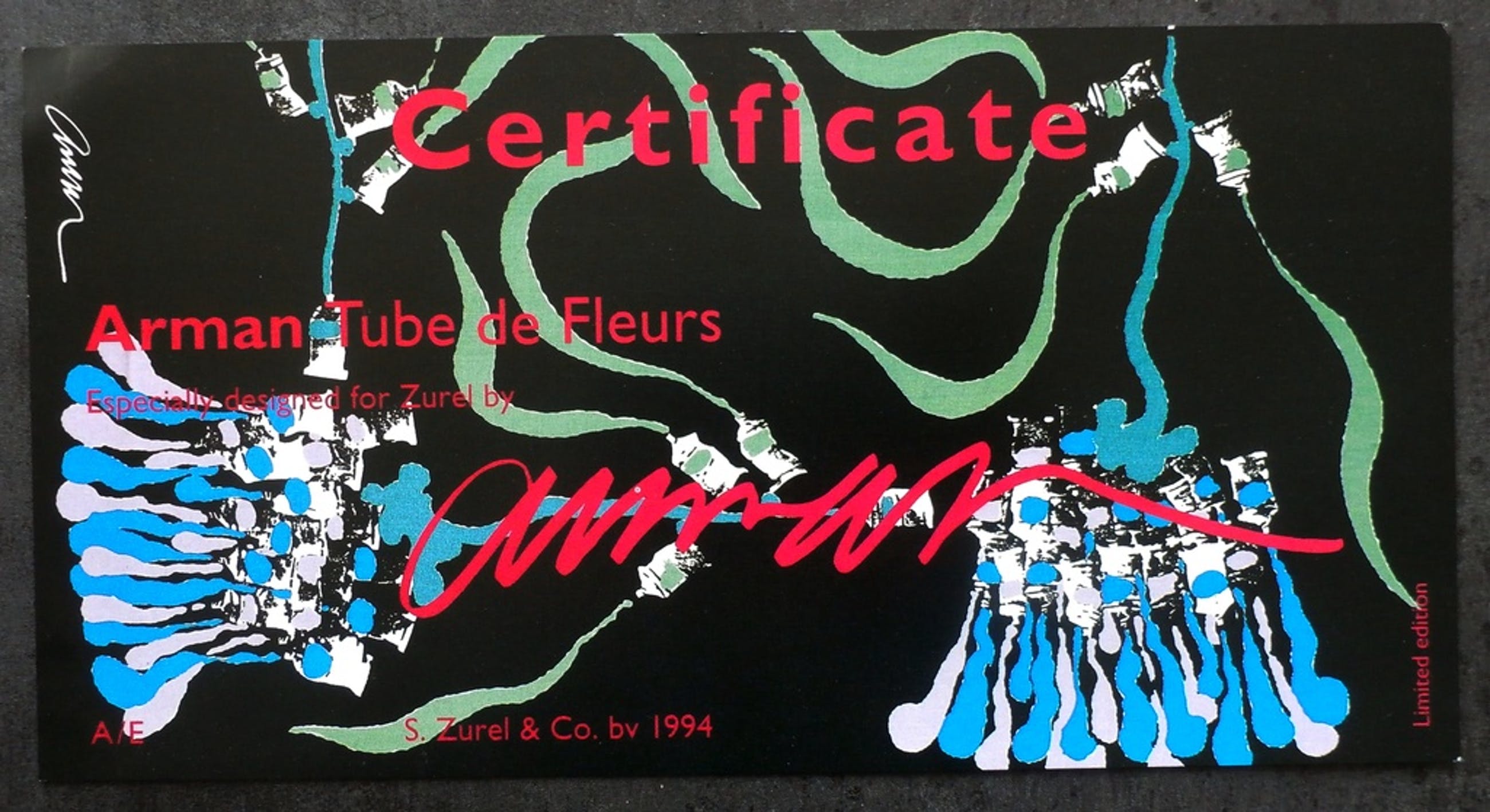 Nieuwe stropdas van de zero kunstenaar Arman. Jaar: 1994. Titel: Tubes de Fleurs. Uitgegeven door Zurel. De stropdas is gemaakt van 100% zijde. Conditie: in nieuw staat. Er wordt een certificaat bij de stropdas geleverd.
