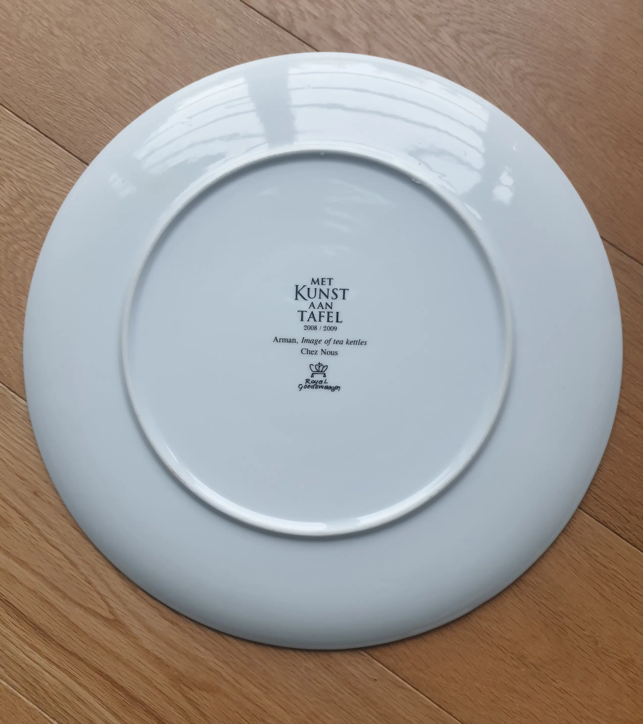 Porseleinen (Royal Goedewaagen) bord van Arman uit 2008/2009. Het bord was uitgegeven bij de gelegenheid "Met Kunst aan Tafel". Voorstelling "Image of Tea Kettles". Diameter 32 cm. Het bord wordt aangetekend verstuurd, maar kan ook afgehaald worden.