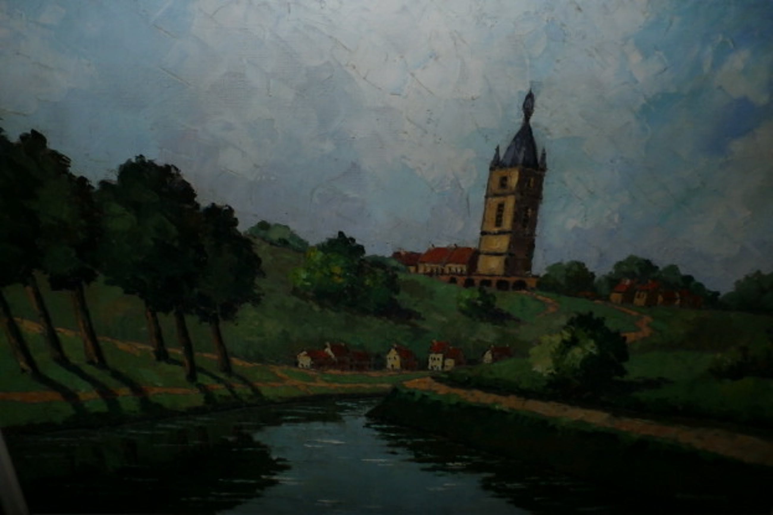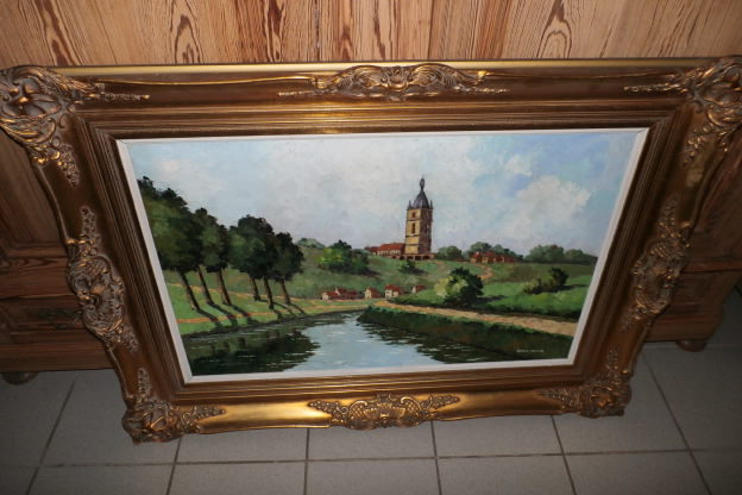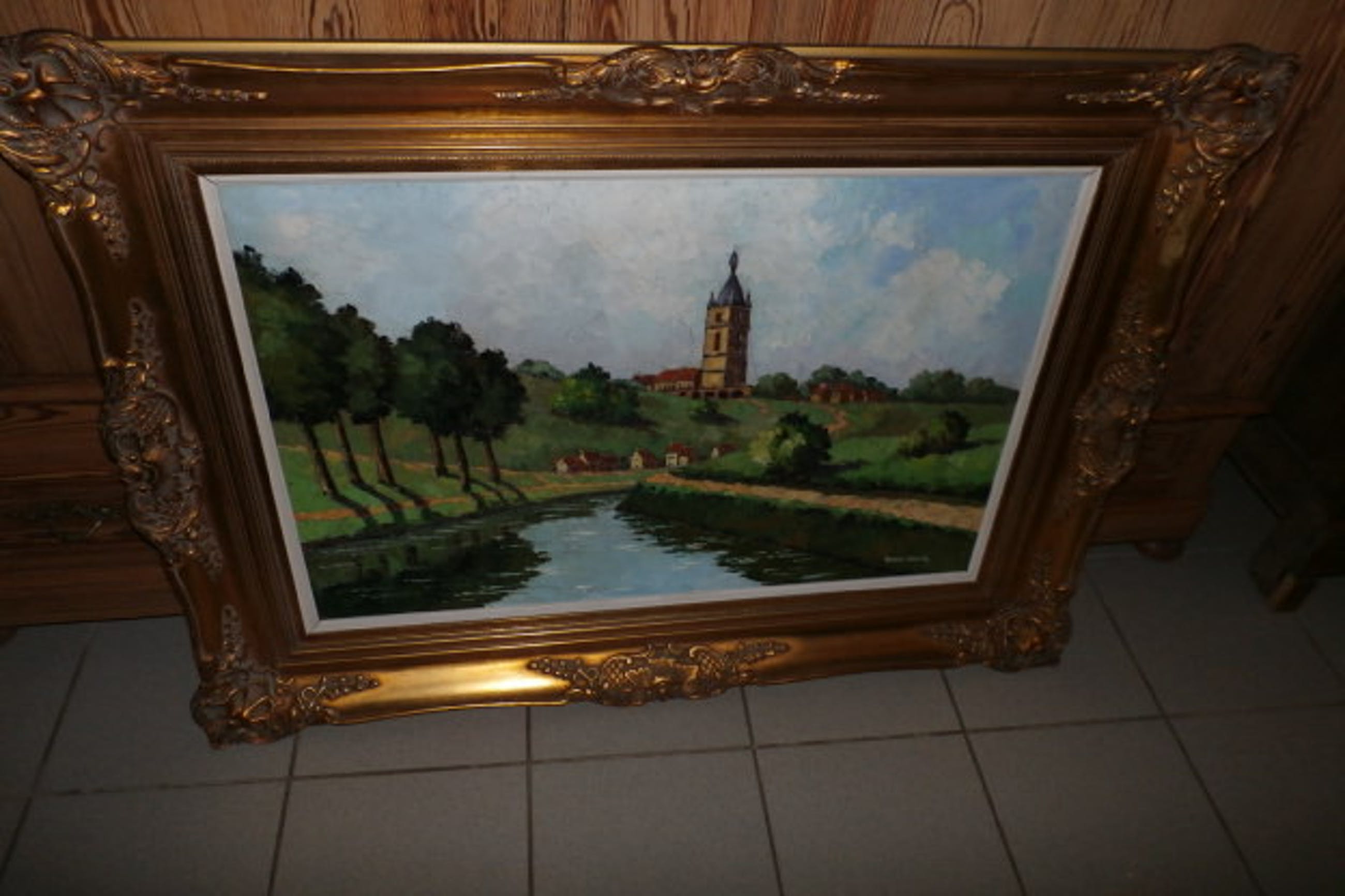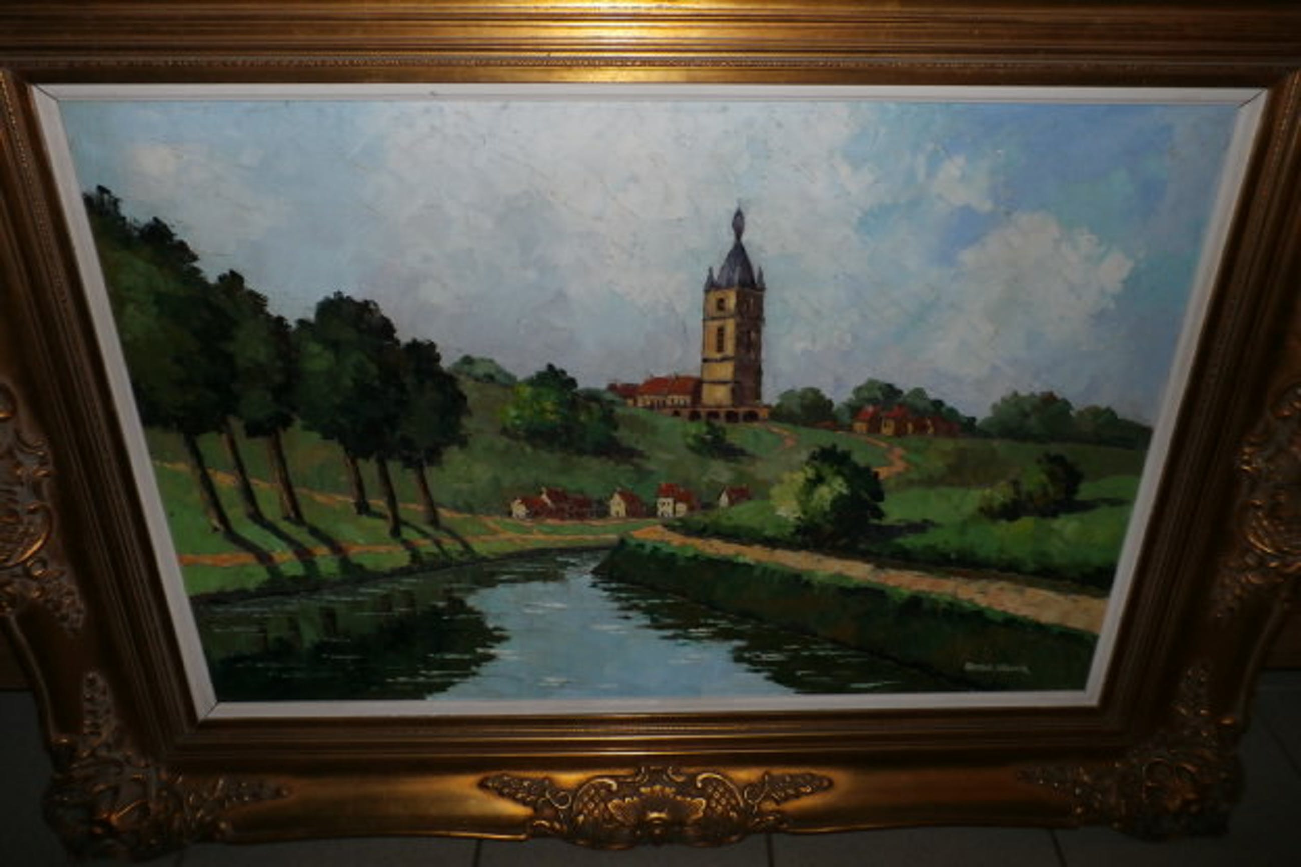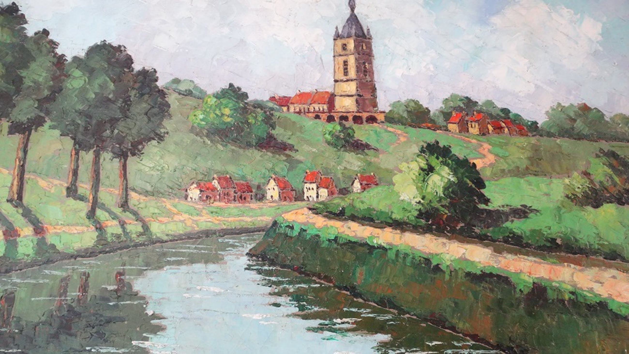 Armand Lacour "zeer groot dorpszicht" (1910-1970) olieverf op doek 1 kleine restauratie gesigneerd: Armand Lacour afmetingen inclusief lijst: 118cm op 90cm enkel af te halen in Wezemaal Belgie