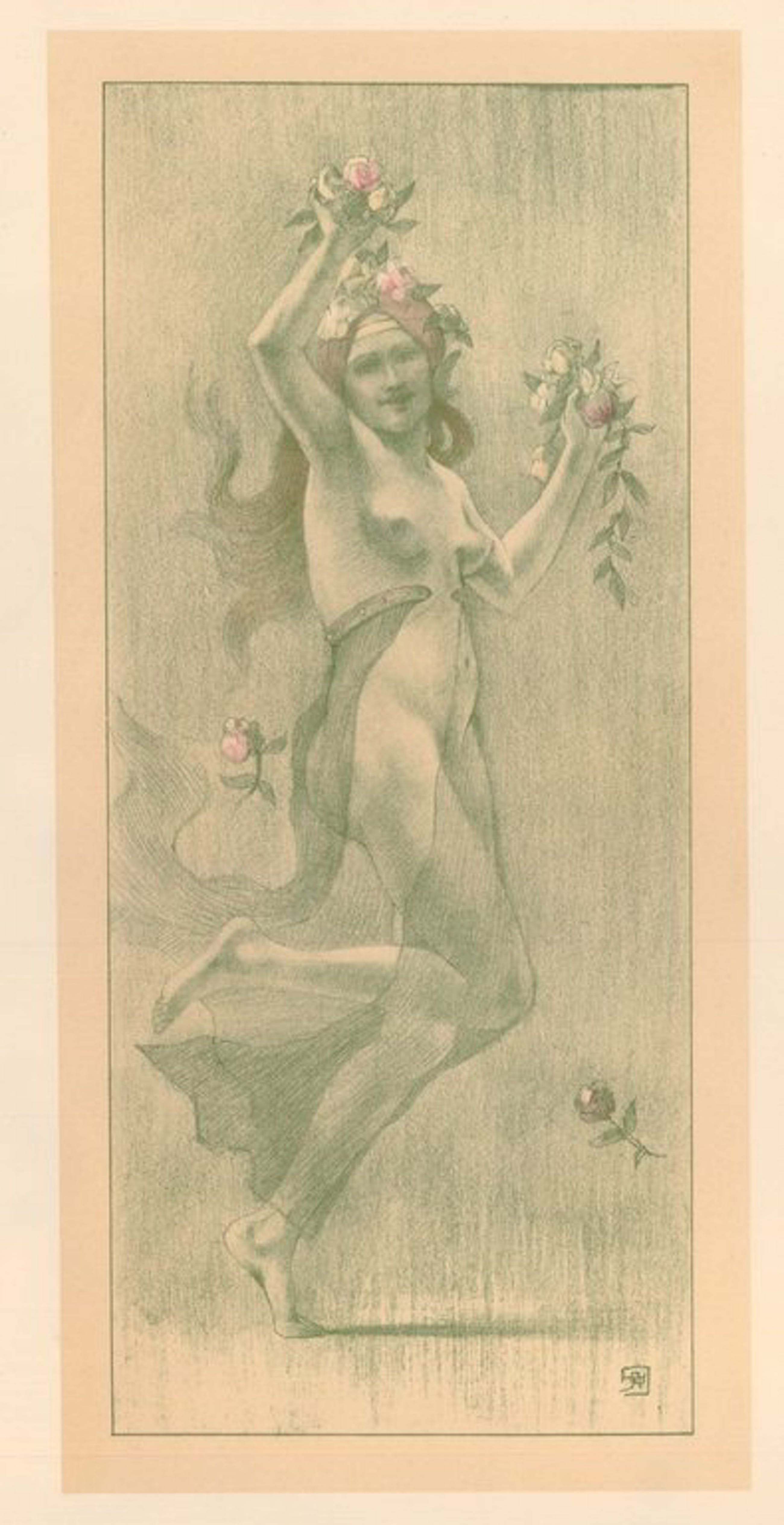 Lithografie in twee kleuren 33,5x16,0 cm op een onbesneden blad van 40.6x30.7 cm. Gesigneerd in de steen met het monogram "ALAR" met op het blad rechtsonder het blindstempel van 'L'Estampe moderne' (Lugt 2790). Compleet met het beschermblad waarop de tekst "Danse / A. Rassenfosse / Estampe en couleurs, originale, inedite / Exécutée spécialement par l'artiste pour l'Estampe moderne.", met het gedicht "Les cheveux noués d'un lien de fleurs, / Une Ionienne aux belles couleurs / Danse sur la mousse au son des kithares.../ Leconte de Lisle / (Poèmes antiques)" en de tekst: "Aux appels langoureux (...) en l'honneur de Dionysos.".