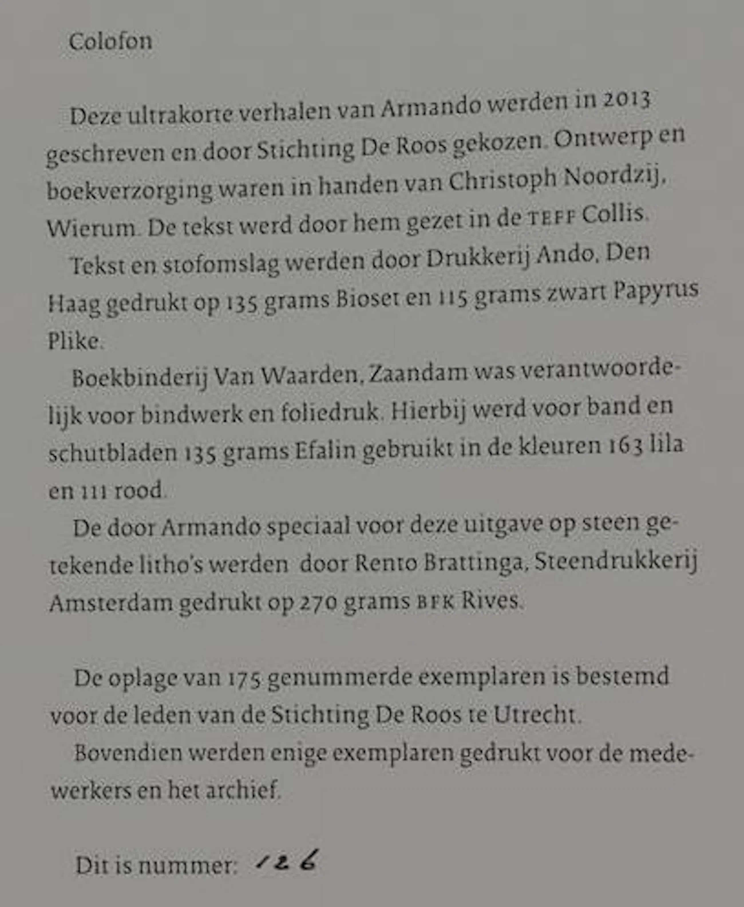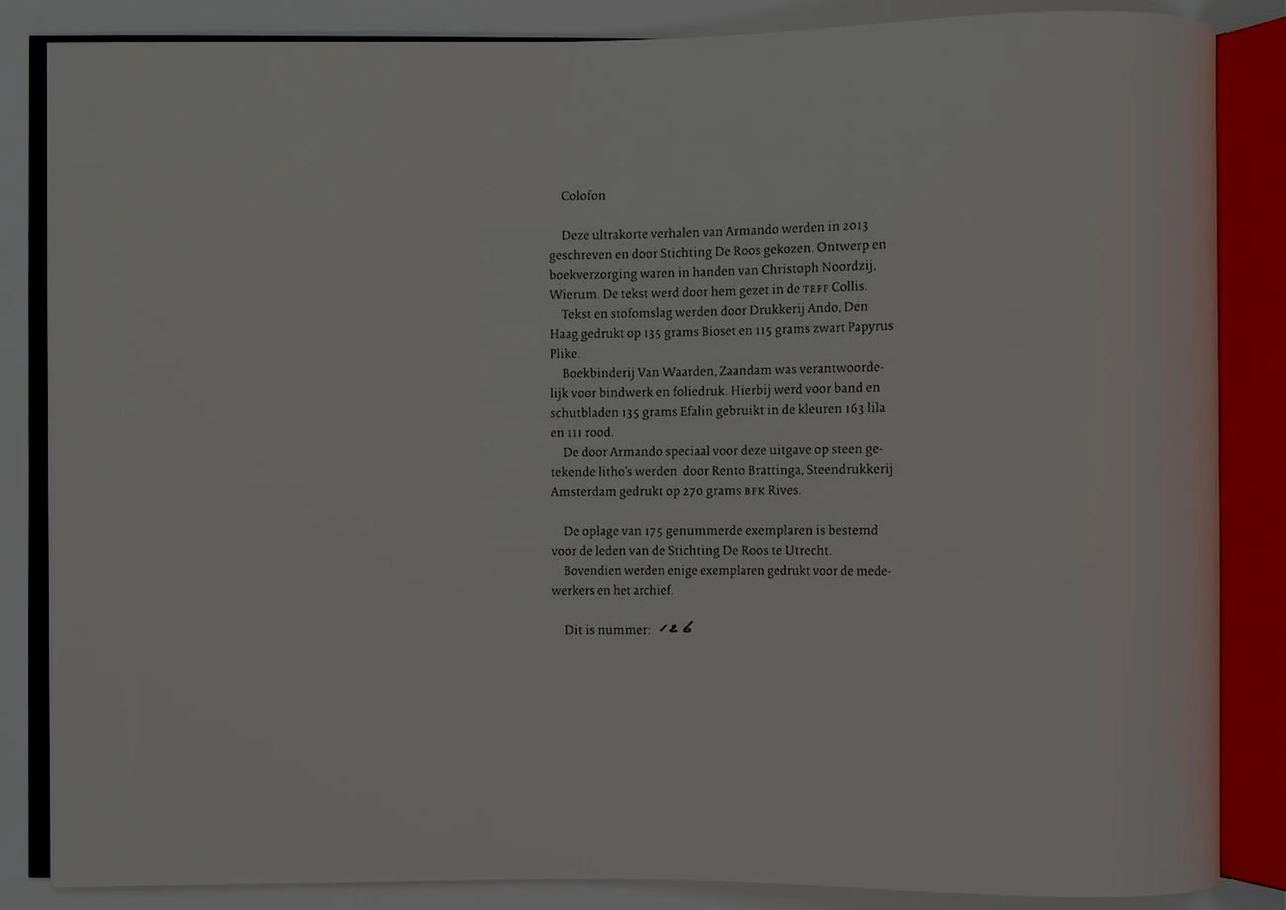 2 lithografieën van Armando, los zoals uitgegeven, in aparte papieren portfolio, beide lithografieën in de druk gesigneerd en genummerd "126/ 225" in potlood, gedrukt in 175 genummerde exemplaren, samen in originele linnen gebonden banden met stofomslag, obl. folio. Afmetingen boek: H27 x b37cm. De authenticiteit van het aangeboden werk wordt volledig gegarandeerd. Een certificaat van echtheid kan, op aanvraag, worden gemaild. Utrecht, Stichting De Roos, 2014.