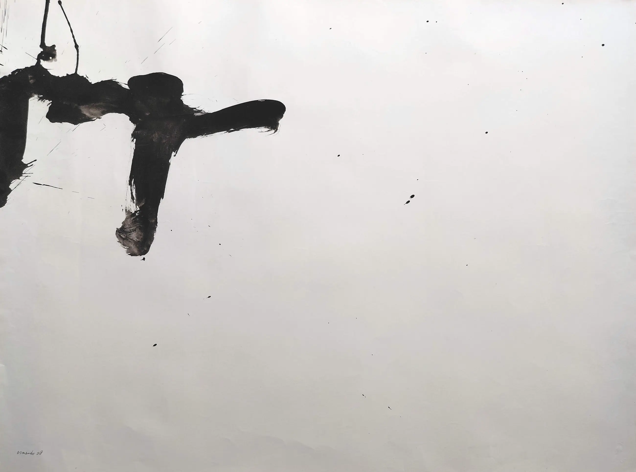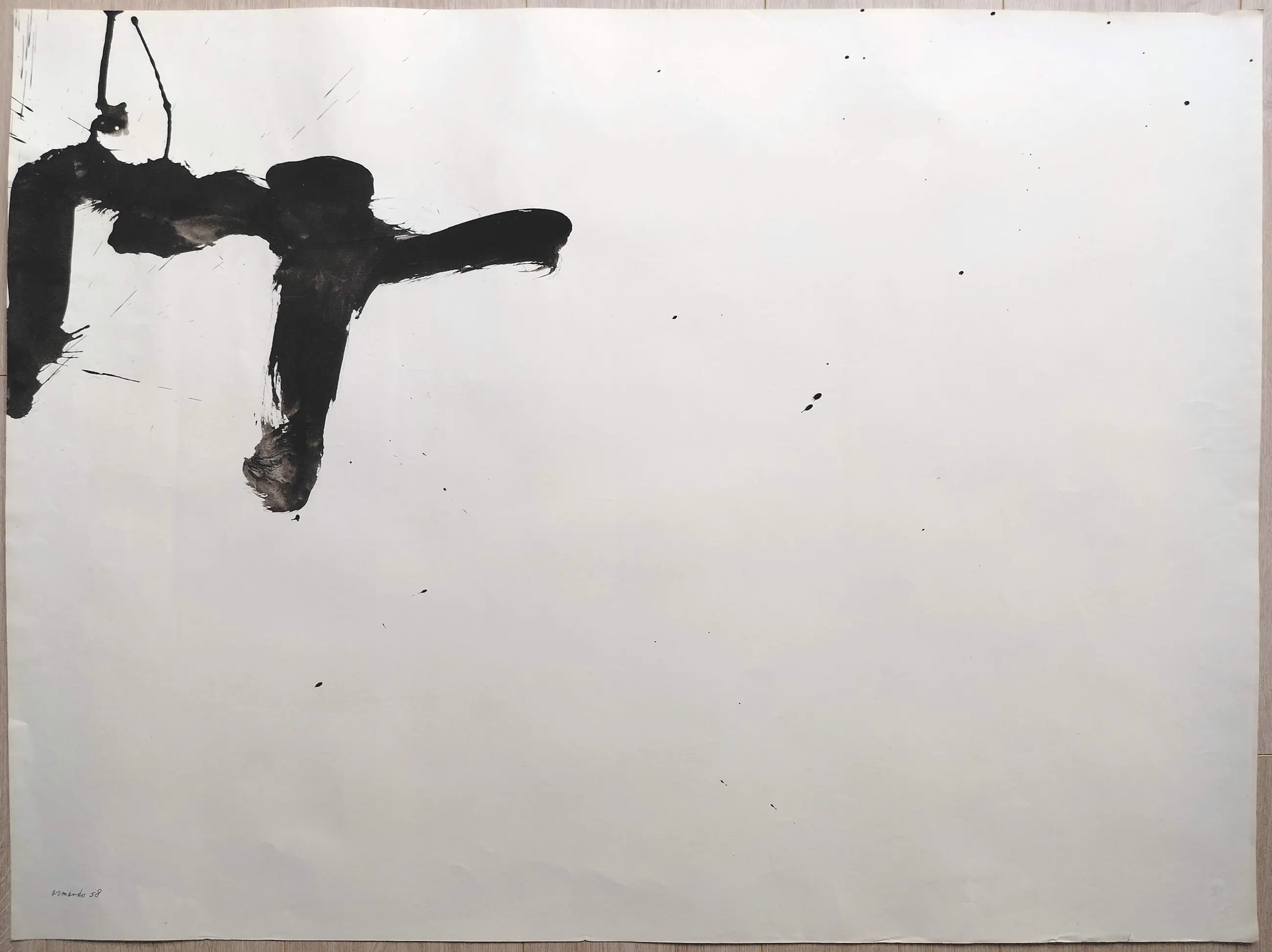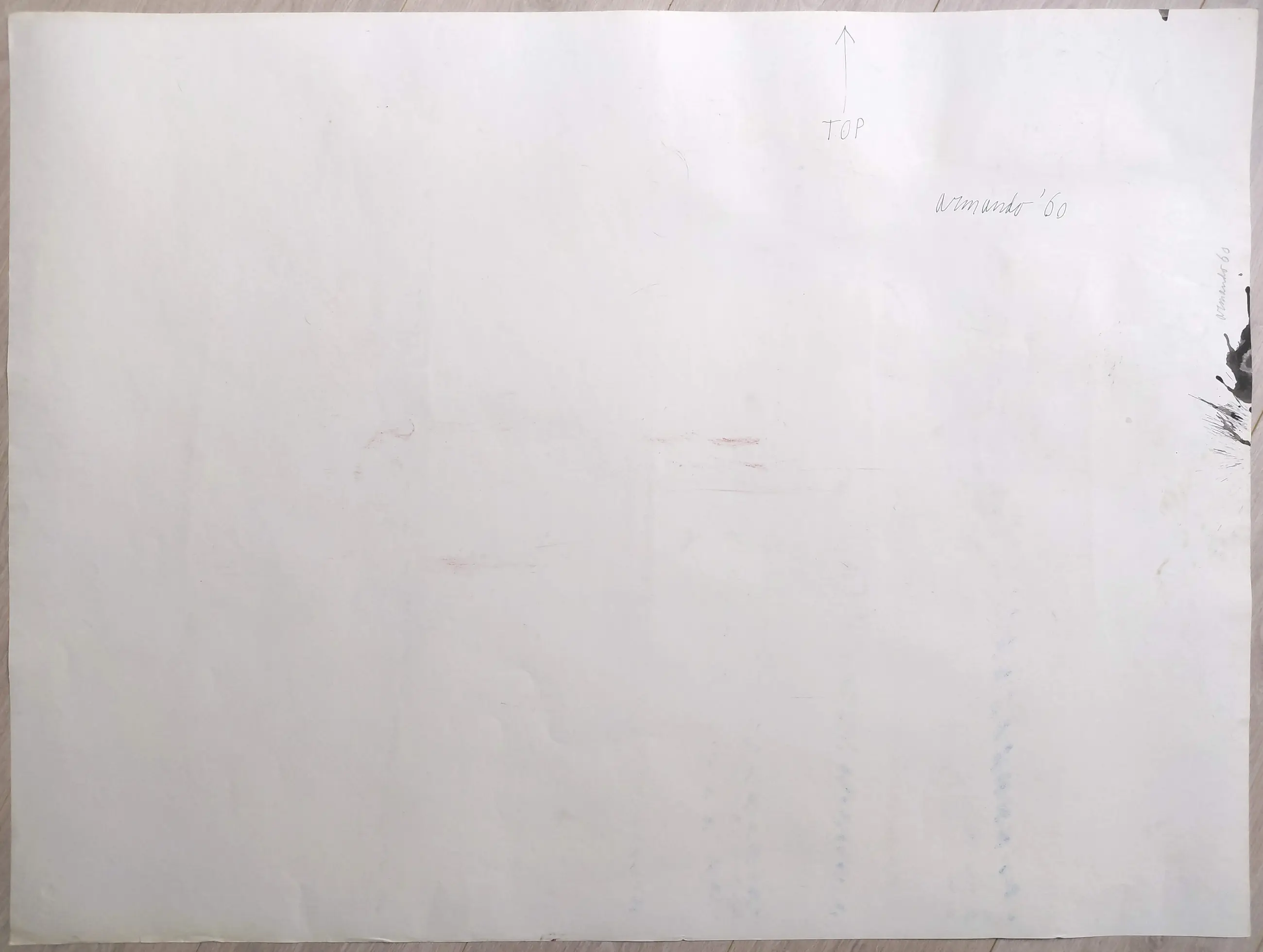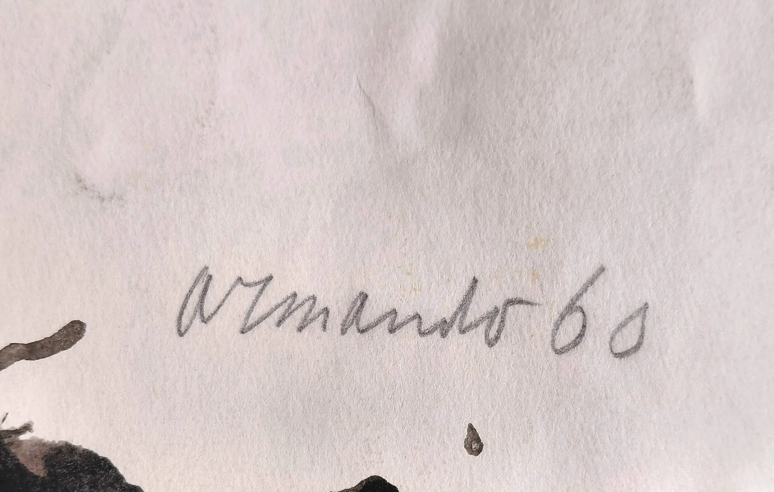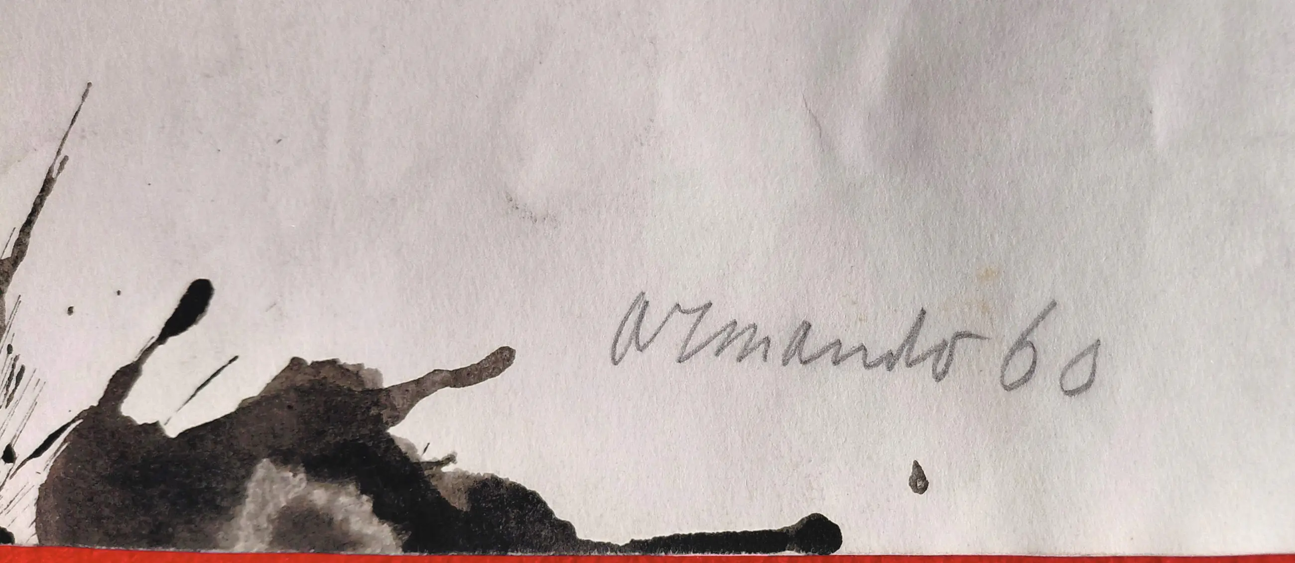 Groot abstract werk van Armando uit 1958, uit de tijd van de Hollandse Informele Groep, net voor de oprichting van de Nul-beweging. Inkt op papier, met Oost-Indische inkt gesigneerd en gedateerd linksonder, en met reliëfstempel van de al lang ter ziele gegane papierfabriek Esveha (Den Haag) rechtsonder. Op de achterkant van het blad loopt het werk enigszins door, of is het een nieuwe compositie? (het is maar net hoe je er naar kijkt) en deze keer dubbel gesigneerd (1x in inkt, 1x in potlood) en tweemaal gedateerd (’60). In goede conditie.