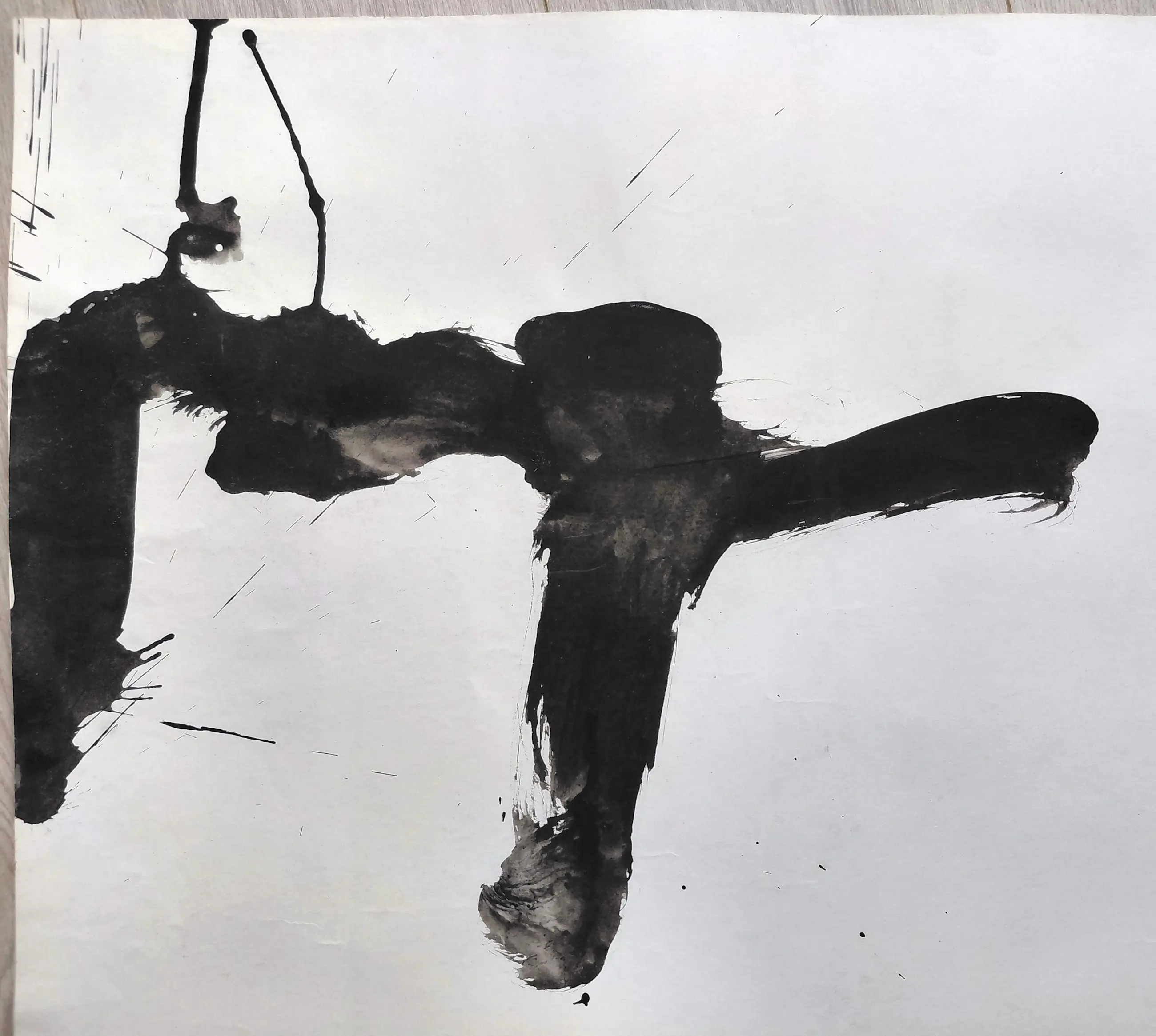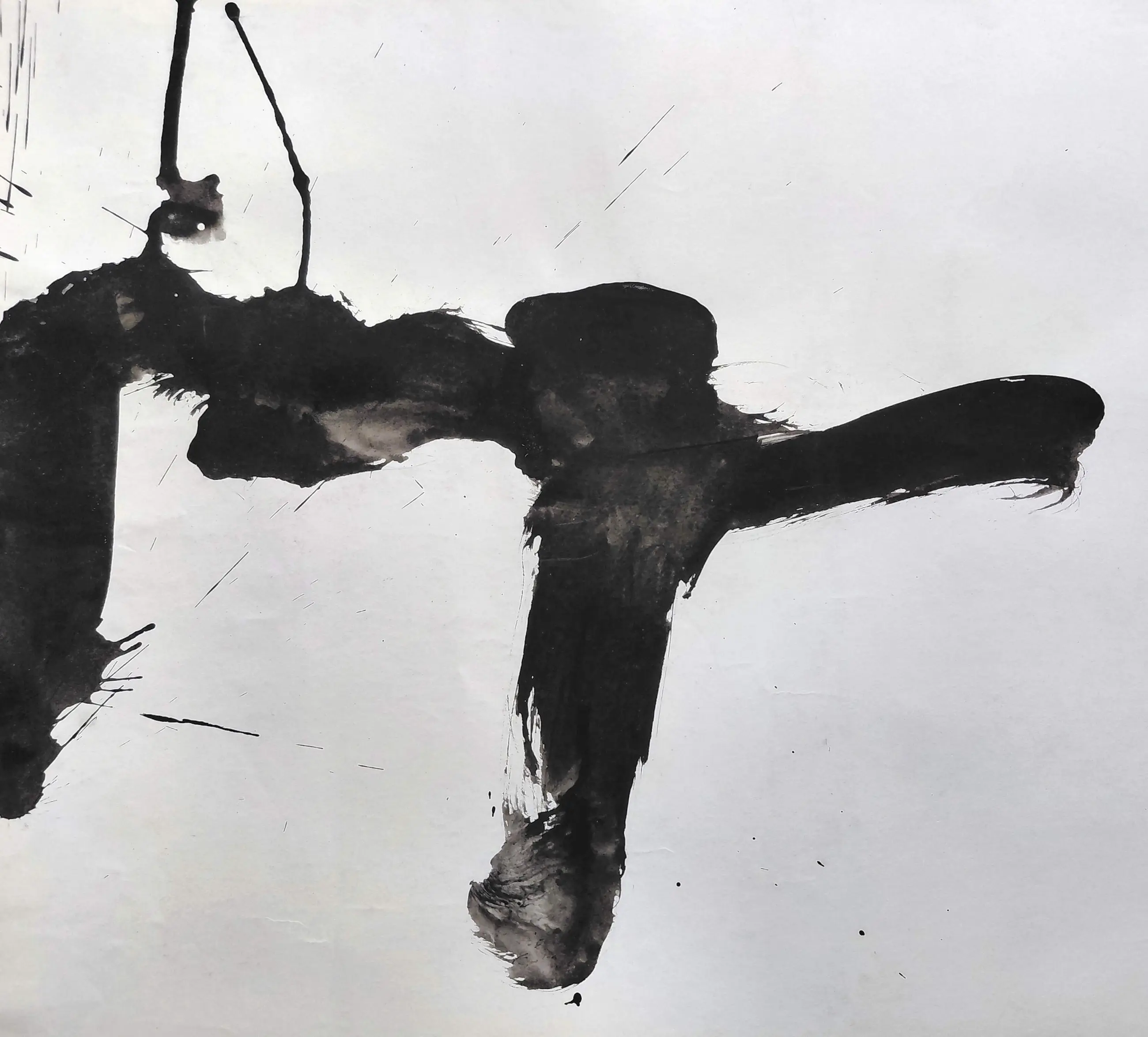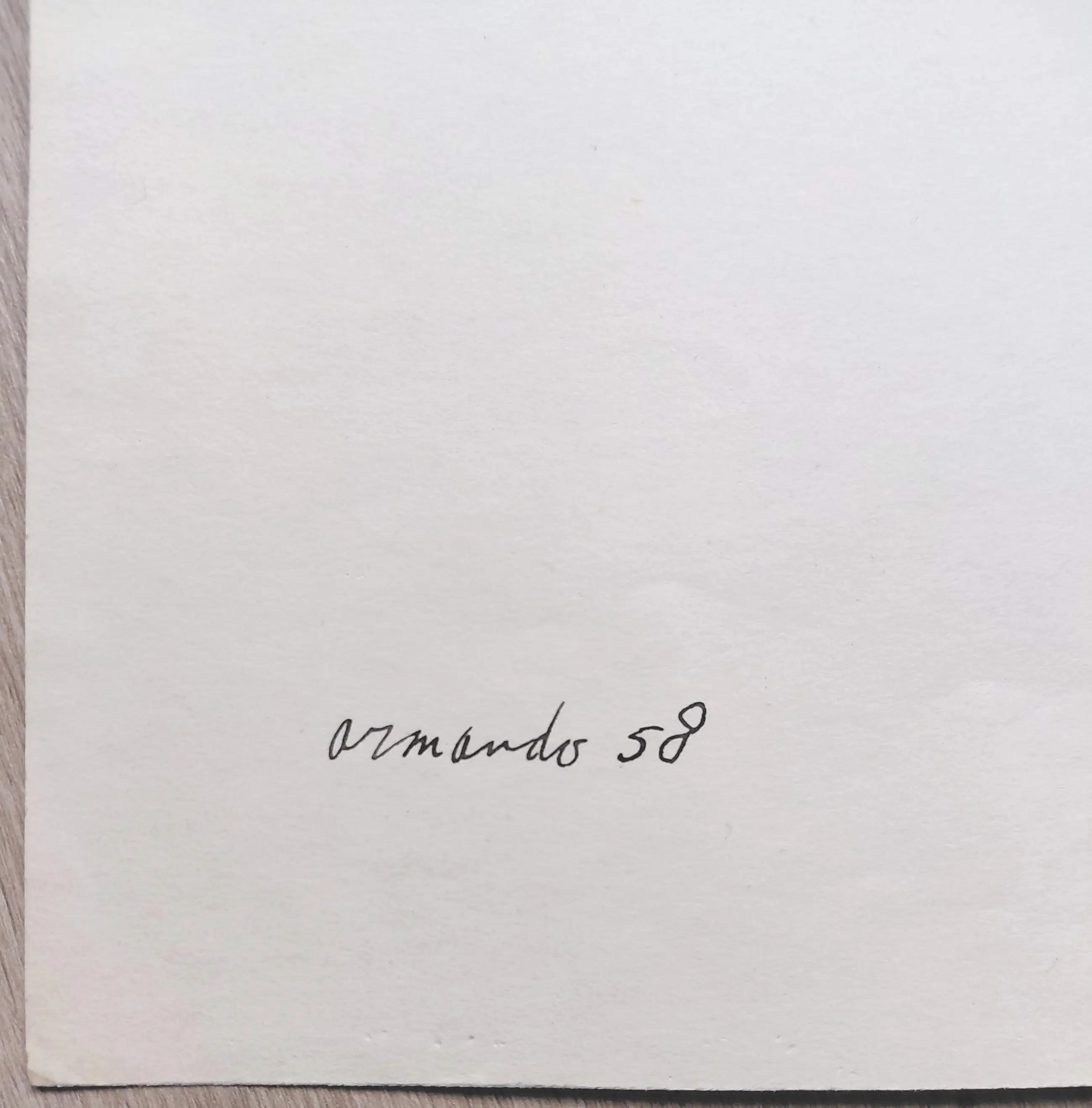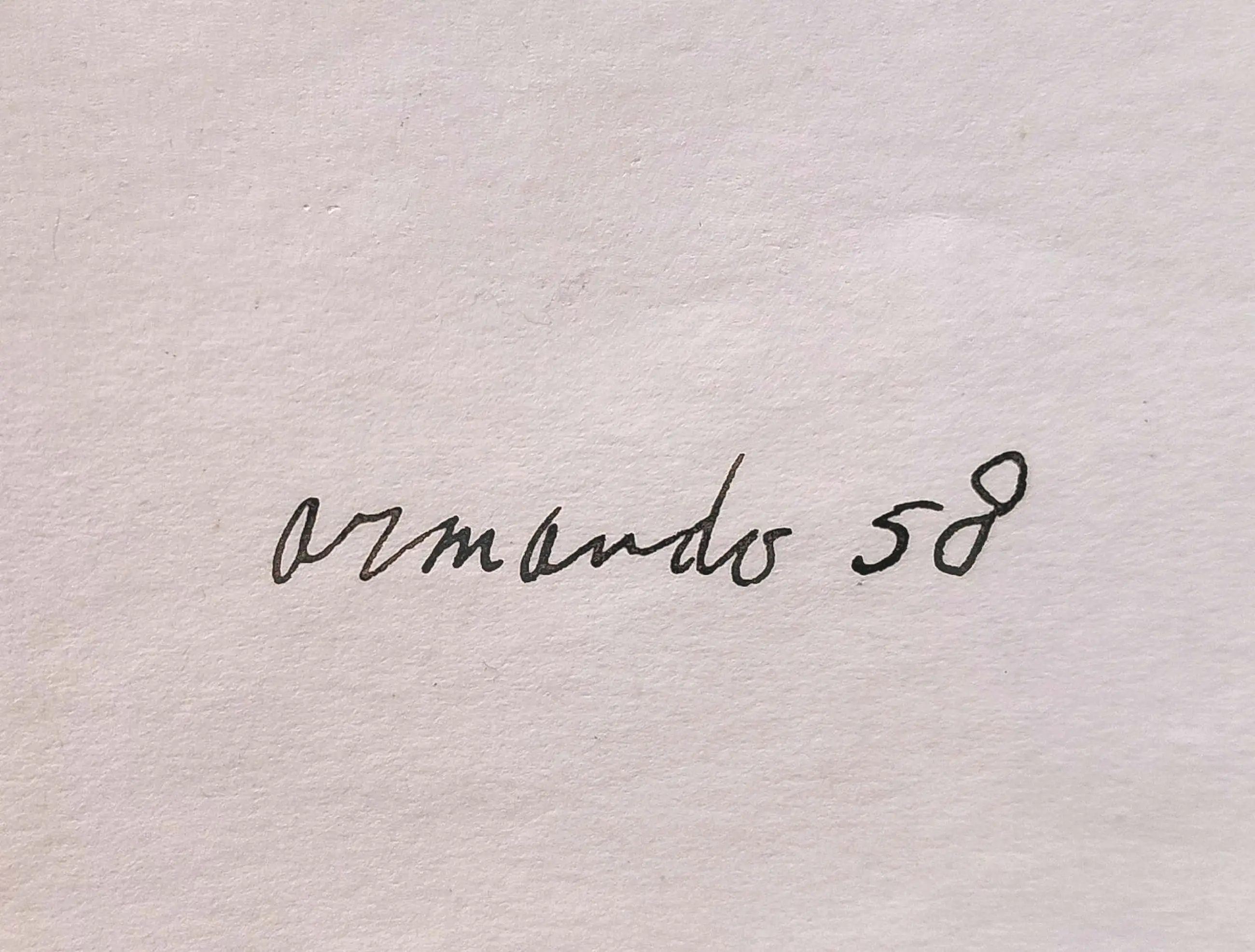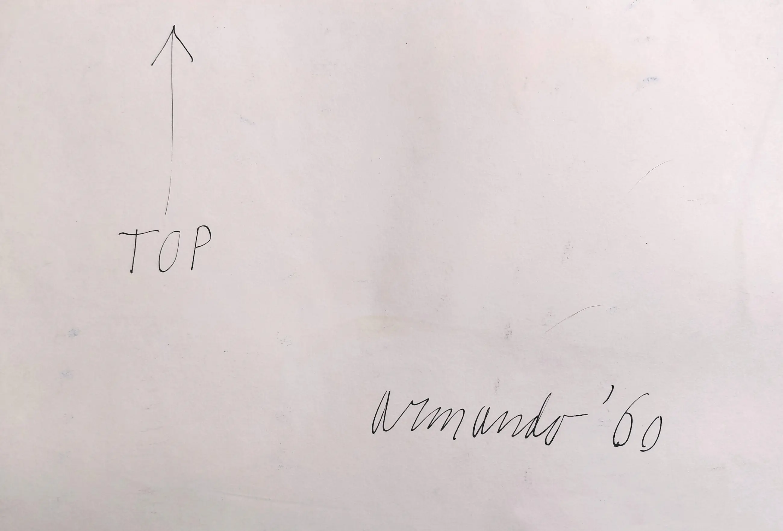 Groot abstract werk van Armando uit 1958, uit de tijd van de Hollandse Informele Groep, net voor de oprichting van de Nul-beweging. Inkt op papier, met Oost-Indische inkt gesigneerd en gedateerd linksonder, en met reliëfstempel van de al lang ter ziele gegane papierfabriek Esveha (Den Haag) rechtsonder. Op de achterkant van het blad loopt het werk enigszins door, of is het een nieuwe compositie? (het is maar net hoe je er naar kijkt) en deze keer dubbel gesigneerd (1x in inkt, 1x in potlood) en tweemaal gedateerd (’60). In goede conditie.
