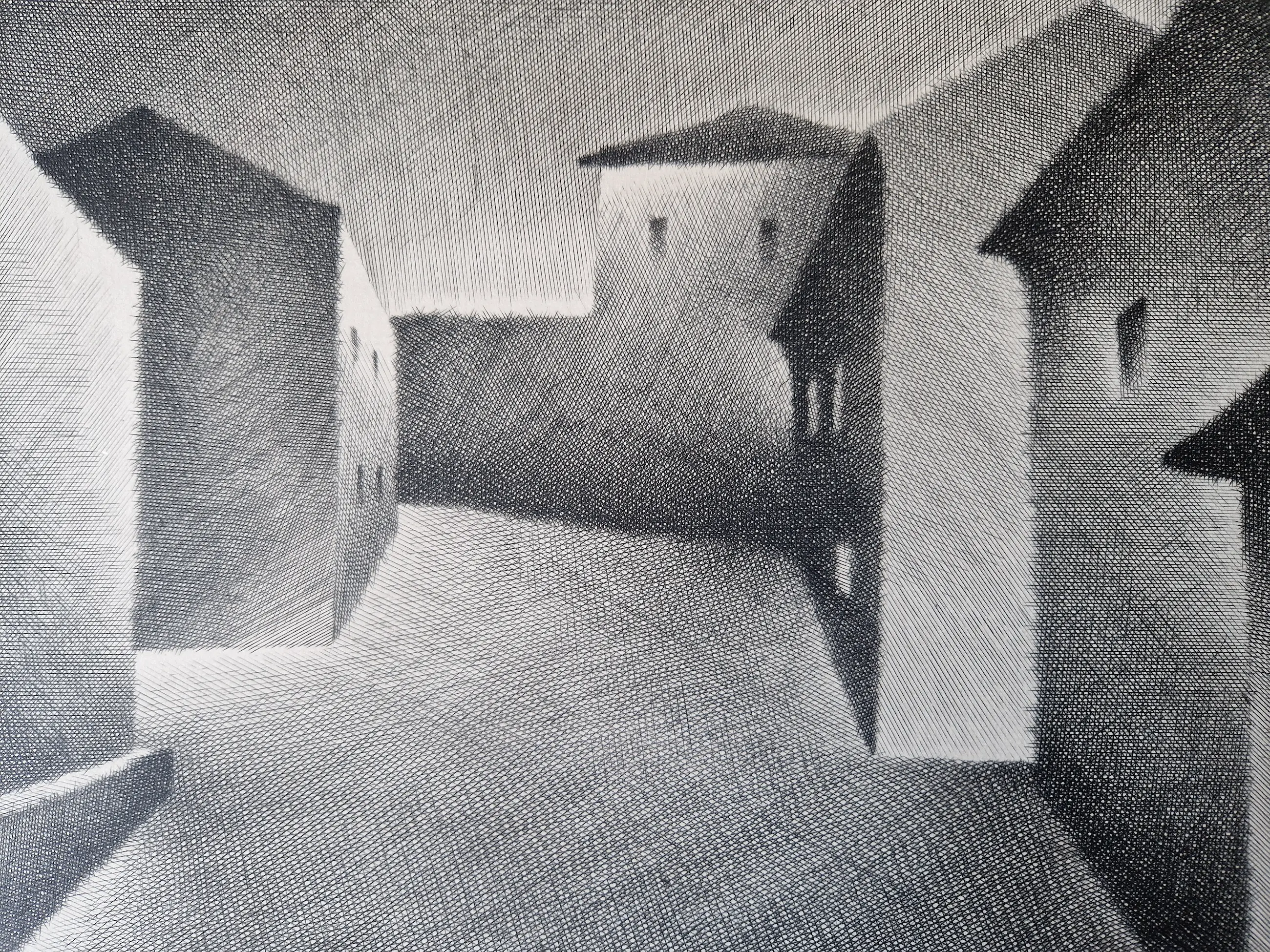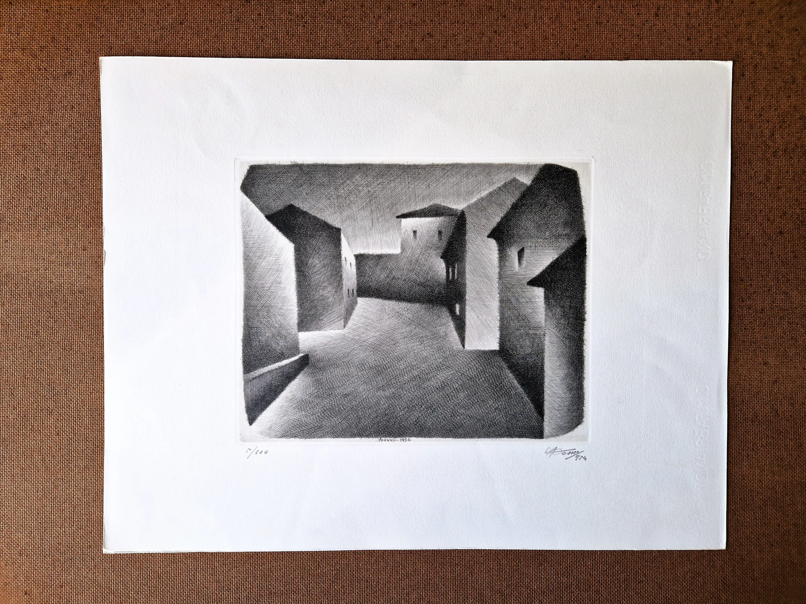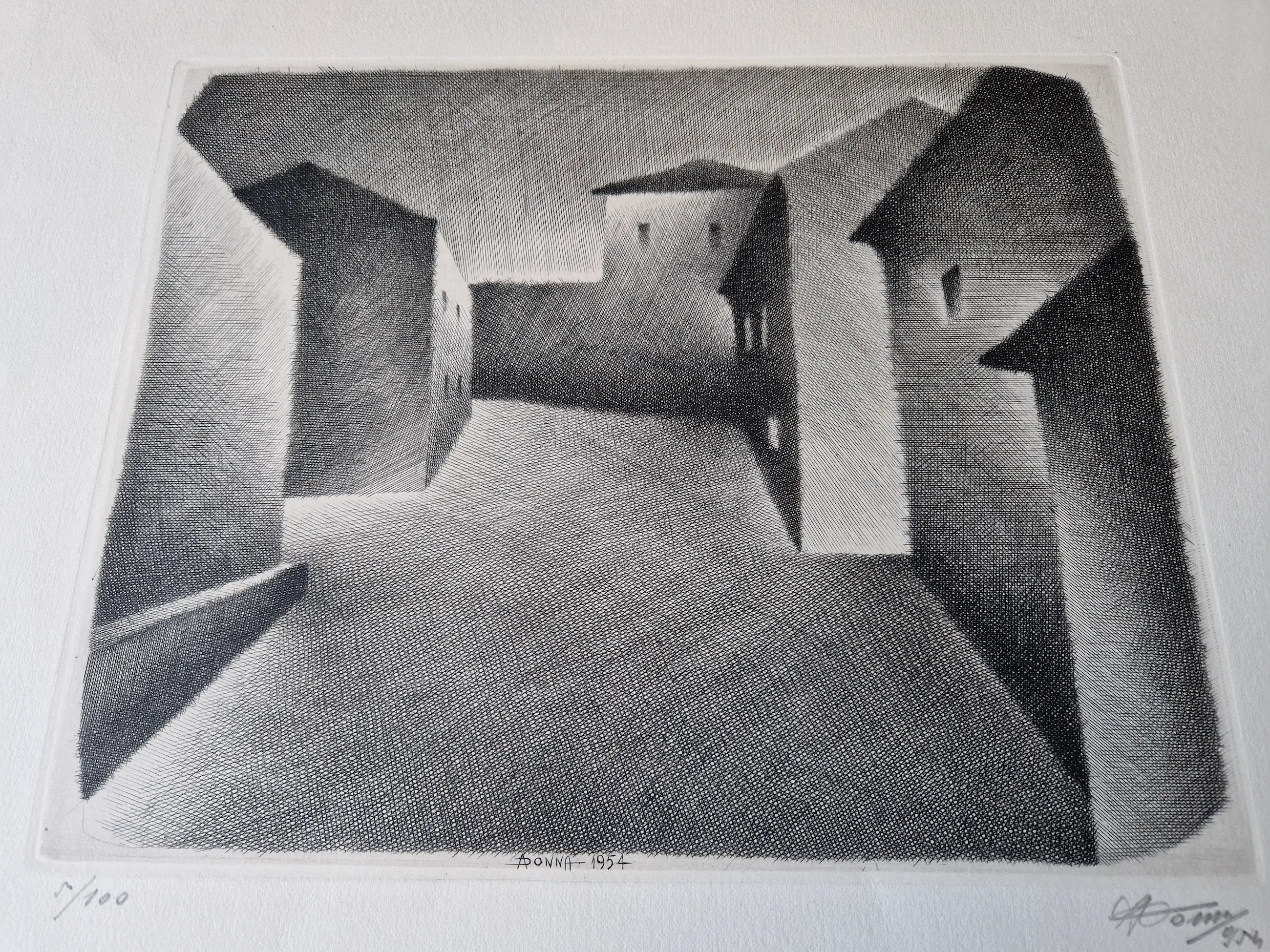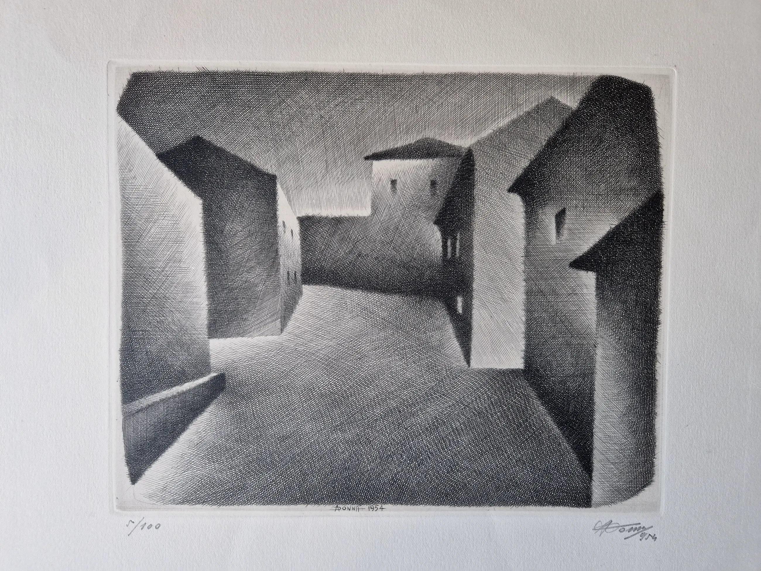 In 1947 he was appointed Professor at the Istituto di Belle Arte in Vercelli where he remained on the staff for 43 years until his retirement. During his time there it became the only artistic organisation in Italy to teach engraving. Donna's individual talent was recognized by his inclusion in an important exhibition of contemporary Italian prints at the Galerie Georges Giroux in Brussels in 1951. Donna's early style derived in part from Sironi, Casorati and Morandi, but he soon evolved a very personal highly stylized manner. The predominant solitude in his twilit landscapes and townscapes creates an other worldly effect that some commentators have described as surrealistic.