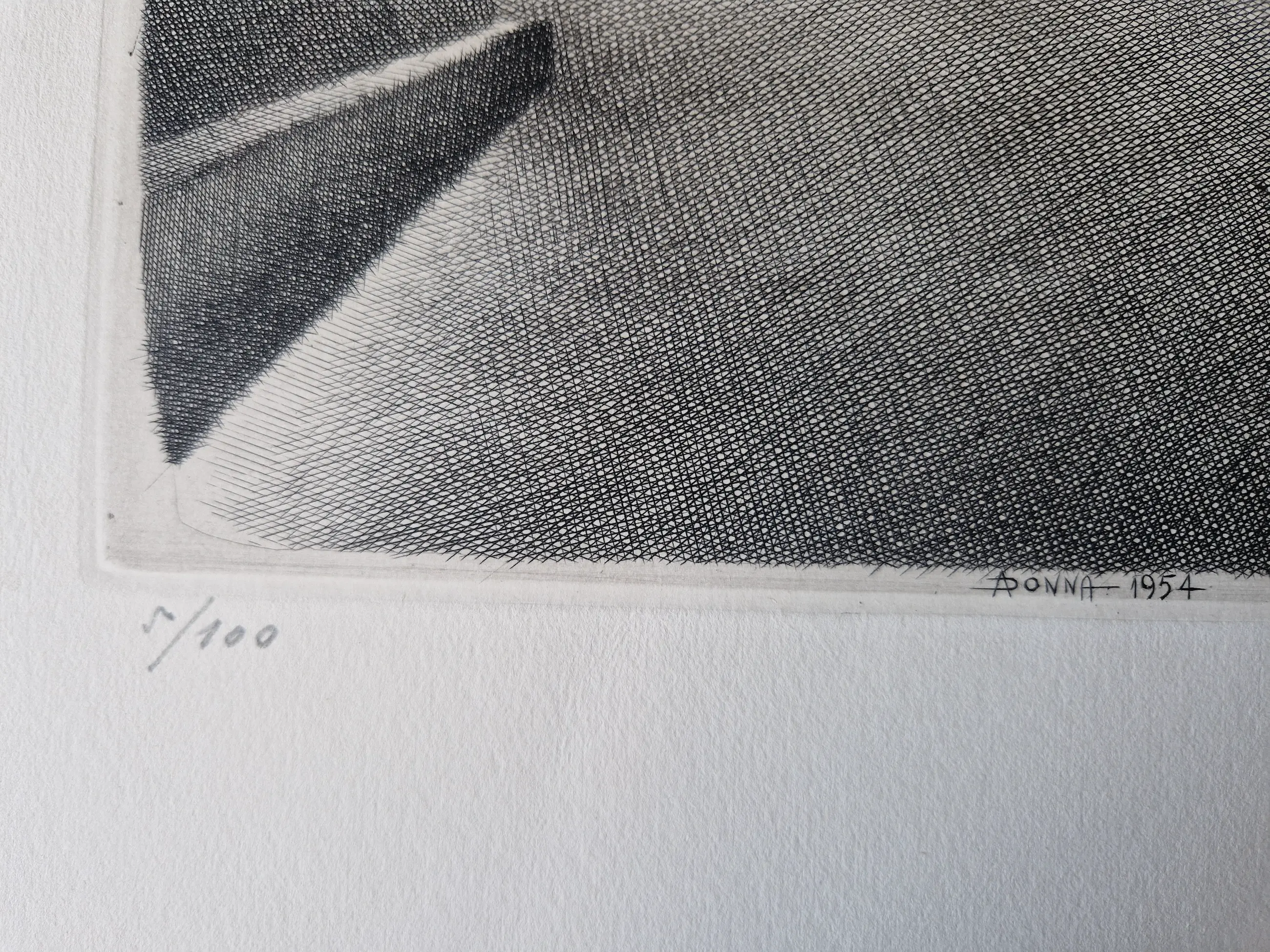 - Een in de jaren 50 (1954) door de Italiaanse graficus armando Donna (1913-1994) gemaakte Ets. Het 5e exemplaar van een oplage van in totaal 100 op dik papier. Verkeert in zeer goede , scherpe staat. Potloodgesigneerd en genummerd. Beeldmaat 22x28cm (HxB). Bladmaat 39x50cm.