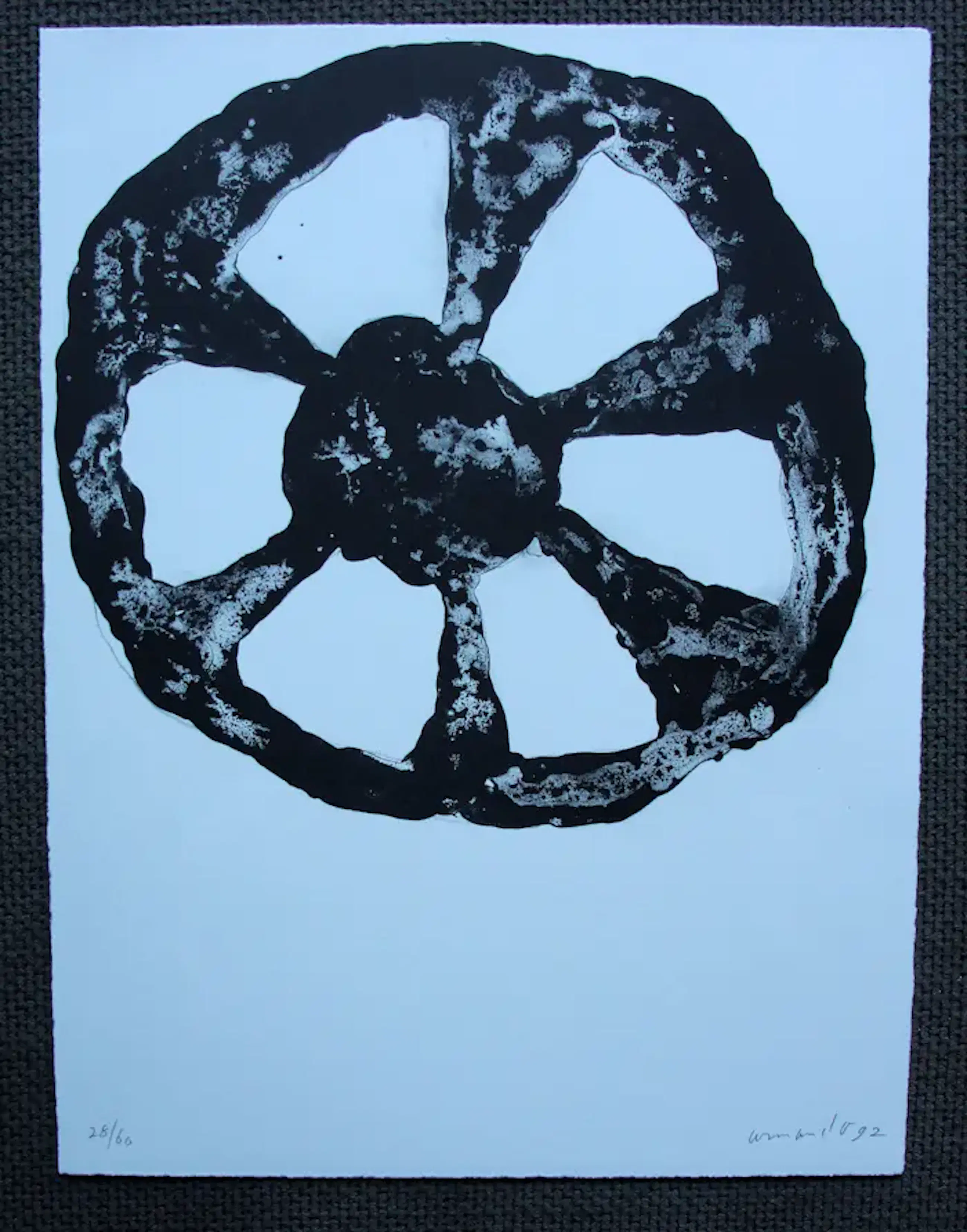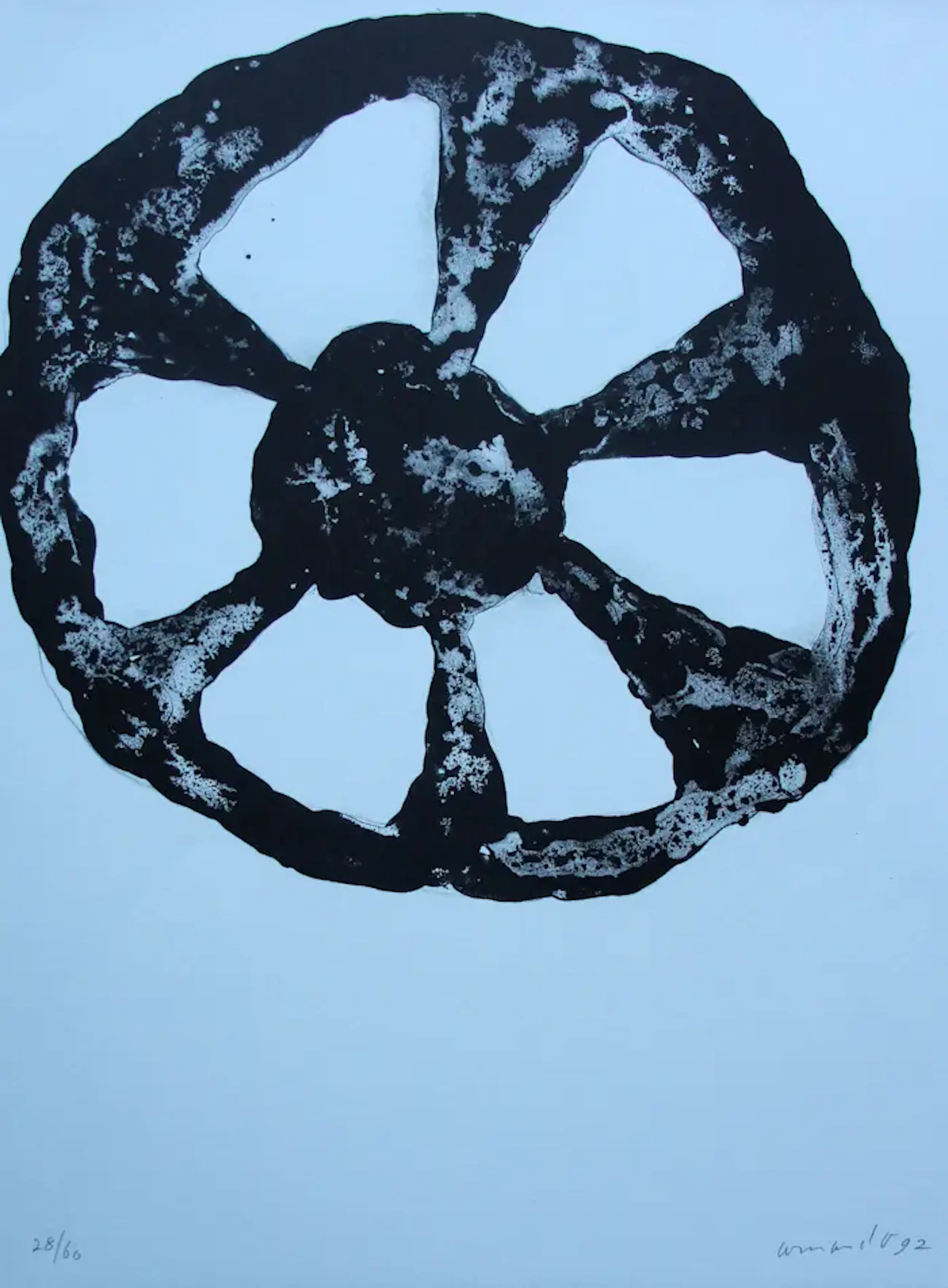 Litho van Armando. Titel: Das rad. Speciale uitgave in linnen map + omslag waarop staat: Chiem Teulings, afscheid VNU, december 1992. Oplage: 28/60 . Afmetingen map: H44cm x b32cm. Afmetingen voorstelling: H40cm x b30cm. Het werk is rechts onderaan, met potlood, gesigneerd door de kunstenaar. De authenticiteit van het aangeboden werk wordt volledig gegarandeerd. Een certificaat van echtheid kan, op aanvraag, worden gemaild.