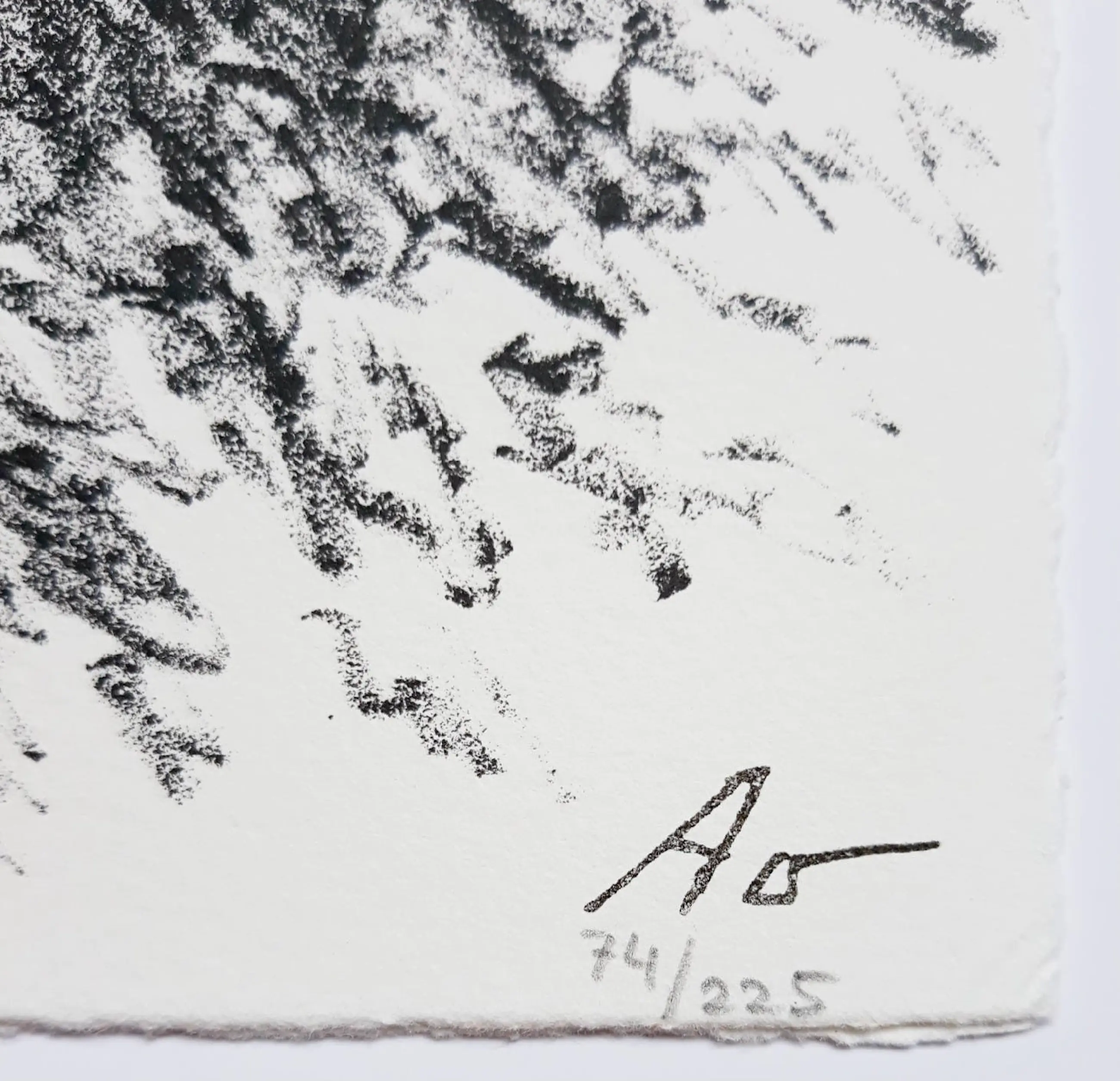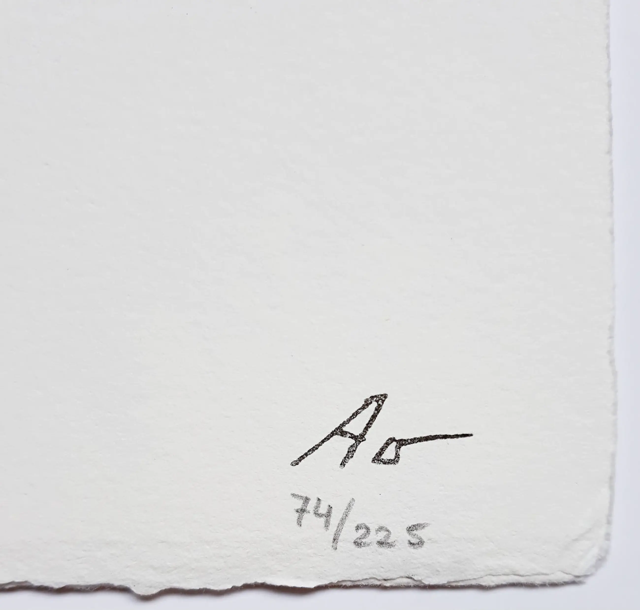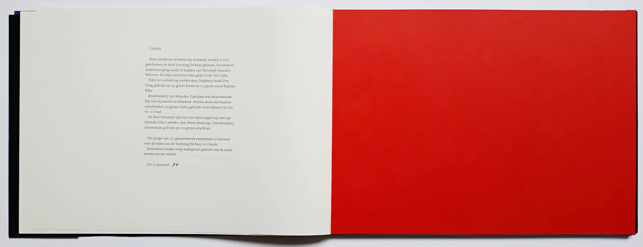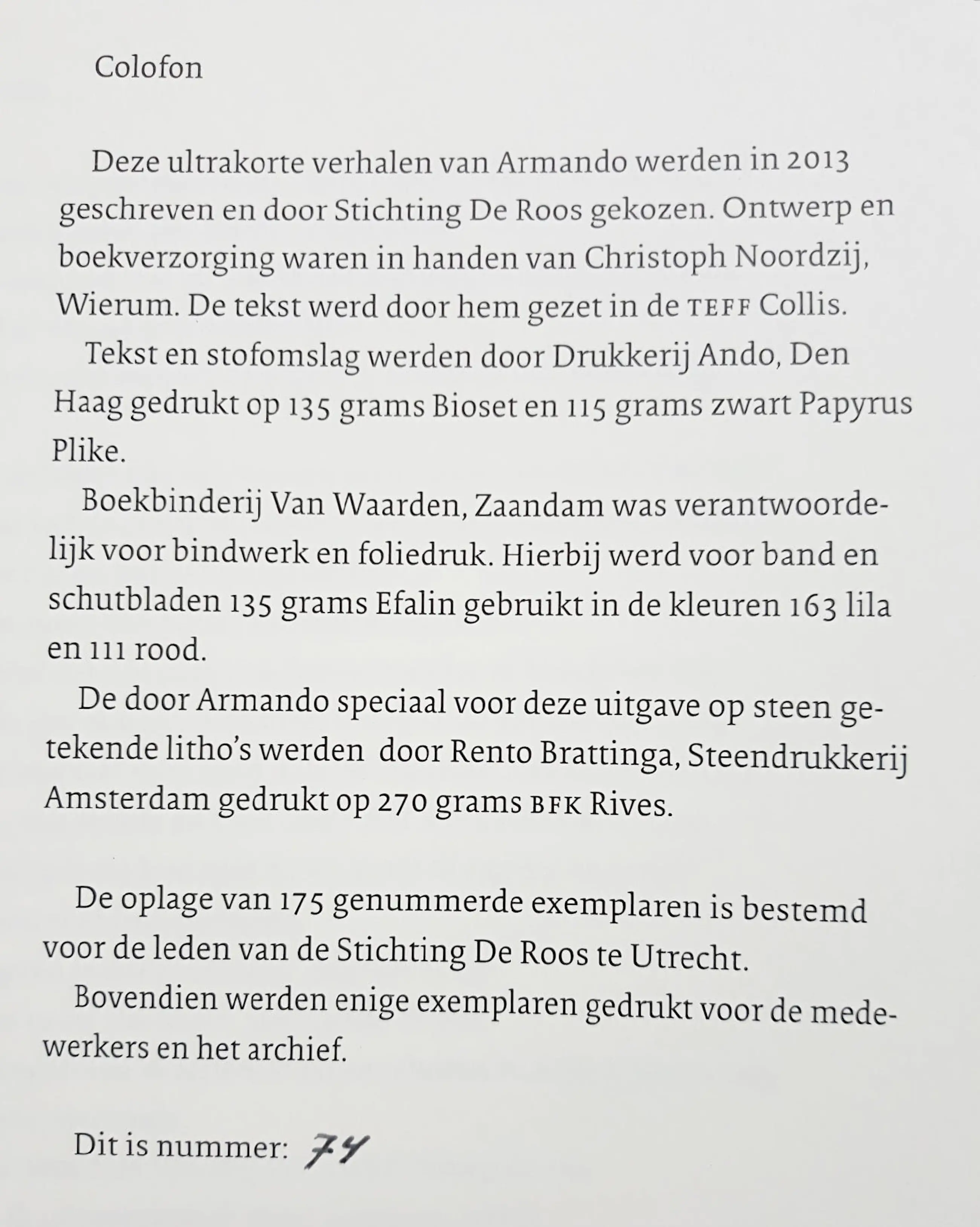 Mooie publicatie met ultrakorte verhalen van Armando, uitgegeven door stichting De Roos in 2014. Met twee originele, losbladige litho’s op Rives papier; drukgesigneerd, maar met potlood genummerd. Dit is uitgave nummer 74. De stofomslag heeft wat vlekken en wat lichte schade, maar dat is eigenlijk ook de functie van een omslag. De rest van de publicatie is in mint conditie.