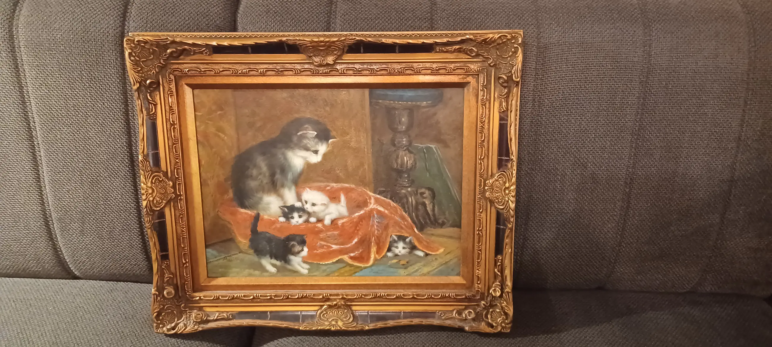 Warm en sfeervol geschilderde interieurvoorstelling met een poes en hun kittens. Het werk is uitgevoerd in olieverf op paneel en toont een verfijnde, academische schildertechniek met oog voor detail en textuur.