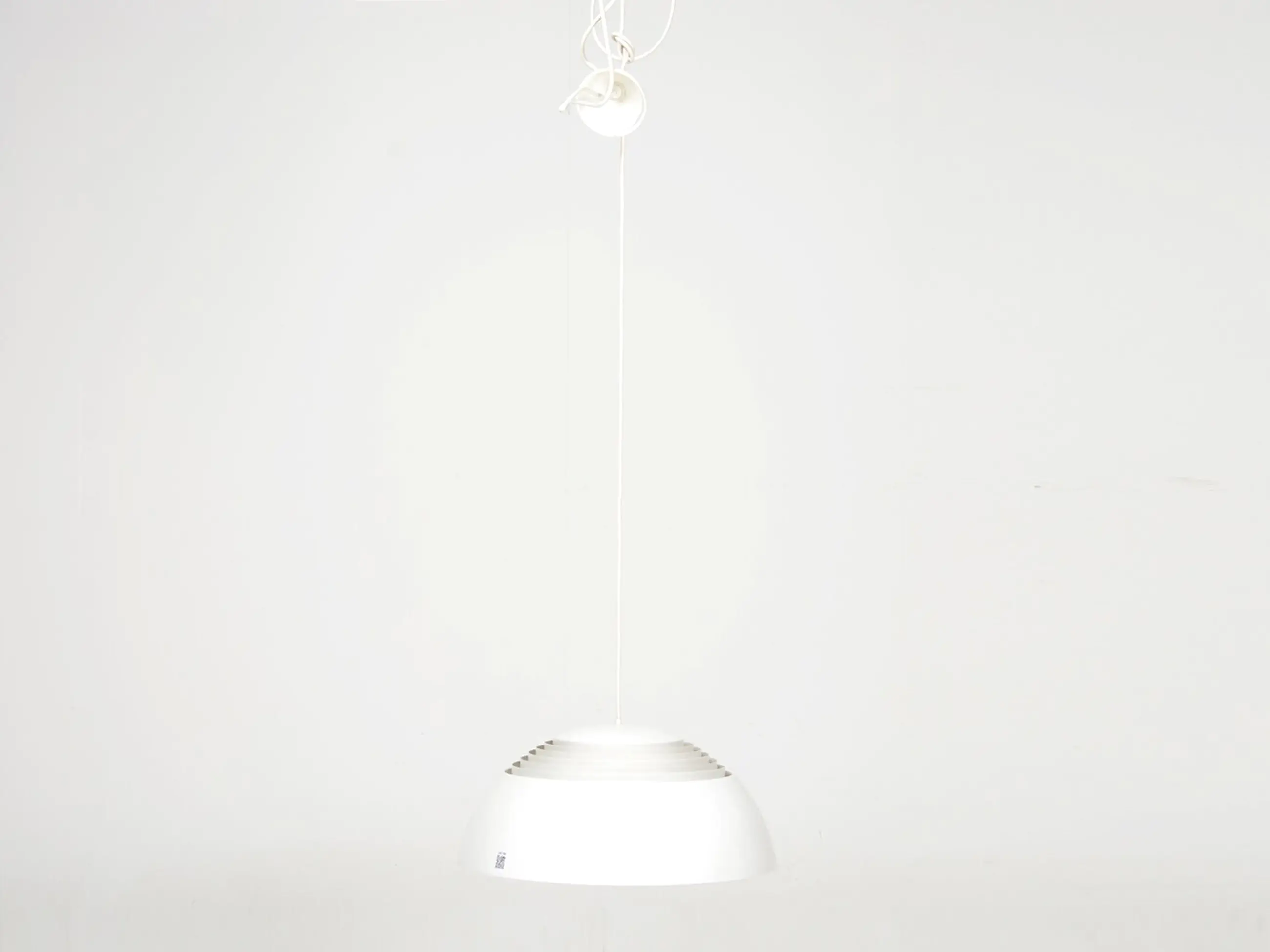 Wit gelakte metalen hanglamp - model AJ Royal, ontwerp Arne Jacobsen 1961 uitvoering van later datum - h. 20 en Ø 50 cm (plafondkap beschadigd)