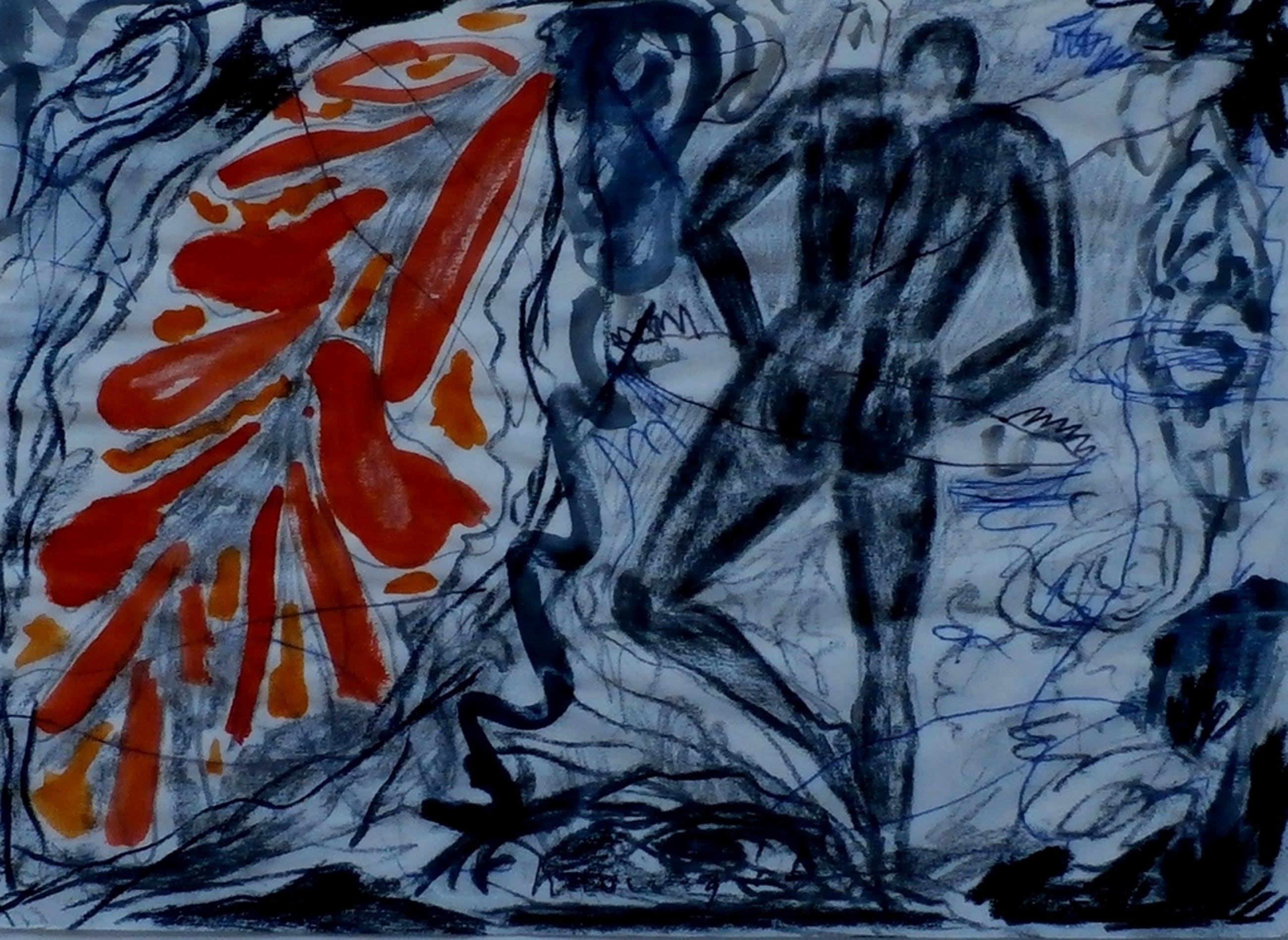 Arno Kramer, gemengde techniek op papier (potlood, balpen, waterverf). Afmetingen: 22 x 30,5 cm. Gesigneerd op achterzijde. Jaar: 1985.