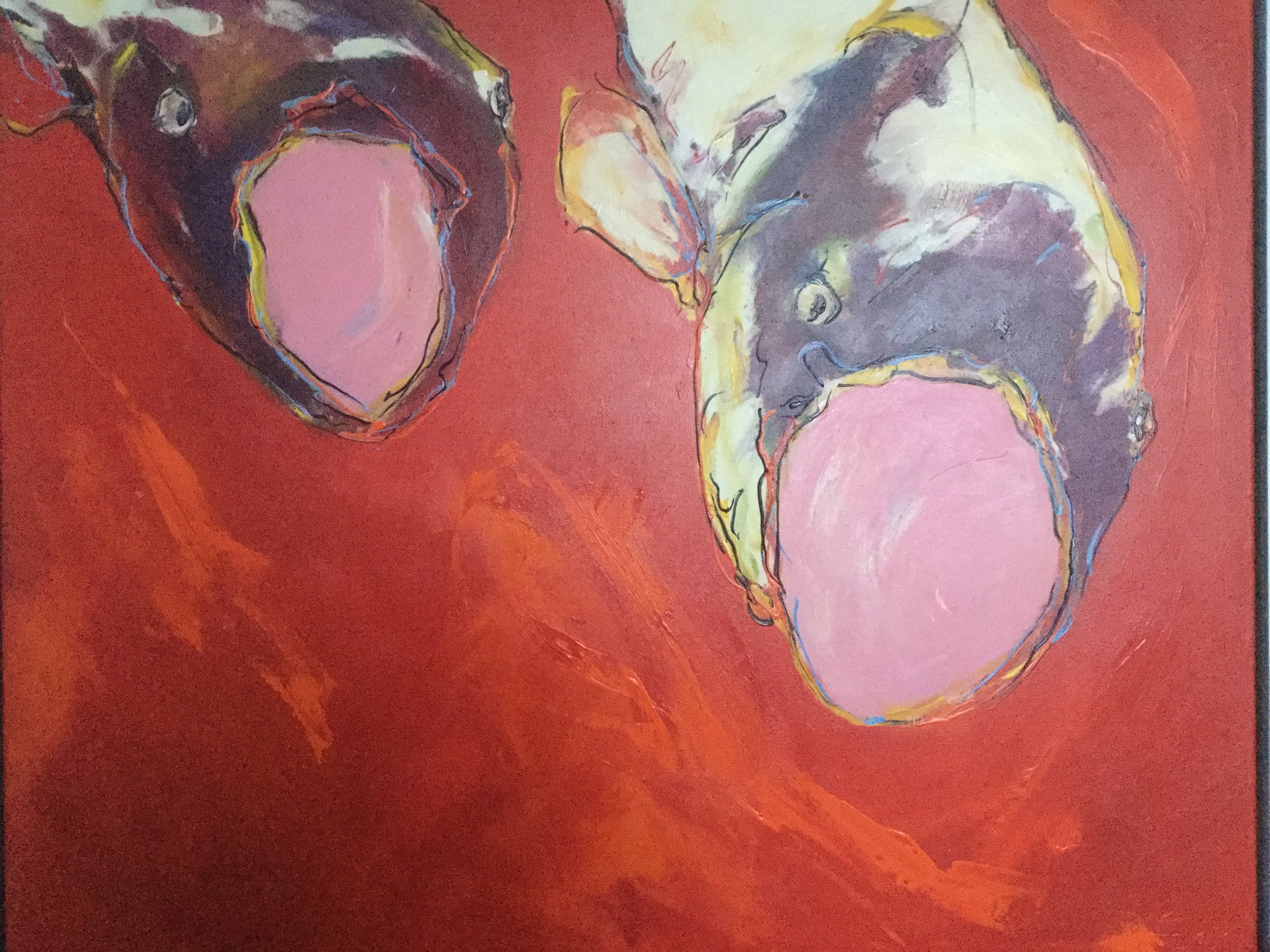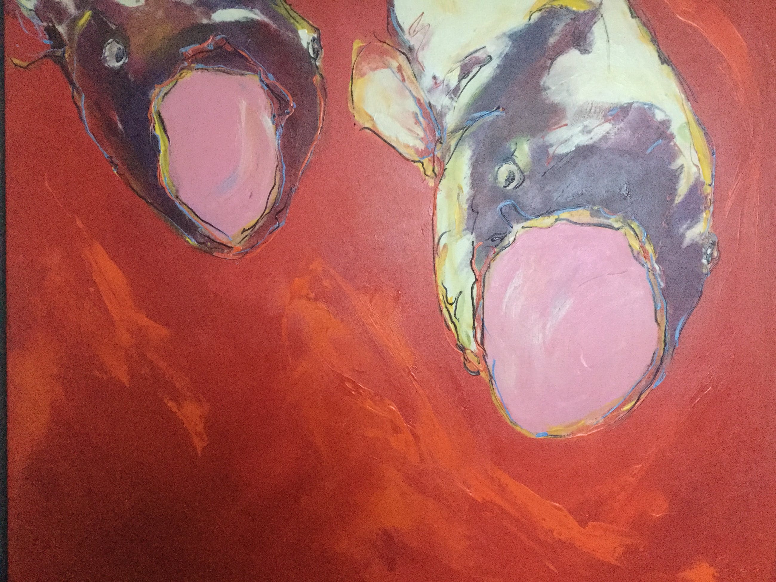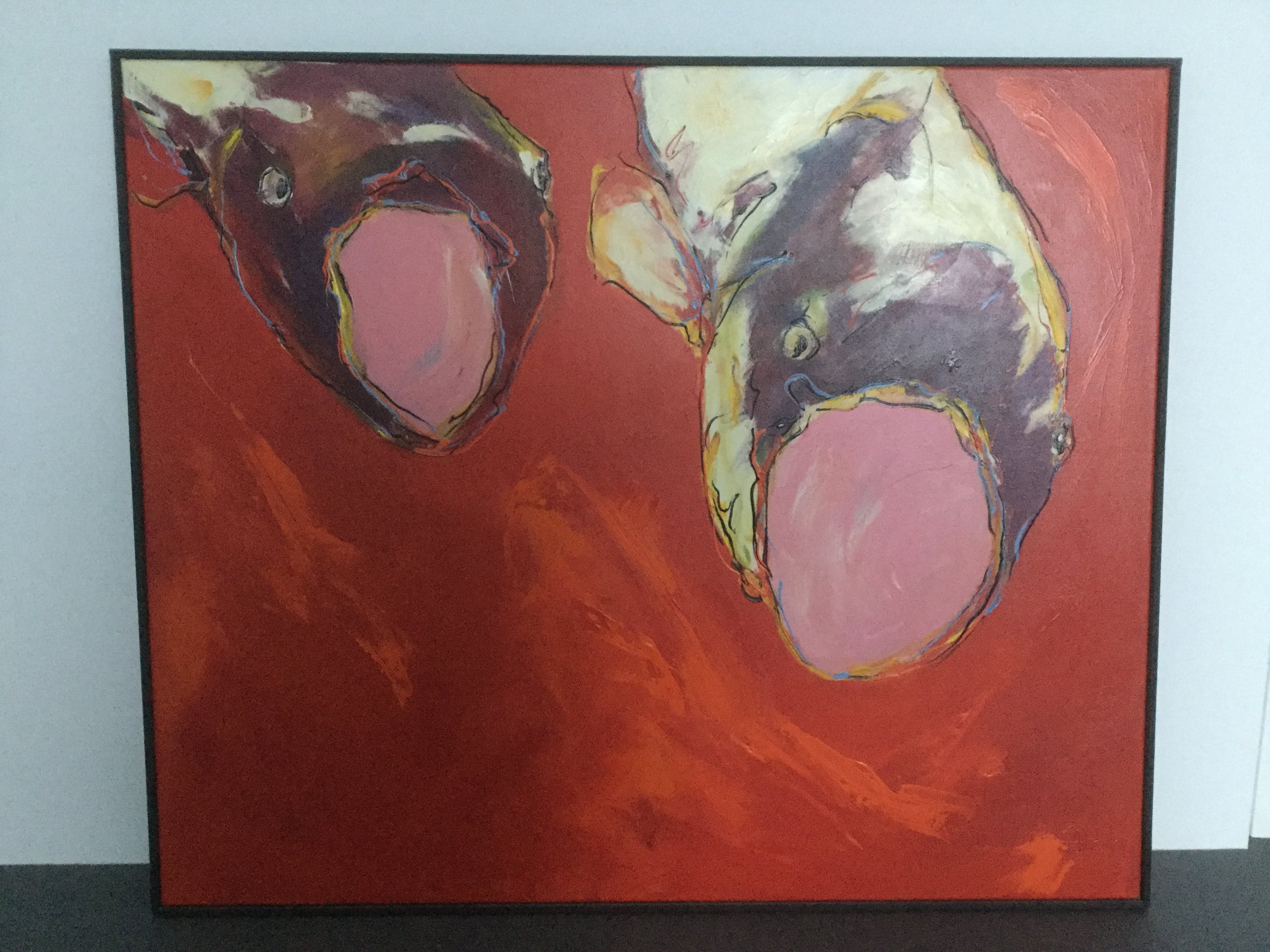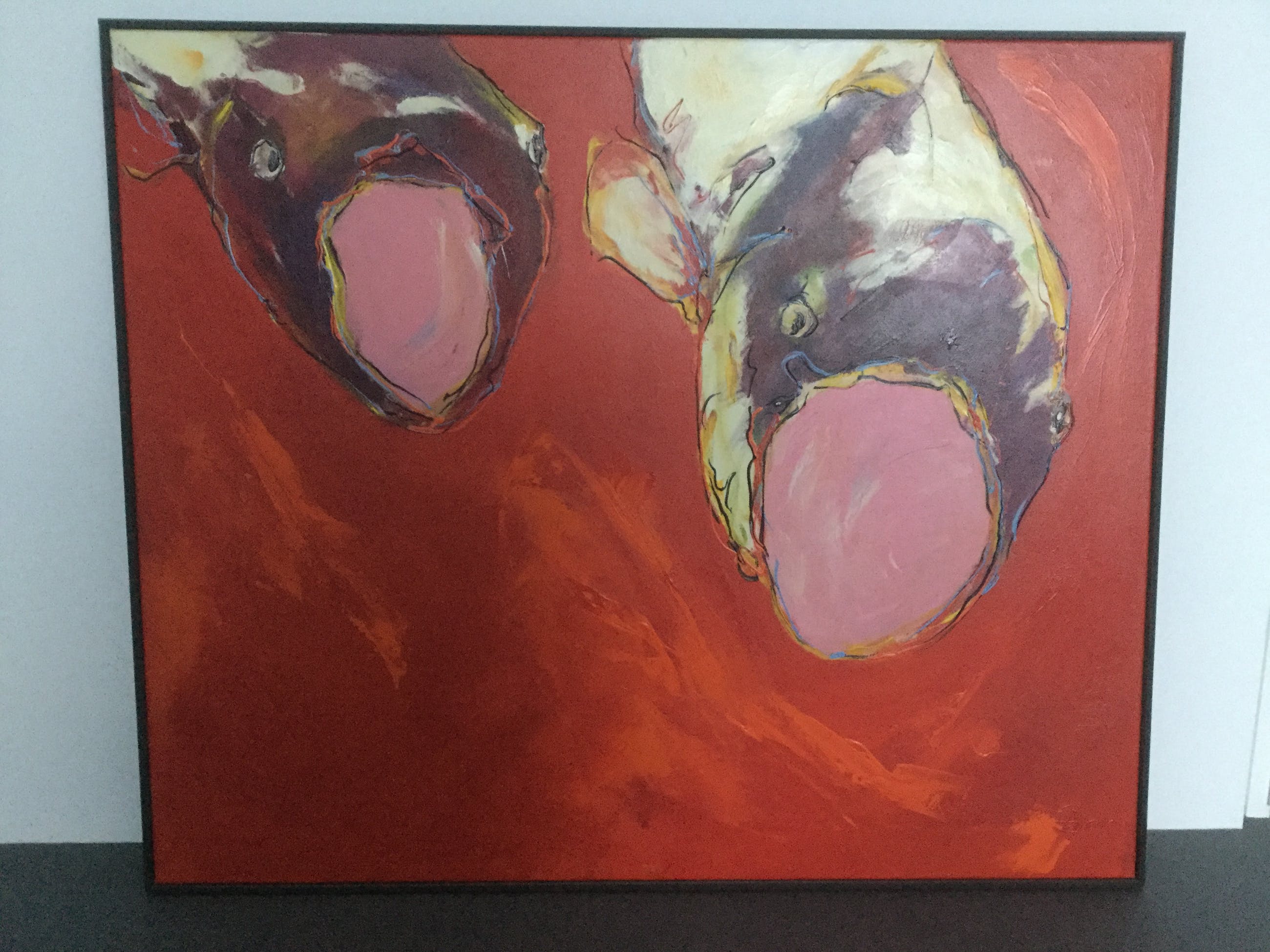 Sprekend schilderij uit thema Vissen van Arno Overdevest met een zwarte omlijsting.