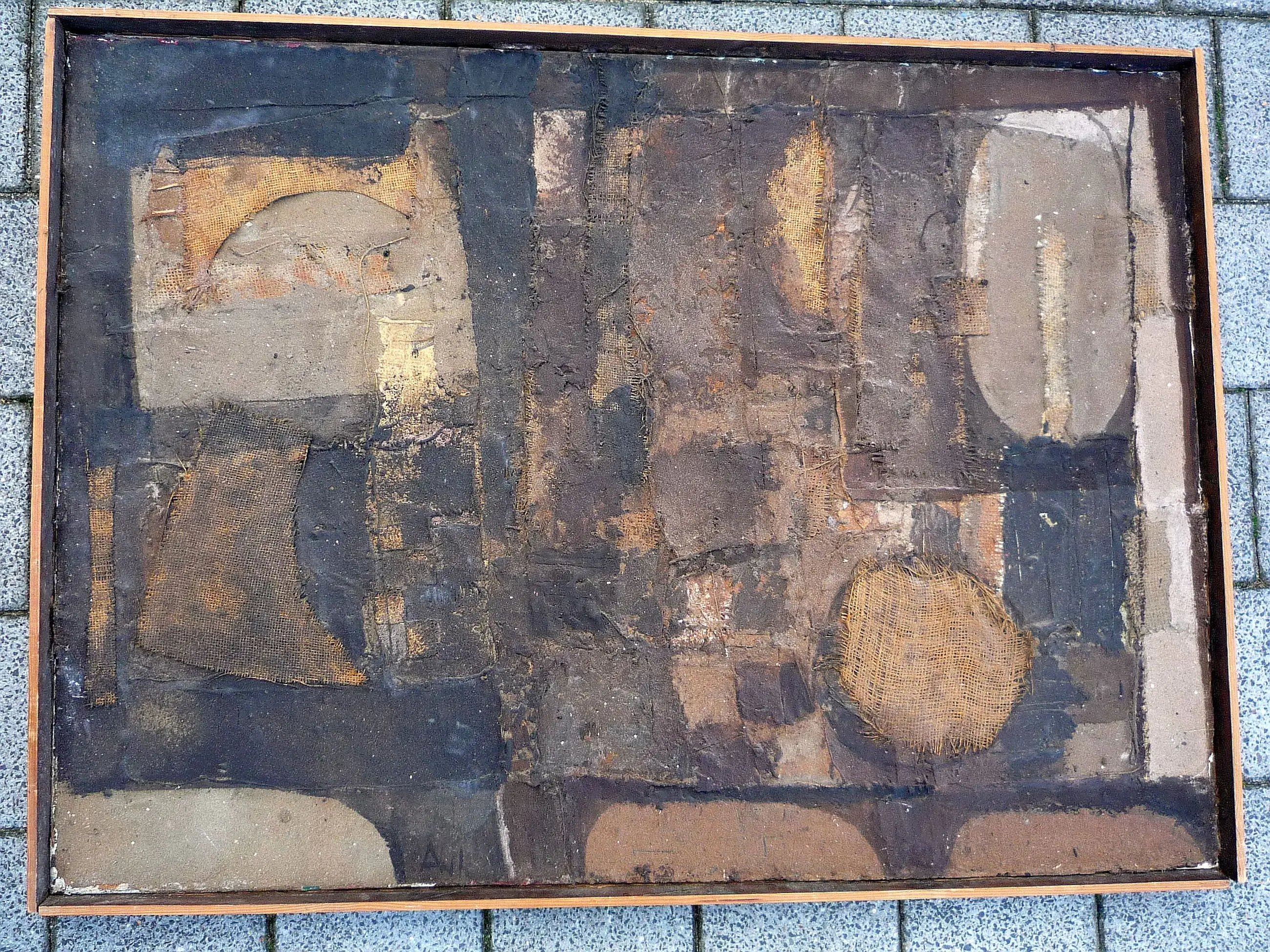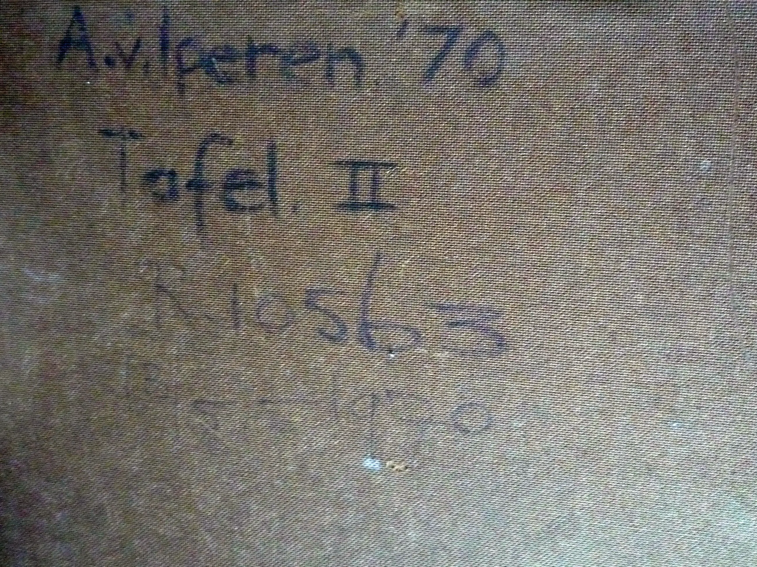 | Conditie van het werk goed, conditie van de lijst eigenlijk niet van toepassing omdat de kunstenaar er een primitieve atelierlijst omheen heeft gezet. | |||||||||||