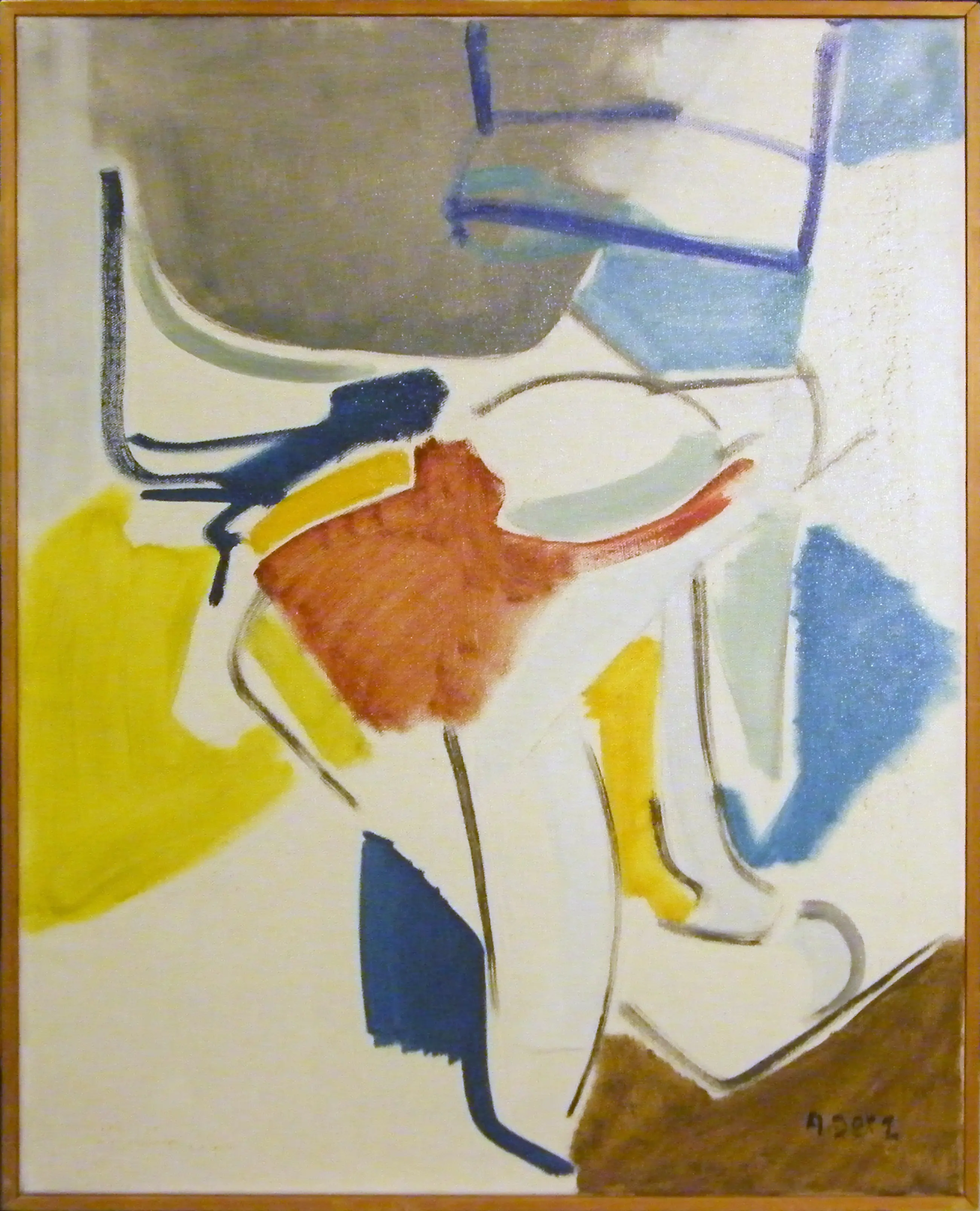 Met simpele lijst. Doek hangt iets slap. Verfverlies rechterhelft door schuren.