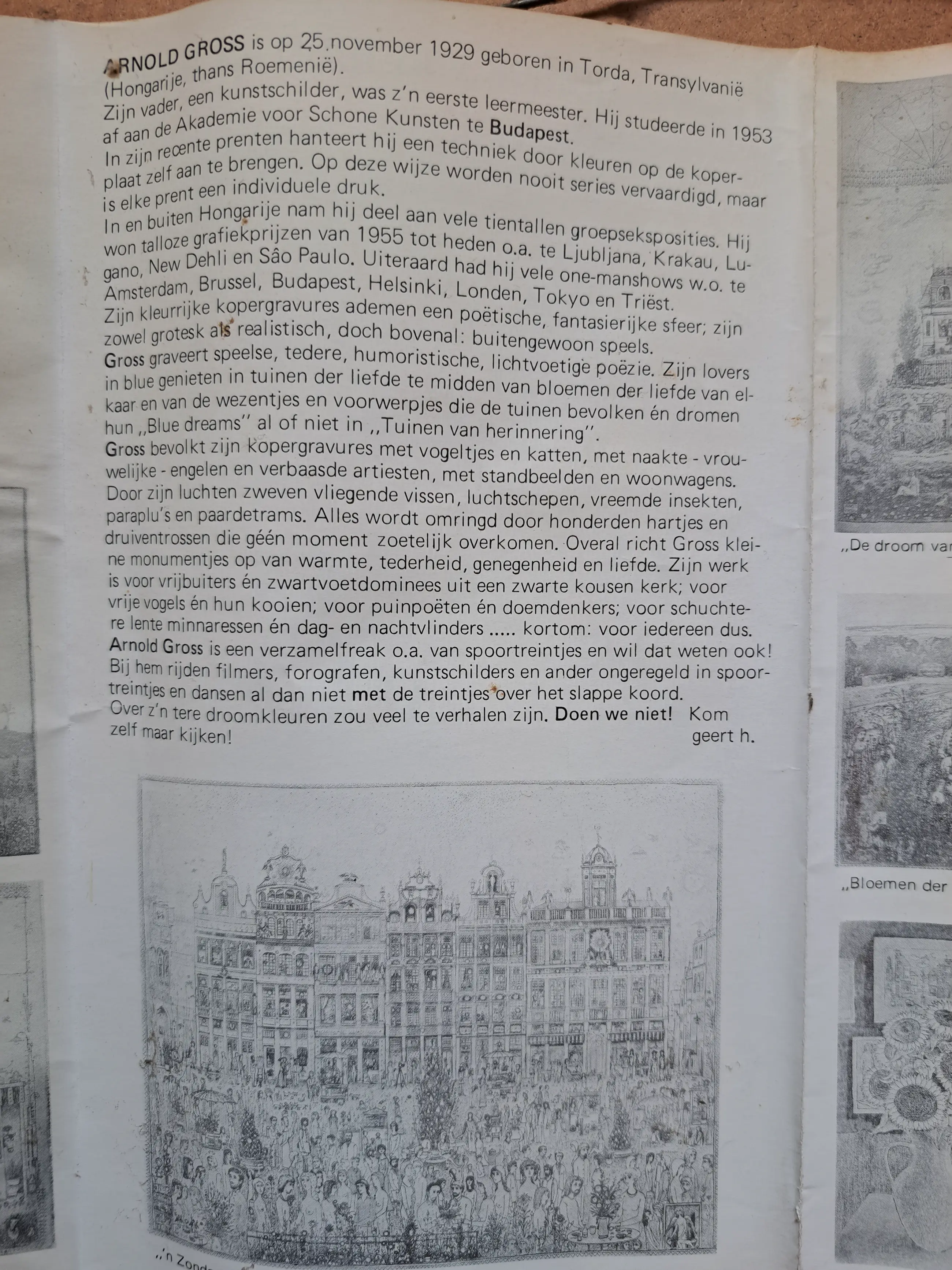 Arnold Gross hanteert een techniek door kleuren op de koperplaat zelf aan te brengen. Op deze wijze worden nooit series vervaardigd, maar is elke prent een individuele druk.