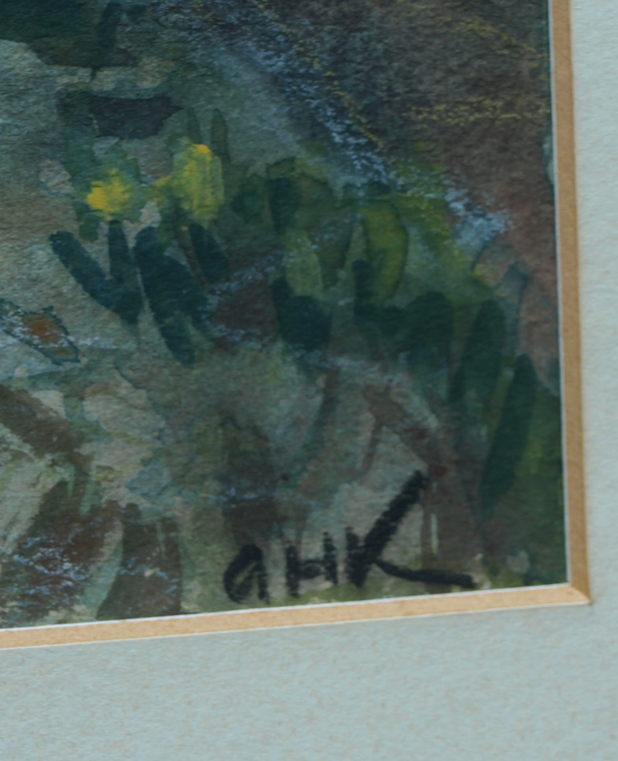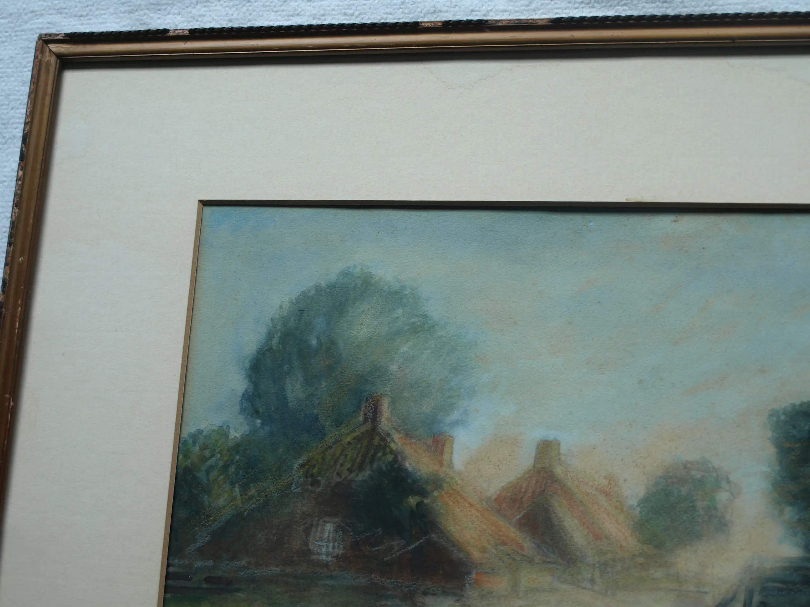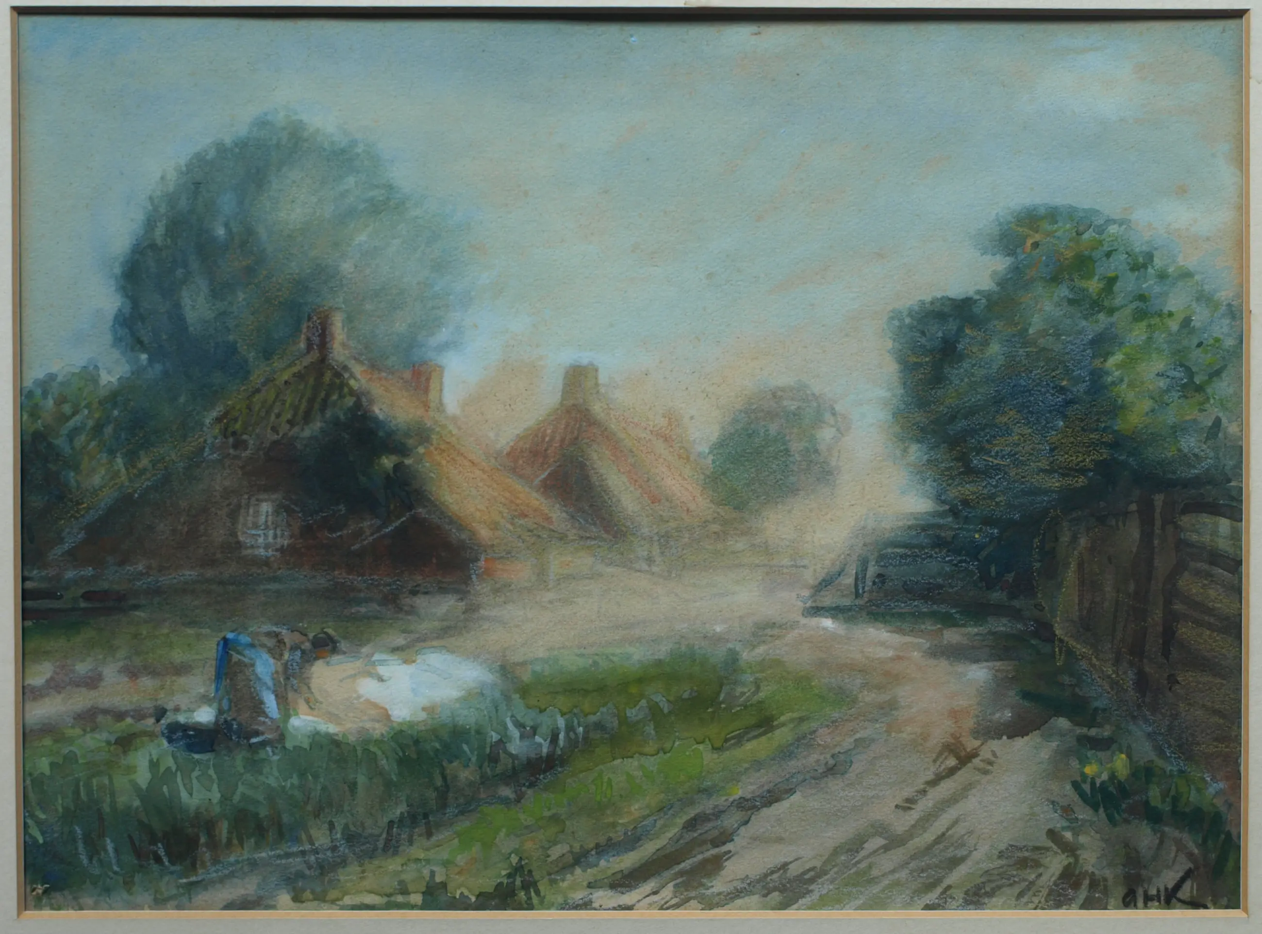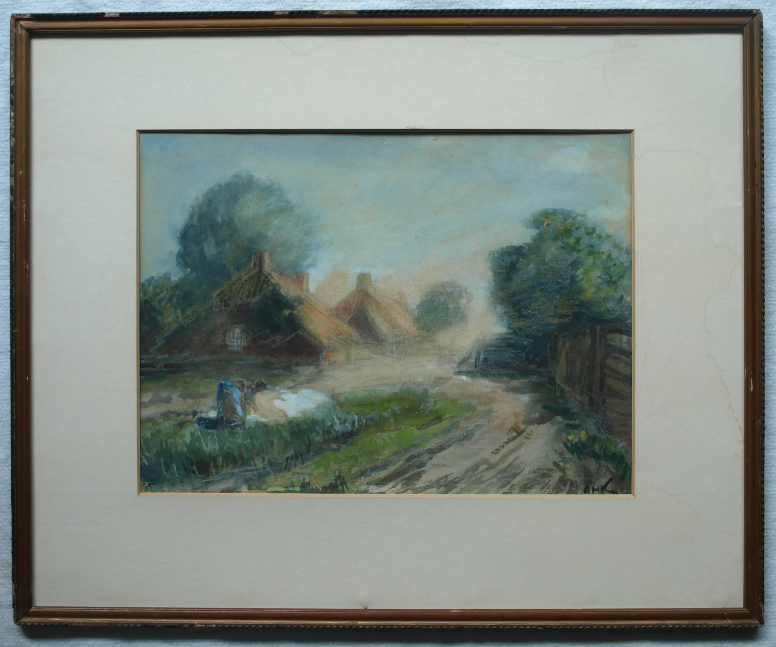 Een ingelijst werk van de Nederlandse kunstenaar Arnold Hendrik Koning (1860-1945). -Techniek: een combinatie van aquarel en oliepastelkrijt. -Gesigneerd rechtsonder met zijn initialen ‘A.H.K.’. -Ingelijst in een houten lijst met passe-partout (geen glasplaat meer). -Afmetingen: Lijst, 45 x 55 x 1 cm. Beeld, 26 x 35 cm. -Herkomst: Uit een inboedel. -Conditie: Het werk is in goede staat. Het passe-partout heeft vlekken. De houten lijst heeft slijtplekken en beschadigingen aan de sierrand. De glasplaat is verwijderd i.v.m. glasbreuk. Zie ook de foto’s voor een eigen indruk. Kan zo aan de muur.