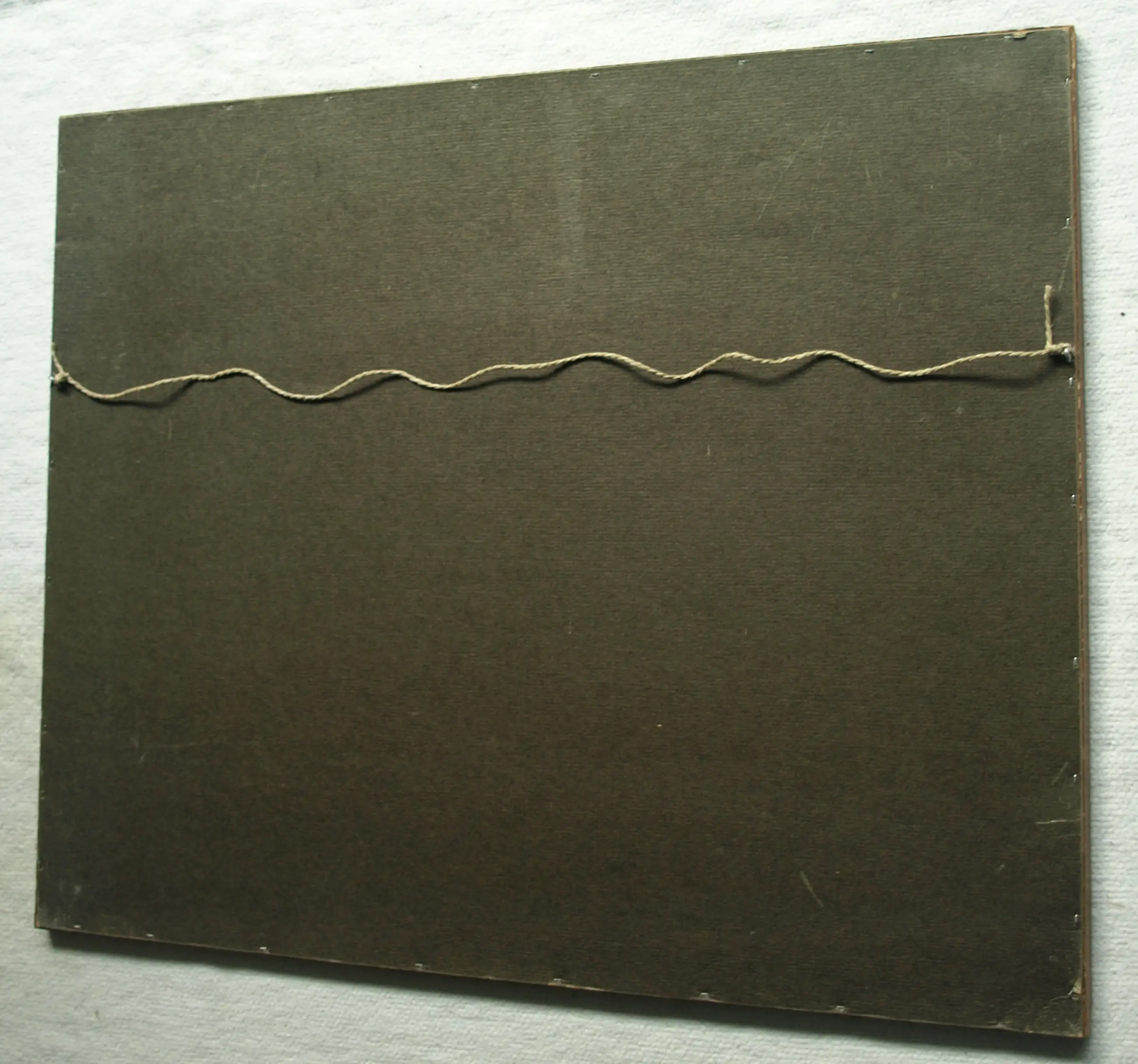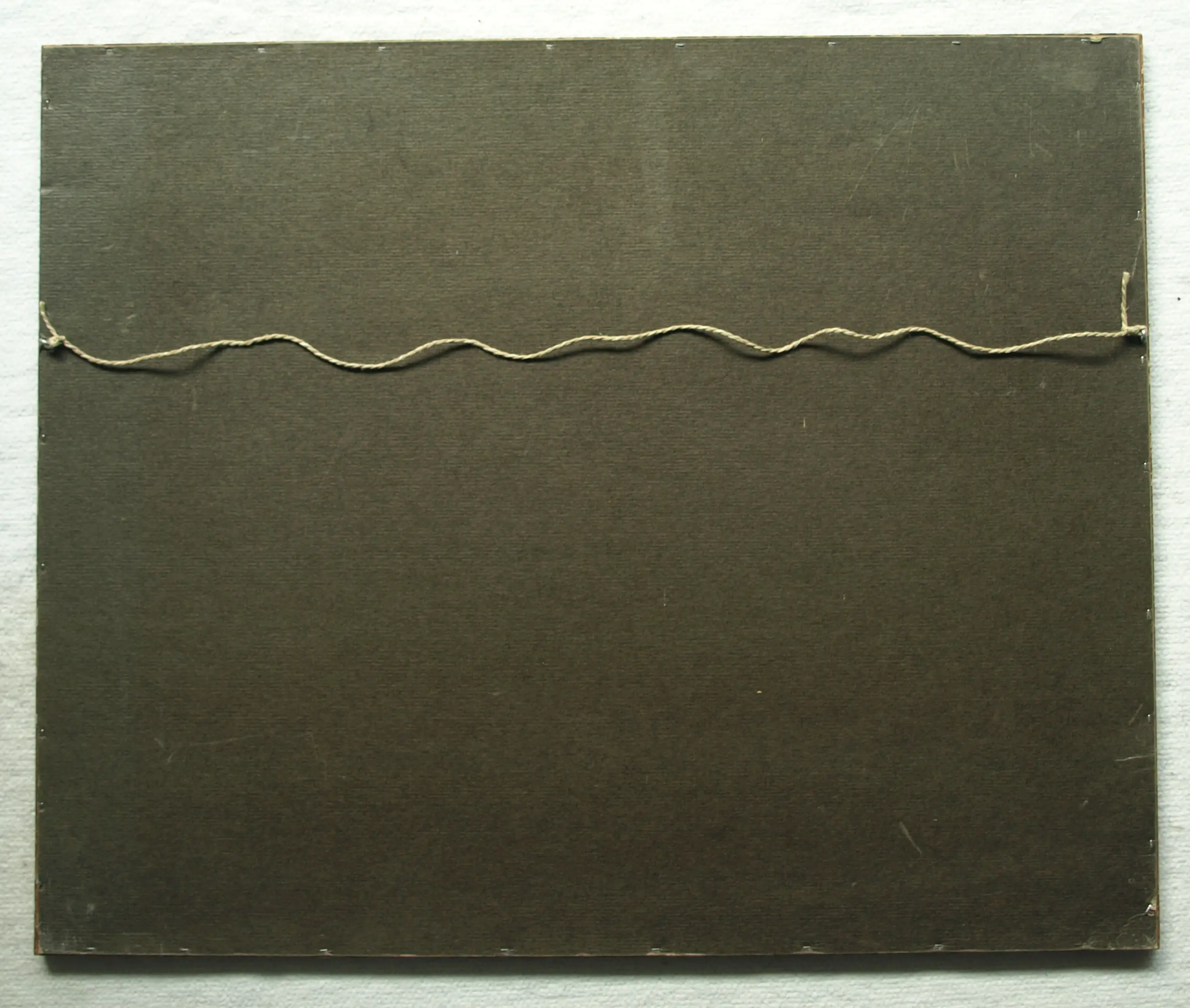 Het werk is in goede staat. Het passe-partout heeft vlekken. De houten lijst heeft slijtplekken en beschadigingen aan de sierrand. De glasplaat is verwijderd i.v.m. glasbreuk.