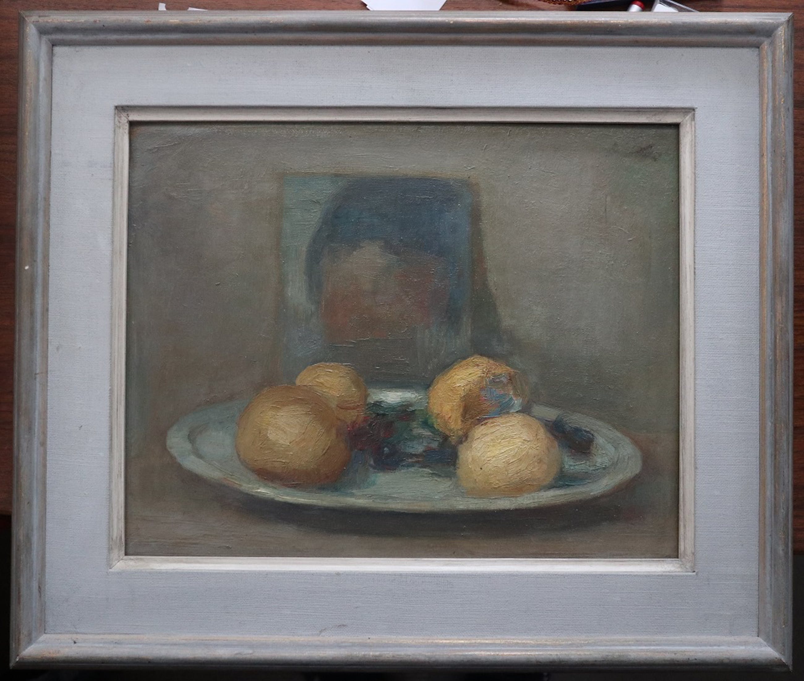 Mooi schilderij van Arnold Smith. Stilleven met fruit. Signatuur niet helemaal duidelijk, maar gegarandeerd authentiek. Aan de achterzijde beschreven met toenmalige adres van de kunstenaar. Voorzien van de originele lijst.
