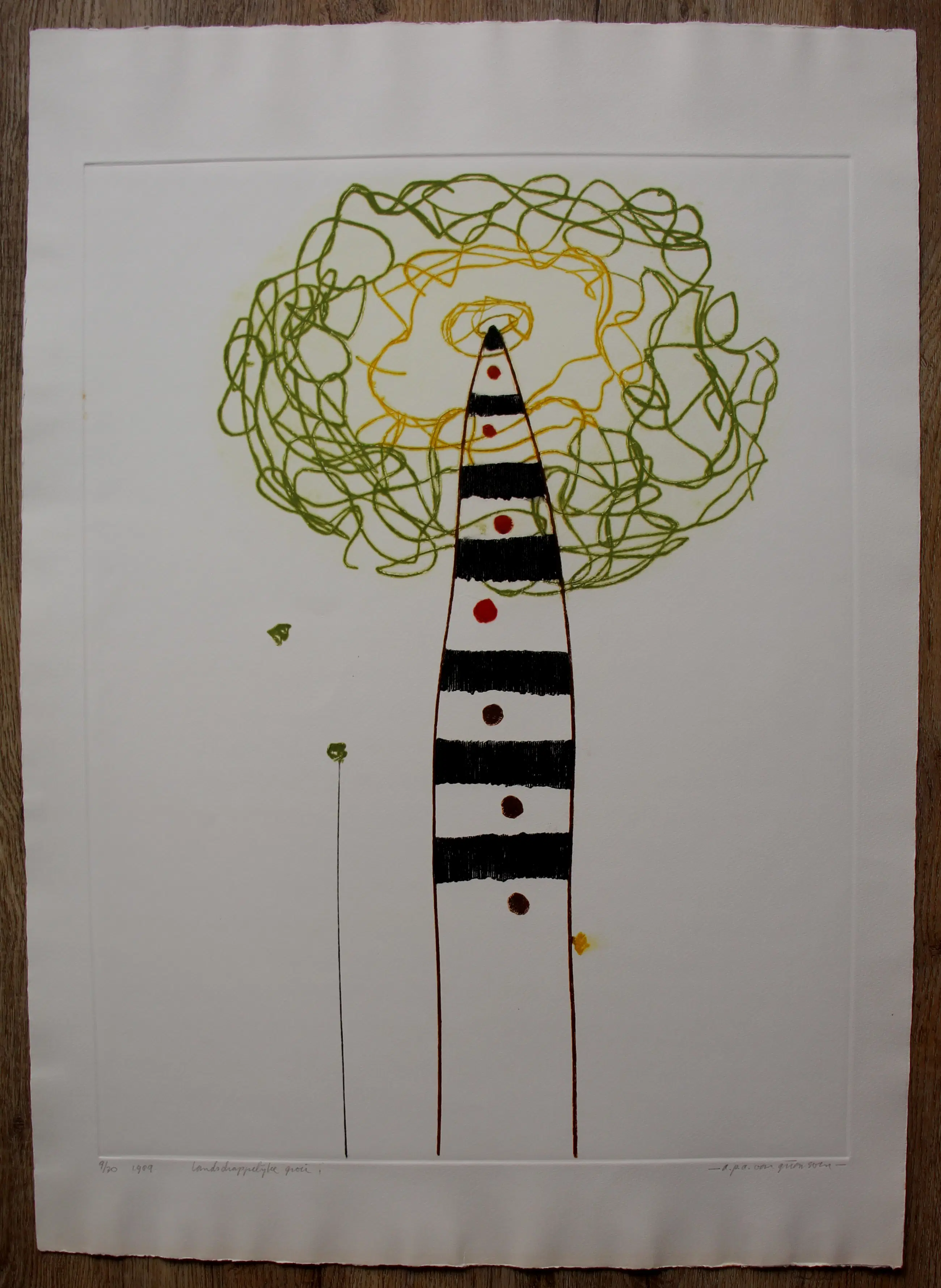 Ets van Arnold van Griensven. Titel: Landschappelijke groei. Jaar: 1989. Oplage: 9/30. Afmetingen blad: H78 x b56cm. Afmetingen voorstelling: H62.5 x b47cm. Het werk is rechts onder gesigneerd door de kunstenaar. De authenticiteit van het aangeboden werk wordt volledig gegarandeerd. Een certificaat van echtheid kan, op aanvraag, worden gemaild.